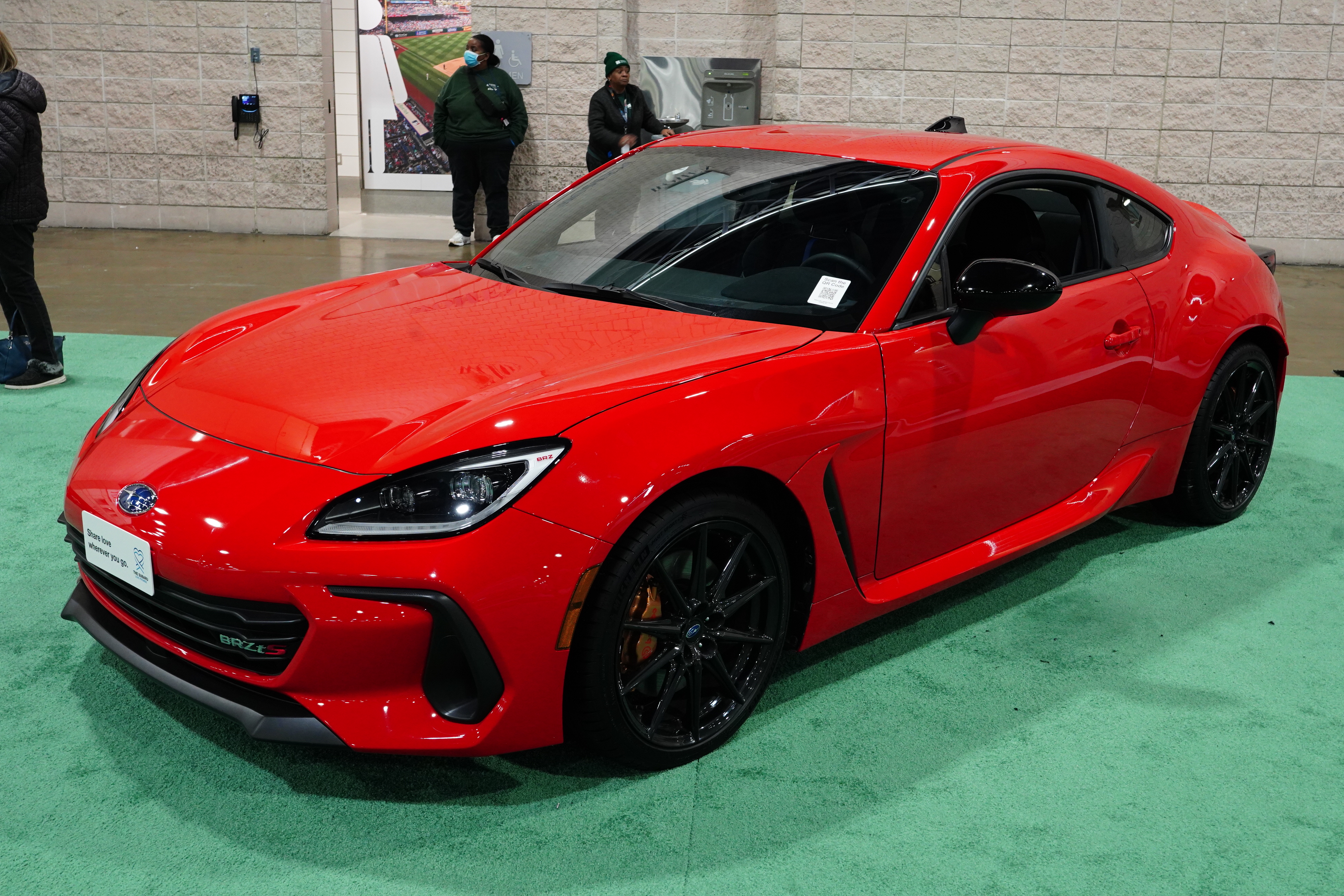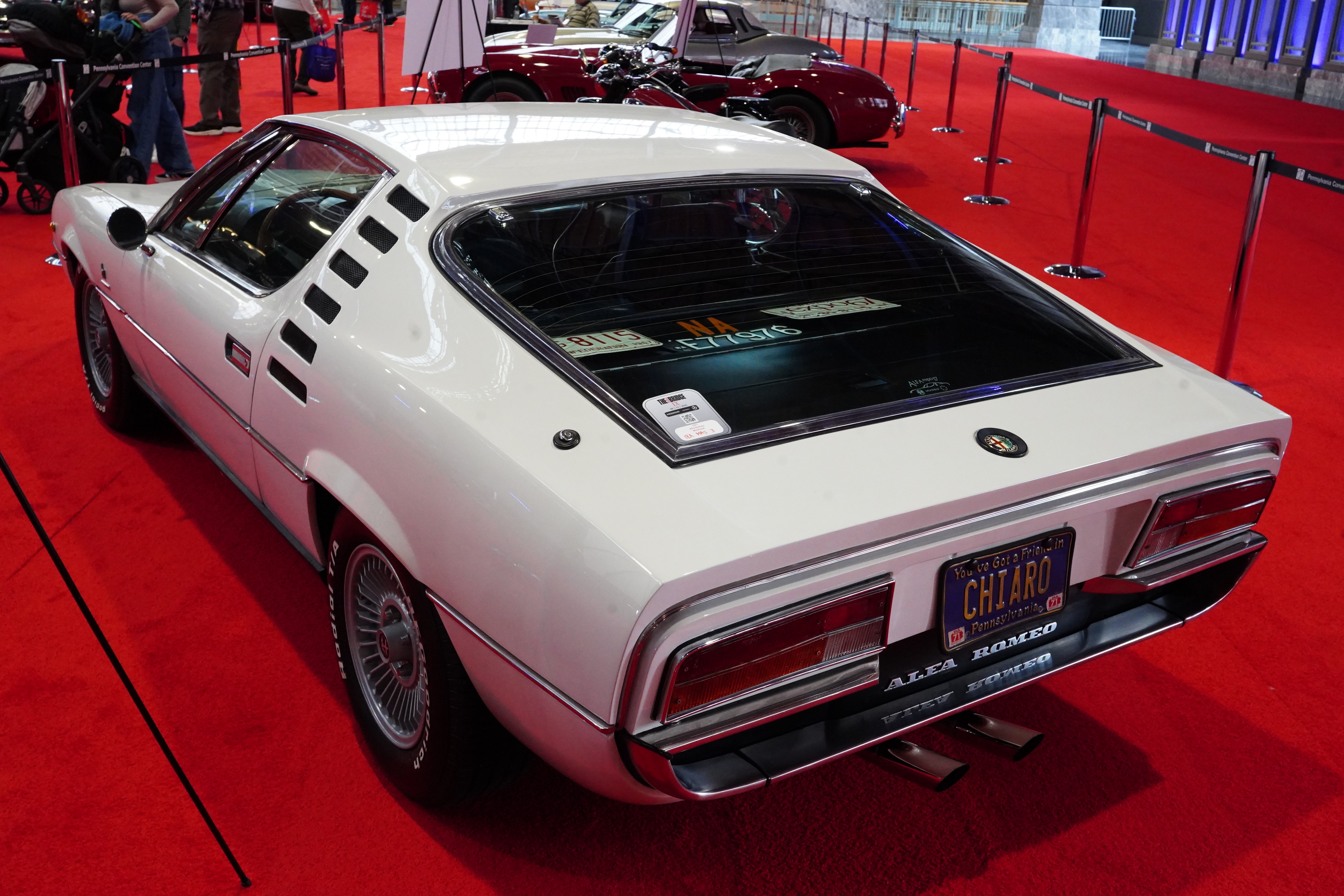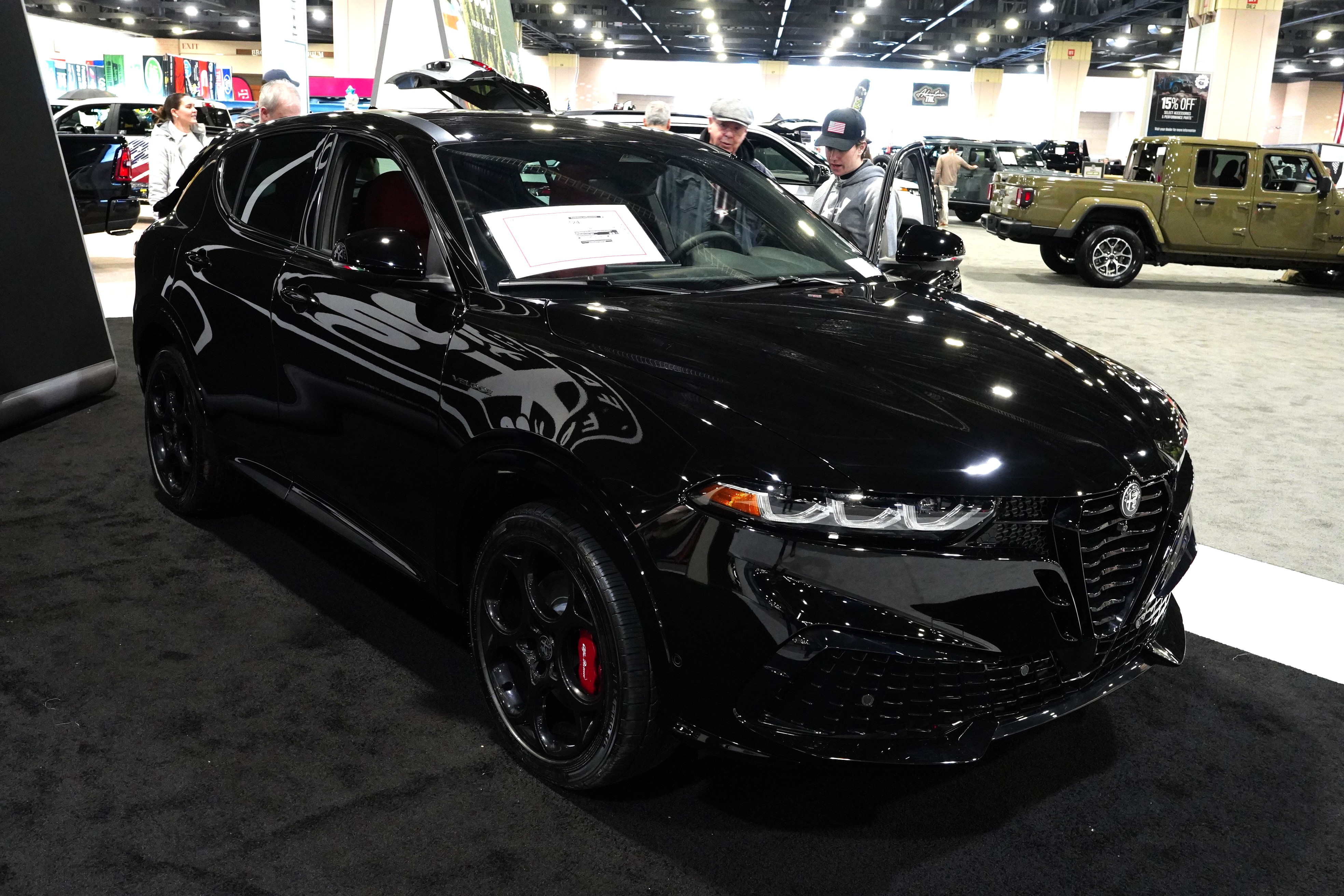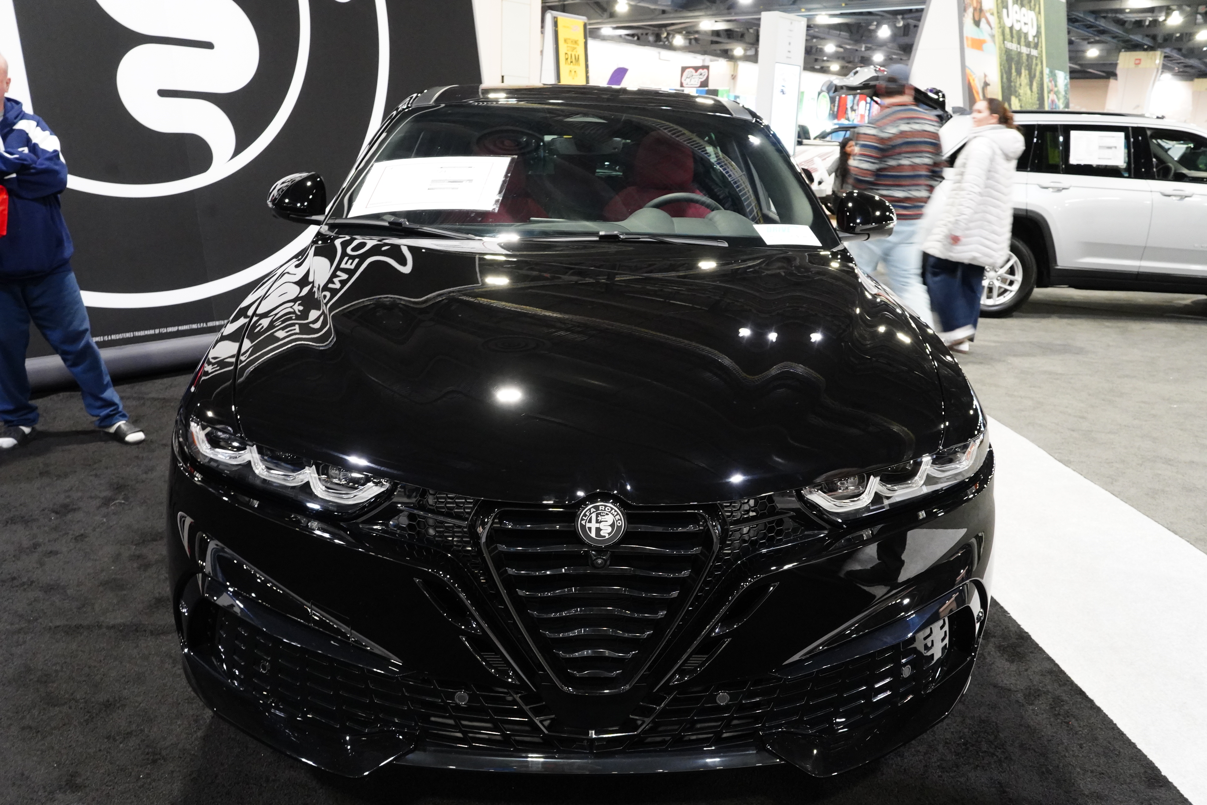 Situated among its Stellantis cousins was a Tonale SUV, the only Alfa at the show. (Alfa showrooms also include the Giulia sedan and the larger SUV, the Stelvio.) The black paint did it no favors, as I find black cars at indoor car shows to mute the styling (as well as being a challenge to photograph). Still, at least Alfa was here.