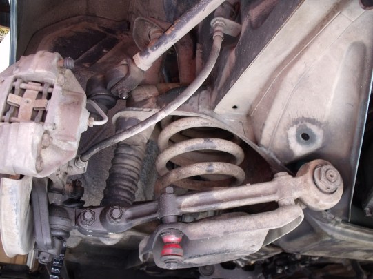 This shot, taken from the front, better shows the lower control arm. Note how both the lower ball joint and lower shock mount pass through the lower control arm. Also note the spring seat below the lower control arm.