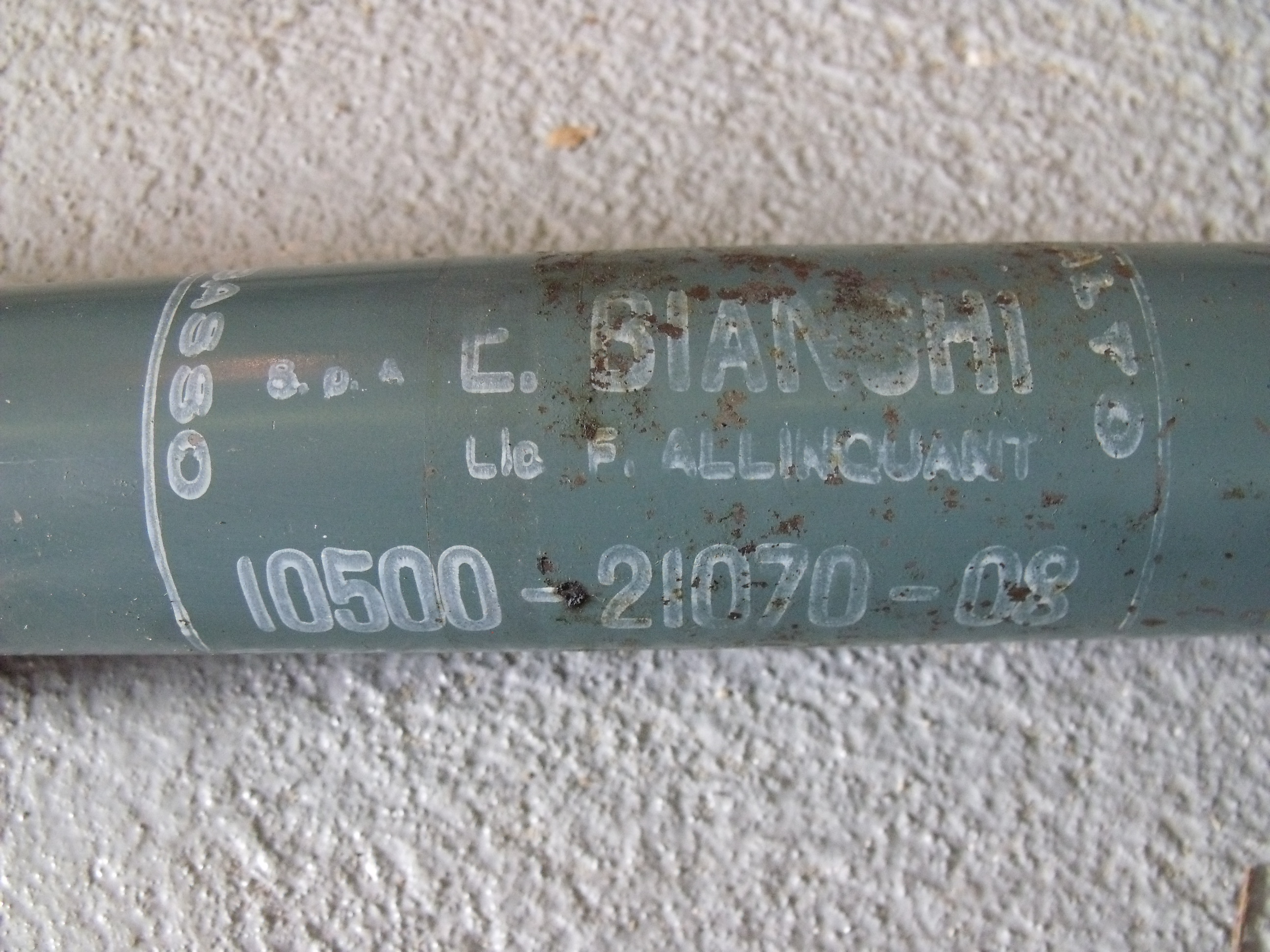 The right front shock off the car and on the ground. Note the brand name (Bianchi), and the words “basso” (bottom) and “alto” (top) to indicate correct shock positioning.