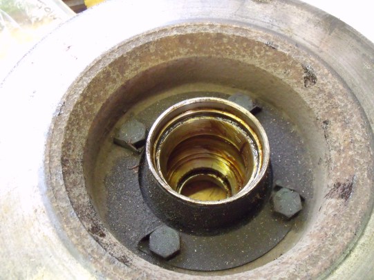 In this shot, I’ve actually removed the bearing and have cleaned out much of the grease, exposing the bearing race. Although the bearings look “OK”, I’ve decided to replace them because I don’t know how old they are.