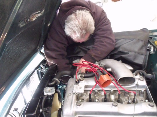 Mike wrenches on the upper control arm bolt from within the engine compartment. Clearance was tight; note that the distributor cap has been removed for better access.