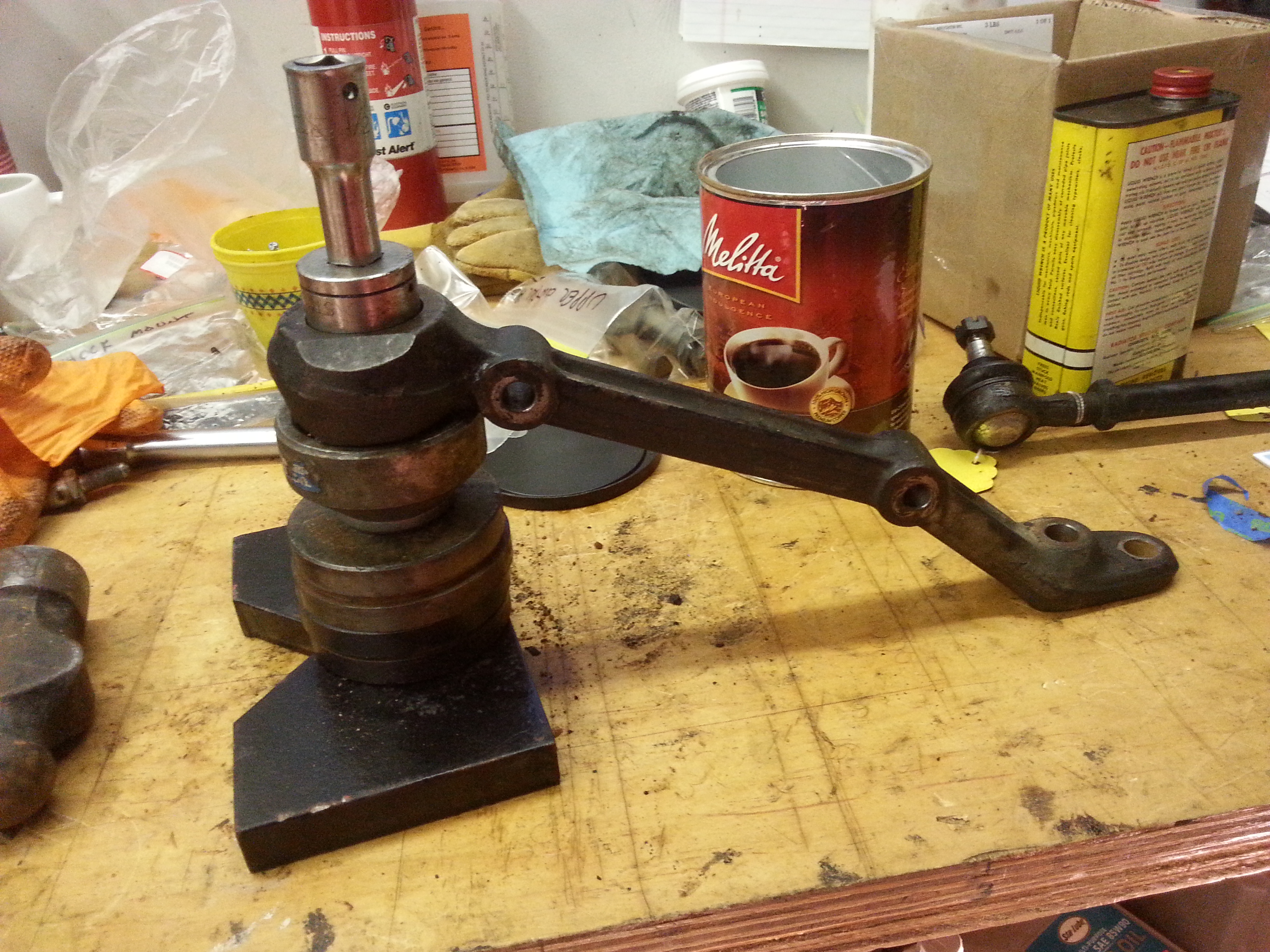 See the ball joints in the above right-side photo, each with 3 nuts threaded onto them? These are the old, to-be-discarded ball joints. By doing this, I can paint the nuts without getting paint on their threads, and have no worries about the threads on the ball joint. A large part of the fun this week was devising ways to suspend the parts for painting.