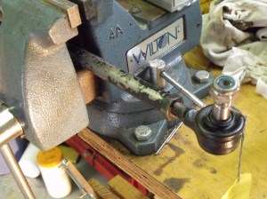 Although a vehicle’s steering system is, strictly speaking, separate from the suspension, the two are closely linked. Since I had both tie rod ends off anyway, I decided to replace all 6 steering ball joints. The Alfa uses a conventional recirculating-ball steering system, with a Pitman arm off the steering box, and an idler arm on the passenger side. The center drag link has a ball joint at each end, and so do both tie rod ends. Each of the 3 tubes has one right-hand-thread ball joint and one left-hand-thread ball joint. In this way, toe can be set, with each tie rod acting like a turnbuckle, either increasing or decreasing in length as it’s rotated.
