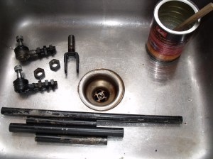 Now all the parts were ready for the grunt work. As I have no running water in the garage, and the garden hoses have yet to come out from winter slumber, the various components were washed in the kitchen sink. I did this in front of my spouse, and somehow got away with it. Perhaps she understands the sense of urgency under which I’m working. Here are the ‘before’ and ‘after’ cleaning shots of the spring seat, control arm cross bar, and steering linkage. BTW, Dawn brand dish detergent, a powerful degreaser, is one of the best solutions I’ve used to clean car parts.