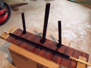 When it came time to paint the tubes, I decided that long wood screws could support the 3 shorter ones upright. The longest tube had a dowel passed through it, which was then attached to two scraps of wood. All the tubes could be spun while painted.