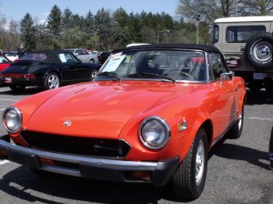 Lot #T199, 1977 Fiat 124 spider, orange, black top and interior. Mileage not noted. Quality repaint but overspray on windshield frame. No signs of rust. Front bumper crooked. Nice looking Fiat alloy wheels. Interior looks straight with no rips or tears. Lots of eyeball but would need to look at floors and underside to ensure solid metal was underneath.