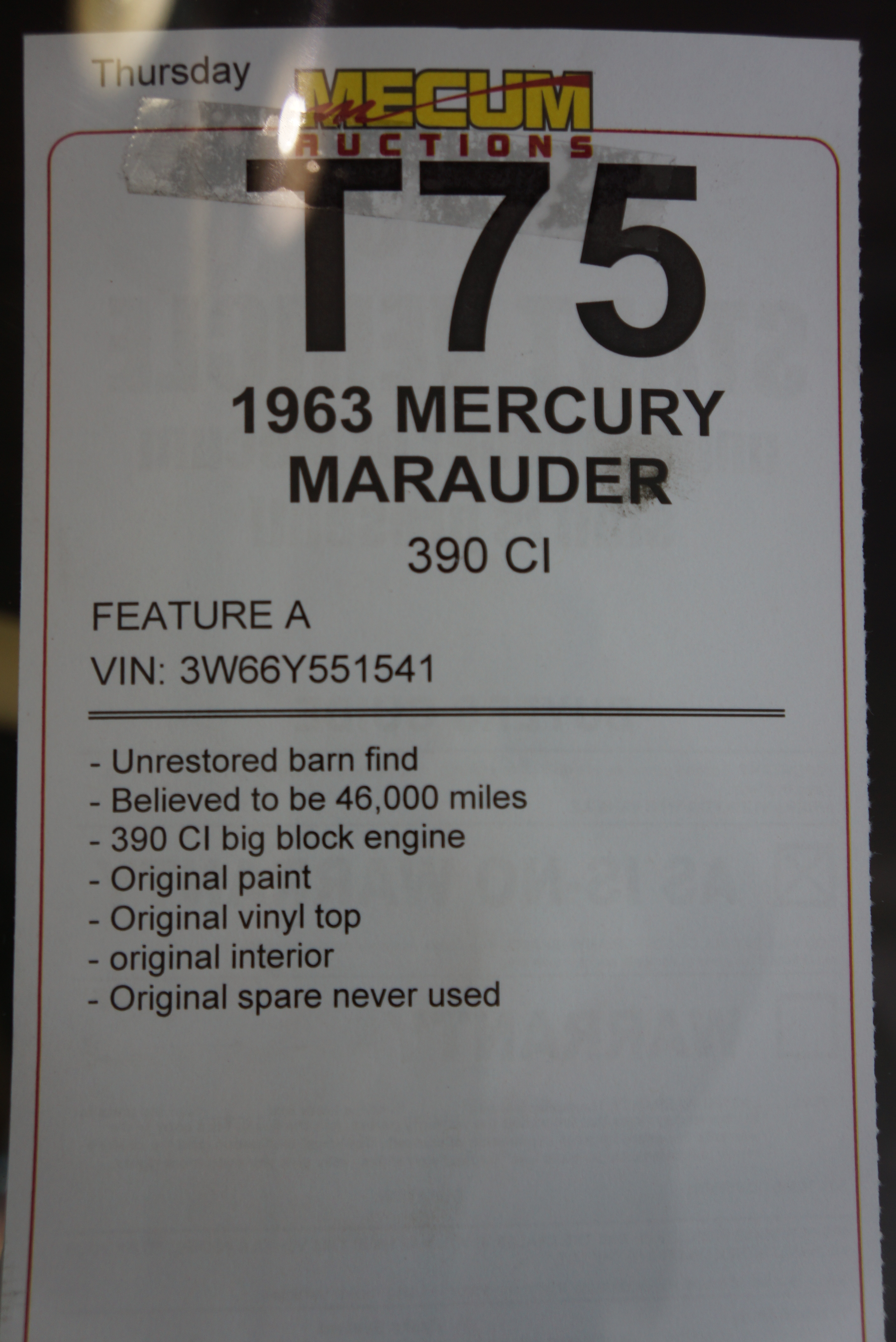 Like a light switch on at full brightness, then turned off, it was switched on again. I couldn’t tell you a thing about any of the cars that crossed the block ahead of us, whether they sold or not, and if they did, for what amount. My eyes were glued to that Merc, headed to a new destiny. The auctioneer’s voice was suddenly clear enough for me to understand every word: “Lot T75, 1963 Mercury Marauder, 45,000 original miles, unrestored barn find, one family since new, do I have 20,000, 20, 20, who will bid 20? Can I have 15, 15,000, anyone? 10,000, 10,000 for this Mercury? Do I have 5?” Finally, a bite. While I knew he would start high, there was a slight sinking feeling when I heard the opening bid drop all the way to 5,000. The auctioneer continued: “6,000, I have 6, 7,000, who will bid 7? 7, now 8,000?” And so on, as it quickly jumped to $10,000. “Eleven thousand dollars, who will bid 11? 11? 11?” Nothing. It stalled at 10,000. Larry, in the “batter’s box” as they call it, directly below the auctioneer’s podium, was getting pressure from the Mecum man to lower his reserve from $12,000. Larry would not. It was over. The car did not sell. It was 12:15 p.m.