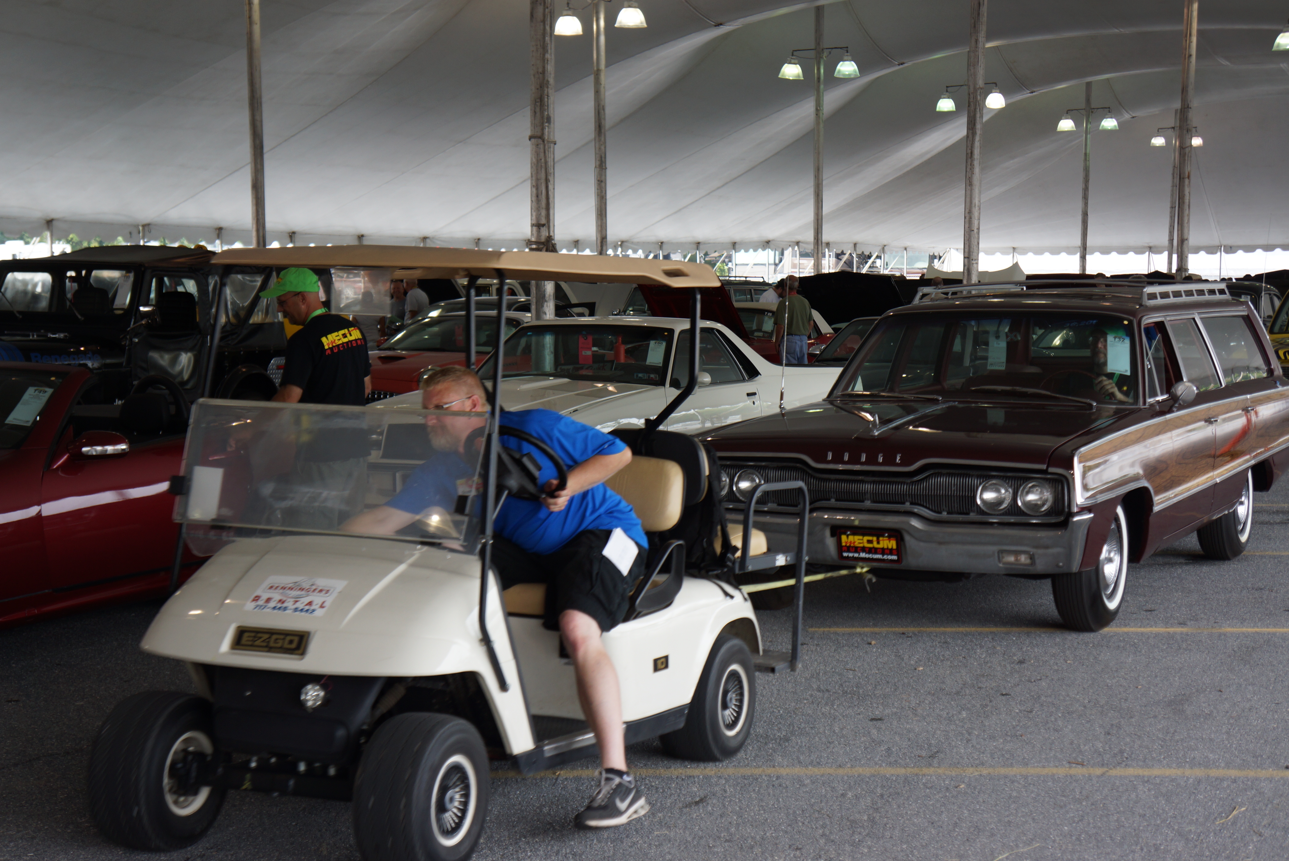 A few digressions: perhaps it’s me, but wouldn’t you think that if YOU had a classic car that you planned to sell at auction, YOU would make sure that the car would start at its appointed time? When I say “start”, I’m referring to “crank”, as in “have a charged battery in the car”! To my utter amazement, I saw not one, not two, but THREE cars ahead of us in the tent require the services of the jump-start cart in order to become motorvated (Chuck Berry’s word). In at least one of those cases, the jump attempt failed, and the good ol’ golf-cart-with-a-tow-rope was deployed. Once inside and on the smooth level ground, the white-gloved pushers move the car along with the engine off, and most of the bidding audience is never the wiser.