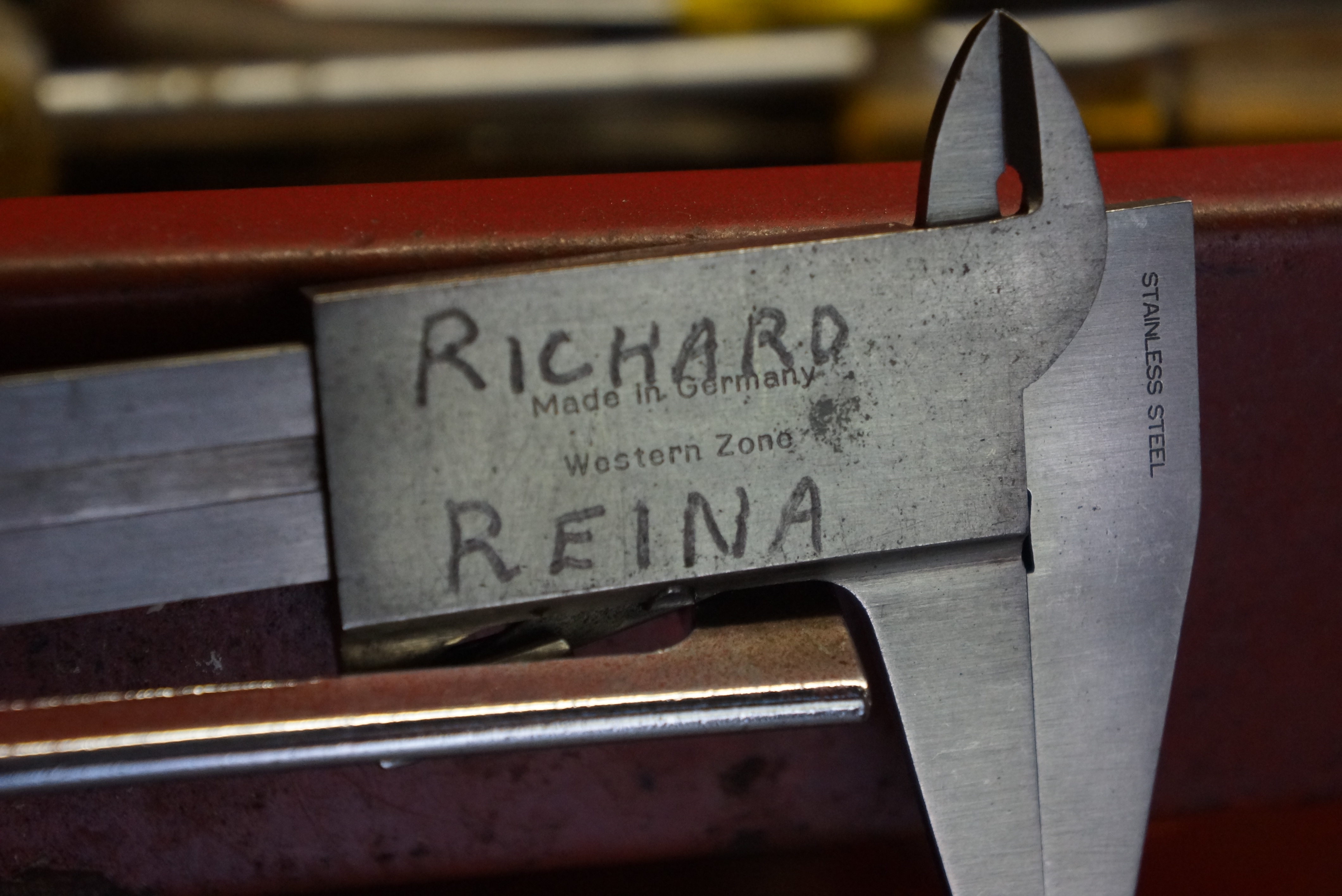On my calipers, of special note is the reverse stamp: “Made in Germany Western Zone”. That must date its production to the time immediately after the end of World War II. (Also note my father’s name engraved into the tool, as he did with almost everything he owned.)