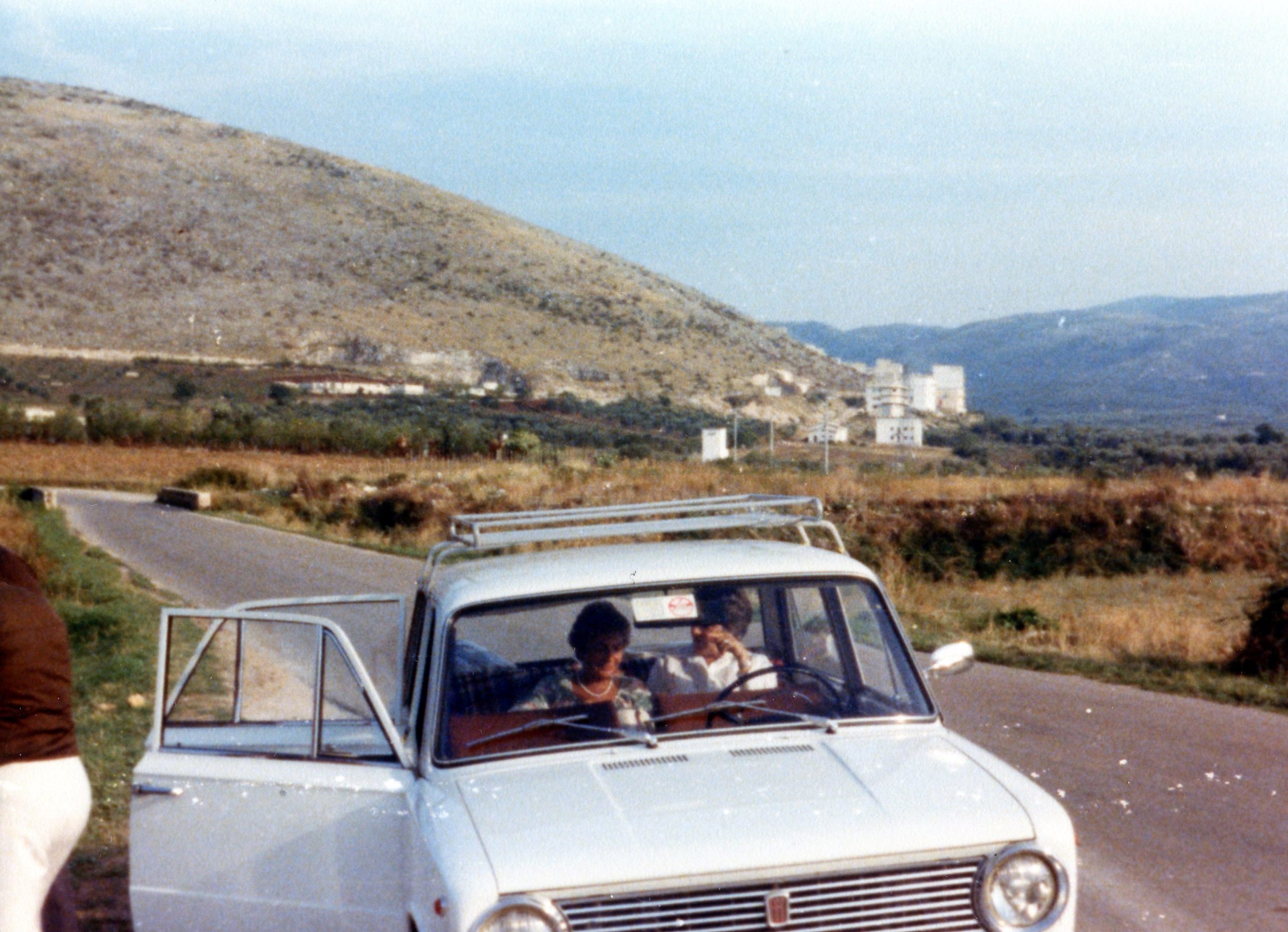 BELOW: This Fiat 124 sedan, owned by my mother’s cousin, was our transportation for 8 hours as we were driven to southern Italy. My mom and aunt patiently wait in the back seat for the herding to end.