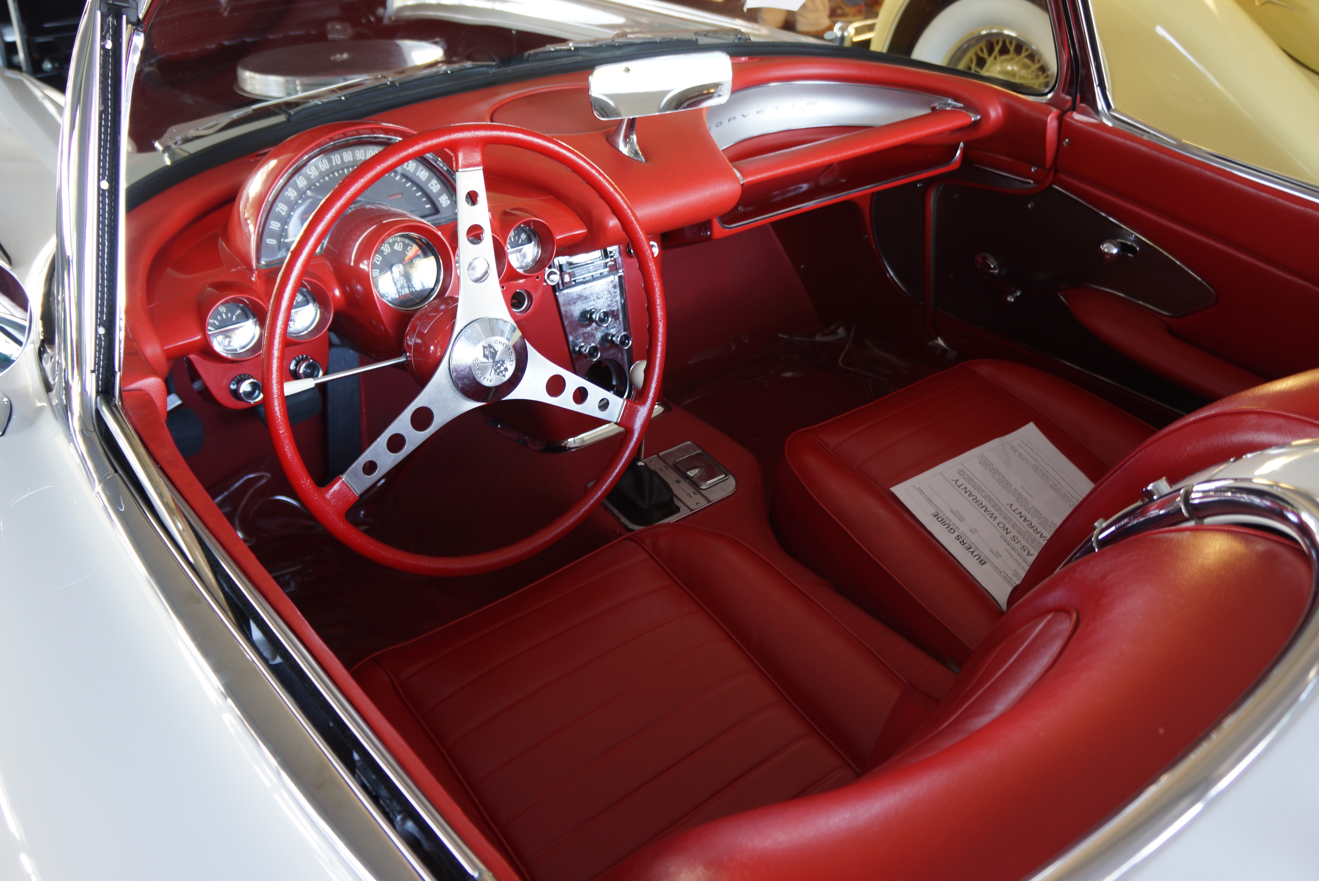 Lot #128, 1959 Chevrolet Corvette convertible, white, silver coves, red interior. 230-hp 283 V8, 4-barrel carb, 4-speed stick shift. Pre-sale estimate of $75-90,000