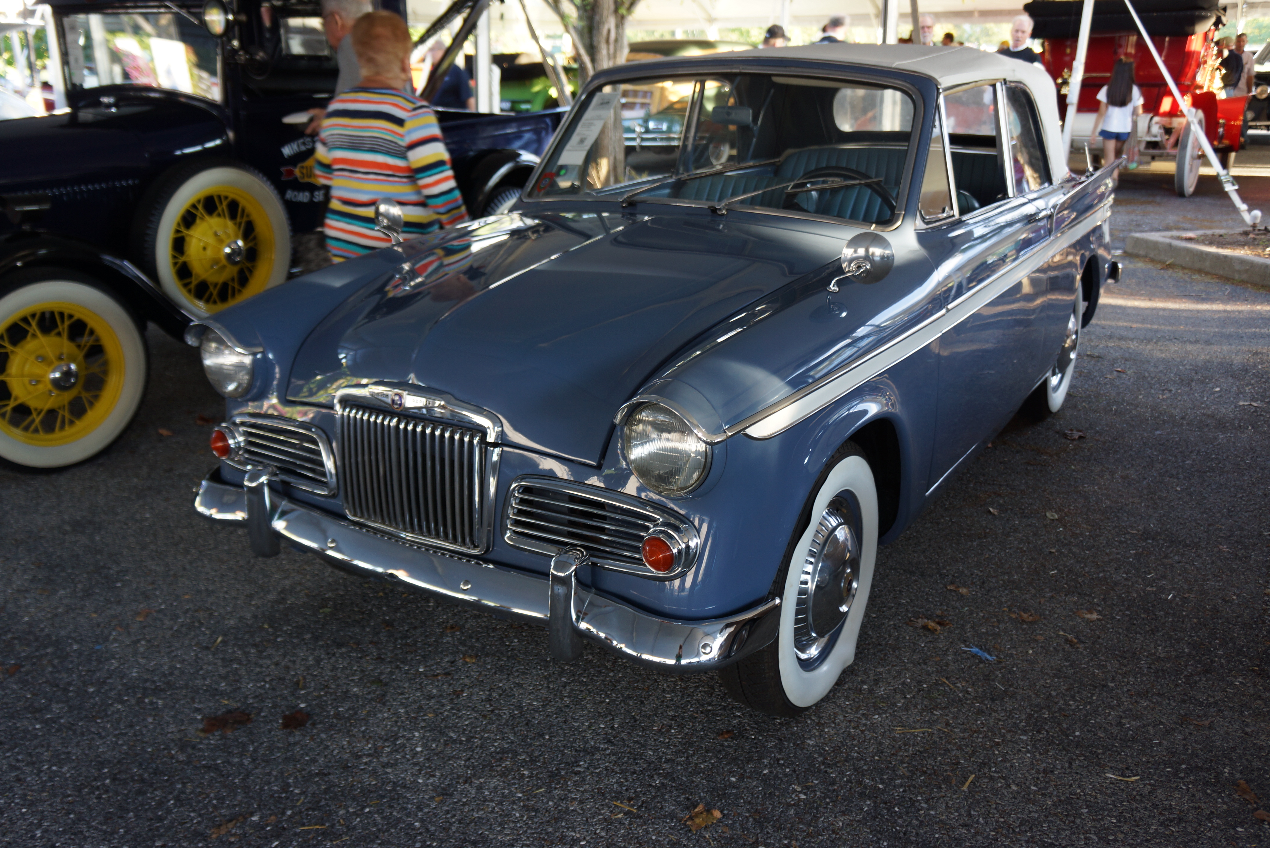 Lot #117, 1963 Sunbeam Rapier Series III convertible, medium blue, white stripe and top, blue interior. Four-cylinder engine, 4-speed stick on the floor. Pre-sale estimate of $20-25,000.
