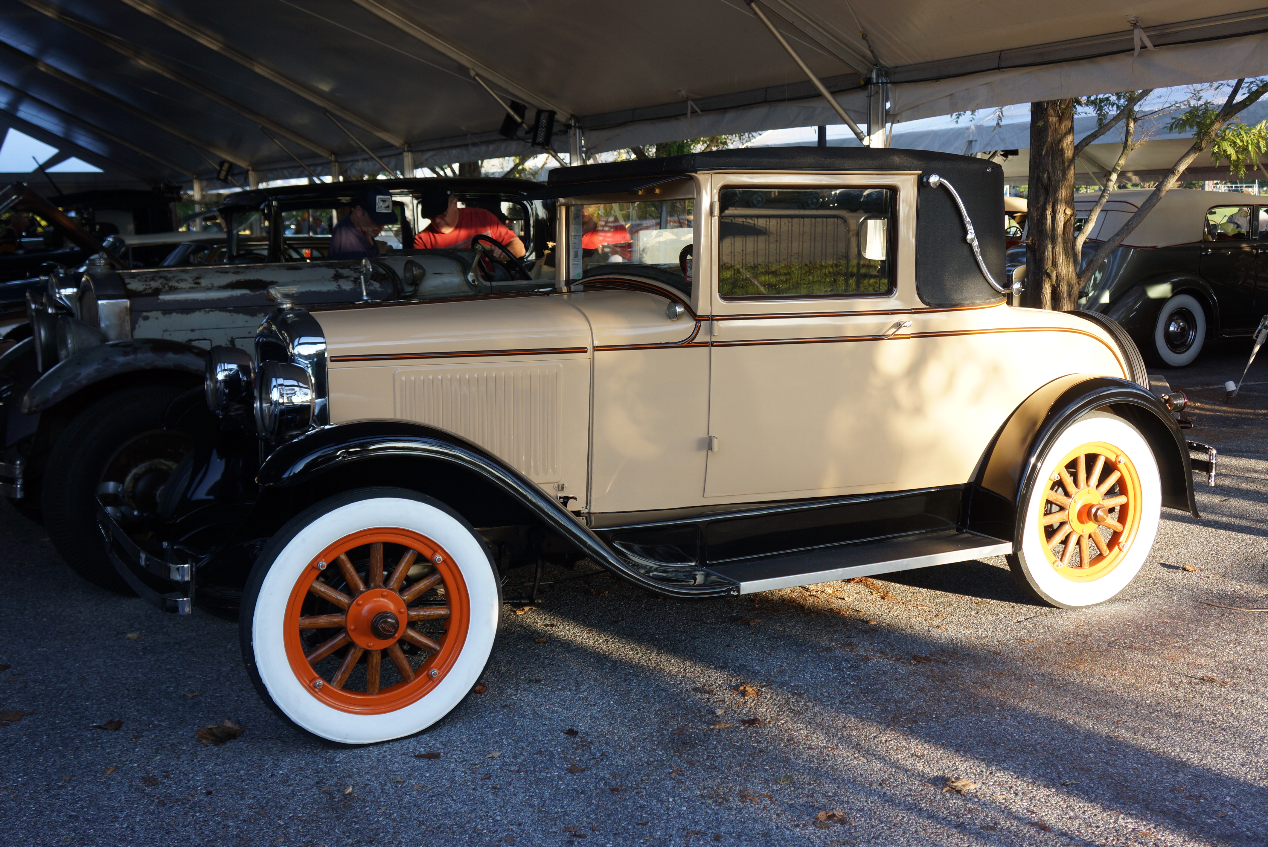 Lot #113, 1928 Pontiac 2-door coupe, tan body, black running boards and fenders, orange wood wheels. Six-cylinder engine, 3-speed manual transmission. Pre-sale estimate of $18-25,000