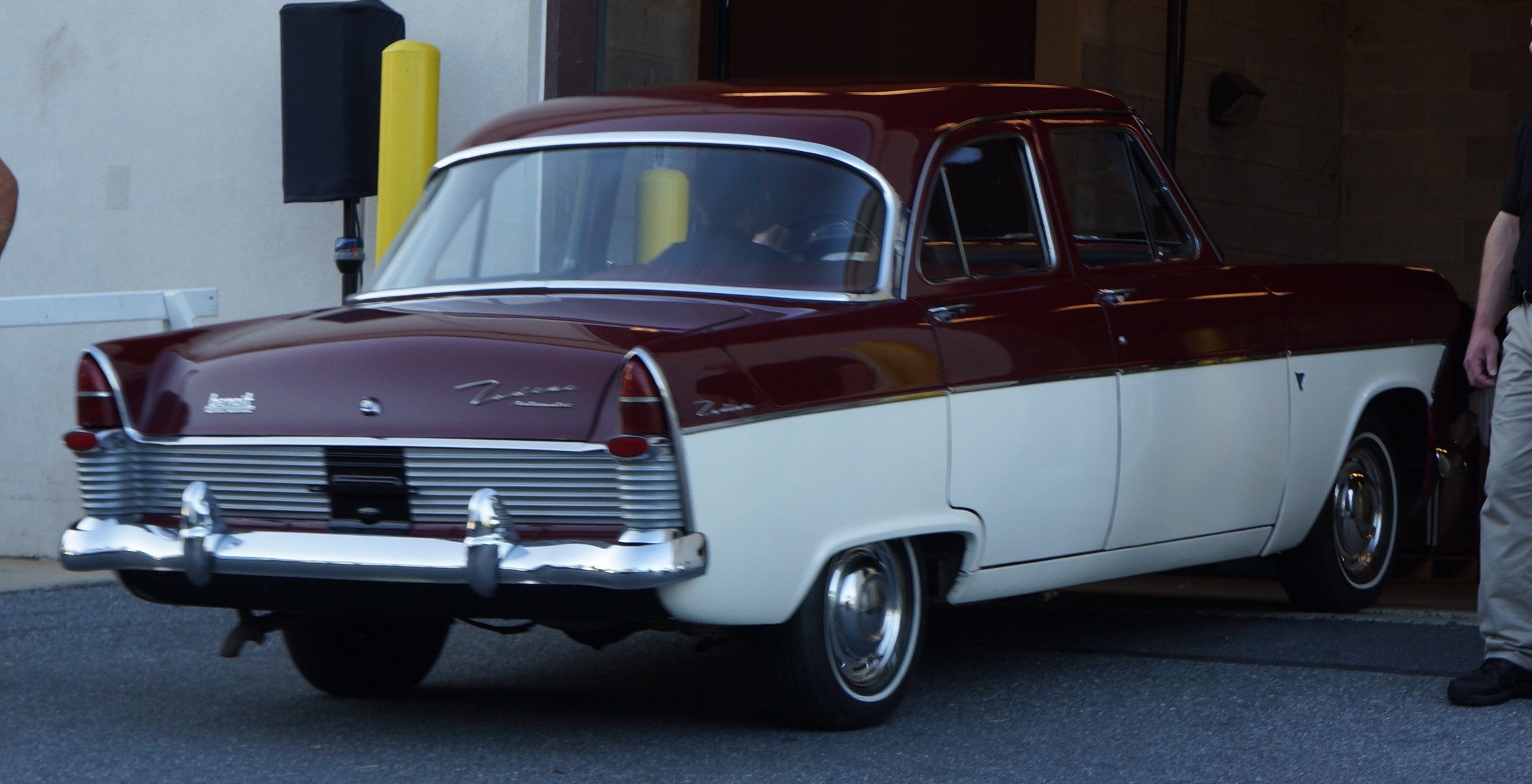 Lot #111, 1960 Ford Zodiac Mk II Saloon, 4-door sedan, red & white, red interior. Six-cylinder engine with automatic transmission. Pre-sale estimate of $10-15,000.