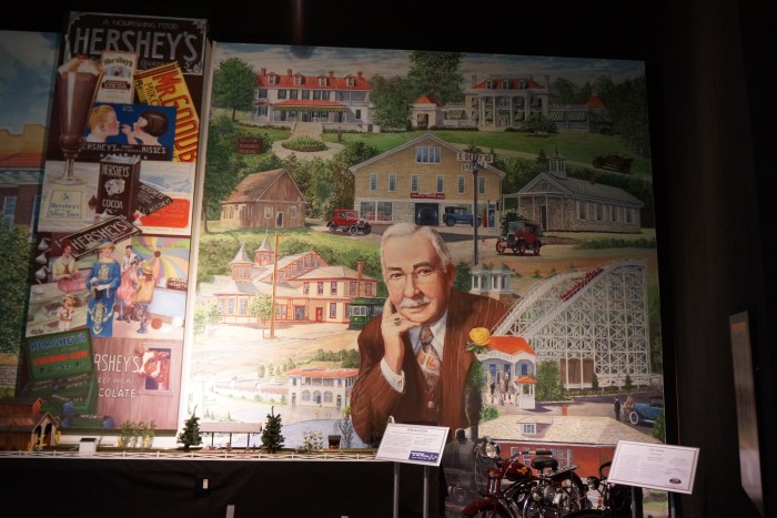 A wall mural pays tribute to Milton Hershey, whose businesses still dominate his namesake town