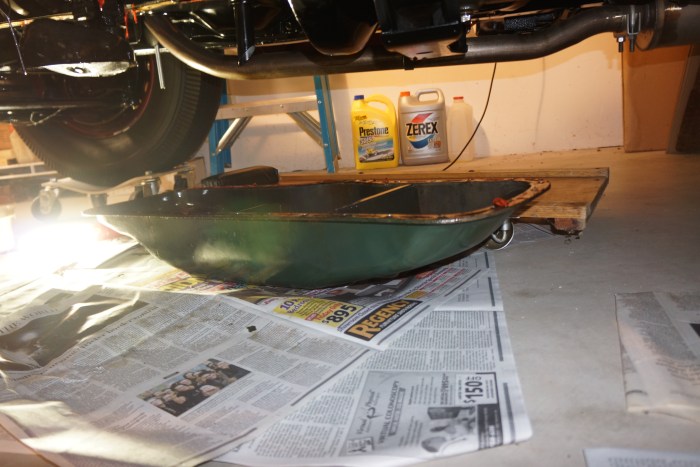 The oil was already drained, and drop light, creeper, and tools were waiting for me to get under the car and get to work.