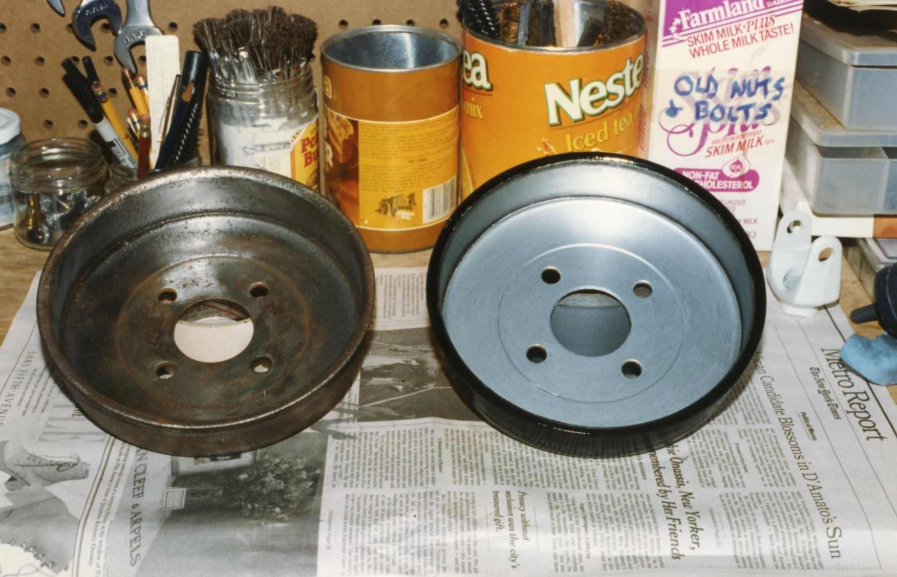 The brake rebuild process was not without its challenge. All the wheel cylinders were frozen solid, and dislodging the pistons meant days of soaking in coffee cans full of Liquid Wrench. Even then, the pistons were still removed via destruction. The cylinders themselves were salvageable, and pistons and shoes were available from several of my local suppliers.