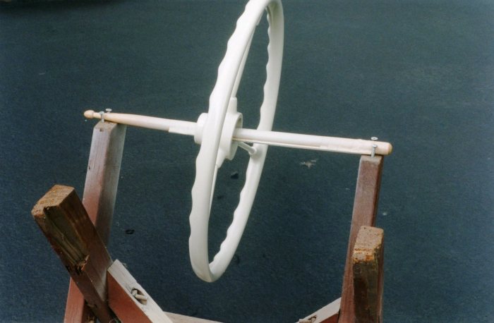 The steering wheel was hand-sanded to remove all traces of existing paint, then given a good cleaning. With the rattle can, the intention was to apply multiple coats as lightly as possible. If I could get the wheel to rotate while spraying it, there would be no chance of runs. Using an old piece of outdoor furniture and a drumstick, I mounted the wheel so that I could spin it and spray it. It probably got four or five coats of paint this way, and to me it looked as good as new.