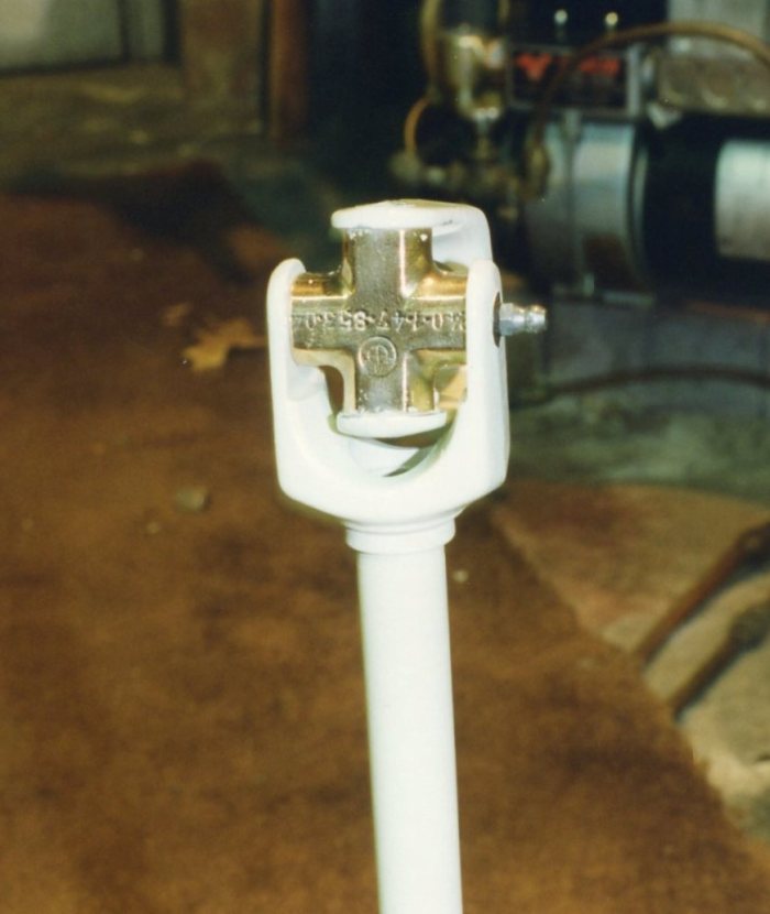 I was unsure if the steering column from the factory was painted silver or the same off-white as the steering wheel. In the end, I decided that the almond color would look better, so that‘s what it got. The u-joint at the bottom of the column was made of brass, and it polished up so brightly that it would have been a shame to paint it, so I didn’t. Instead, I sprayed it with a clear lacquer for protection.