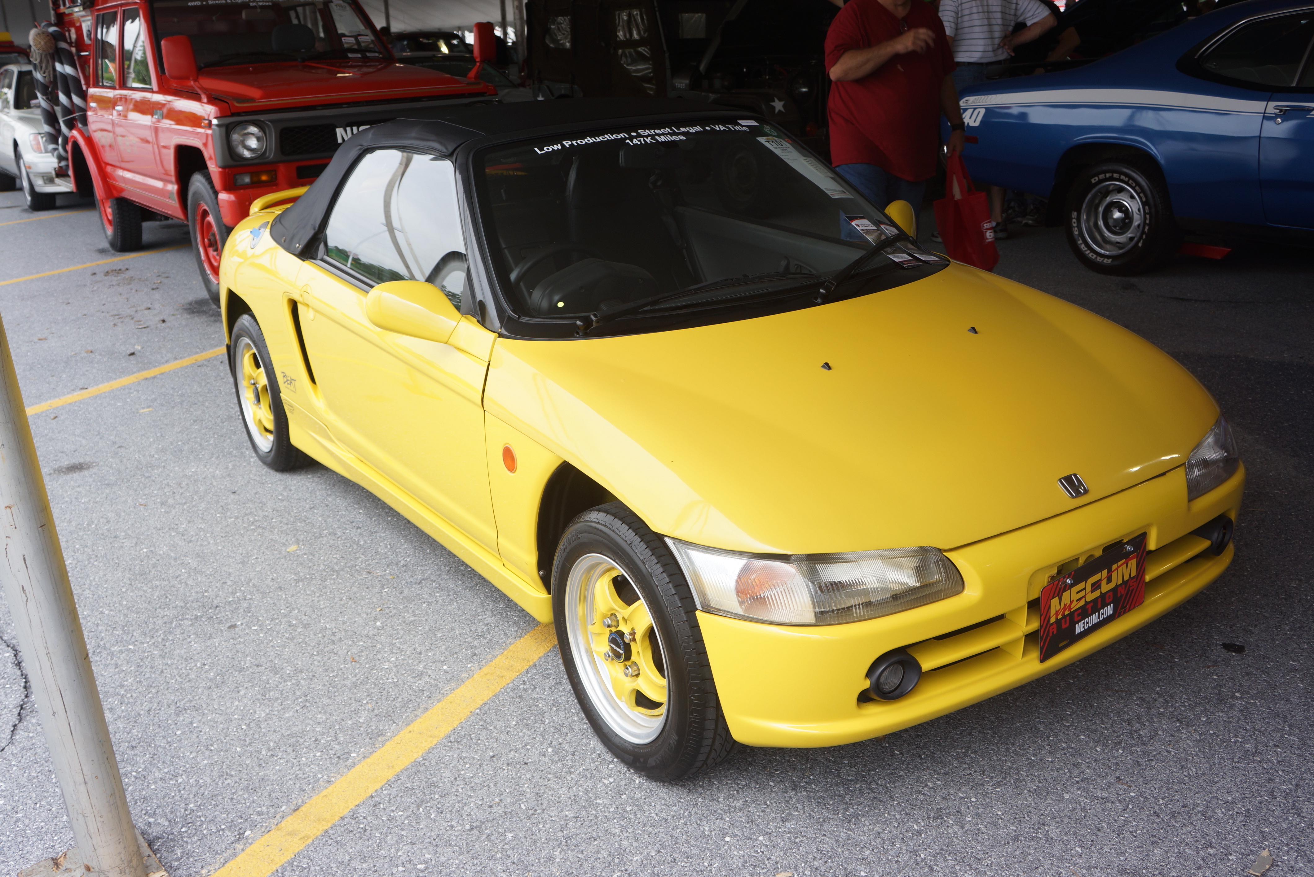 Japanese “kei class” car, never officially sold in U.S., now over 25 years old, so legal for import. Three-cylinder mid-mounted engine, 5-speed manual. Yellow, black convertible top and interior. From my research, all Beats had zebra-stripe seat upholstery and floor mats, both missing here. High miles (147,000 MILES, per sticker). Overall look is somewhat worn, with rust bubble on rear decklid. Cute, unique, but you might have wanted to hold out for a better example.