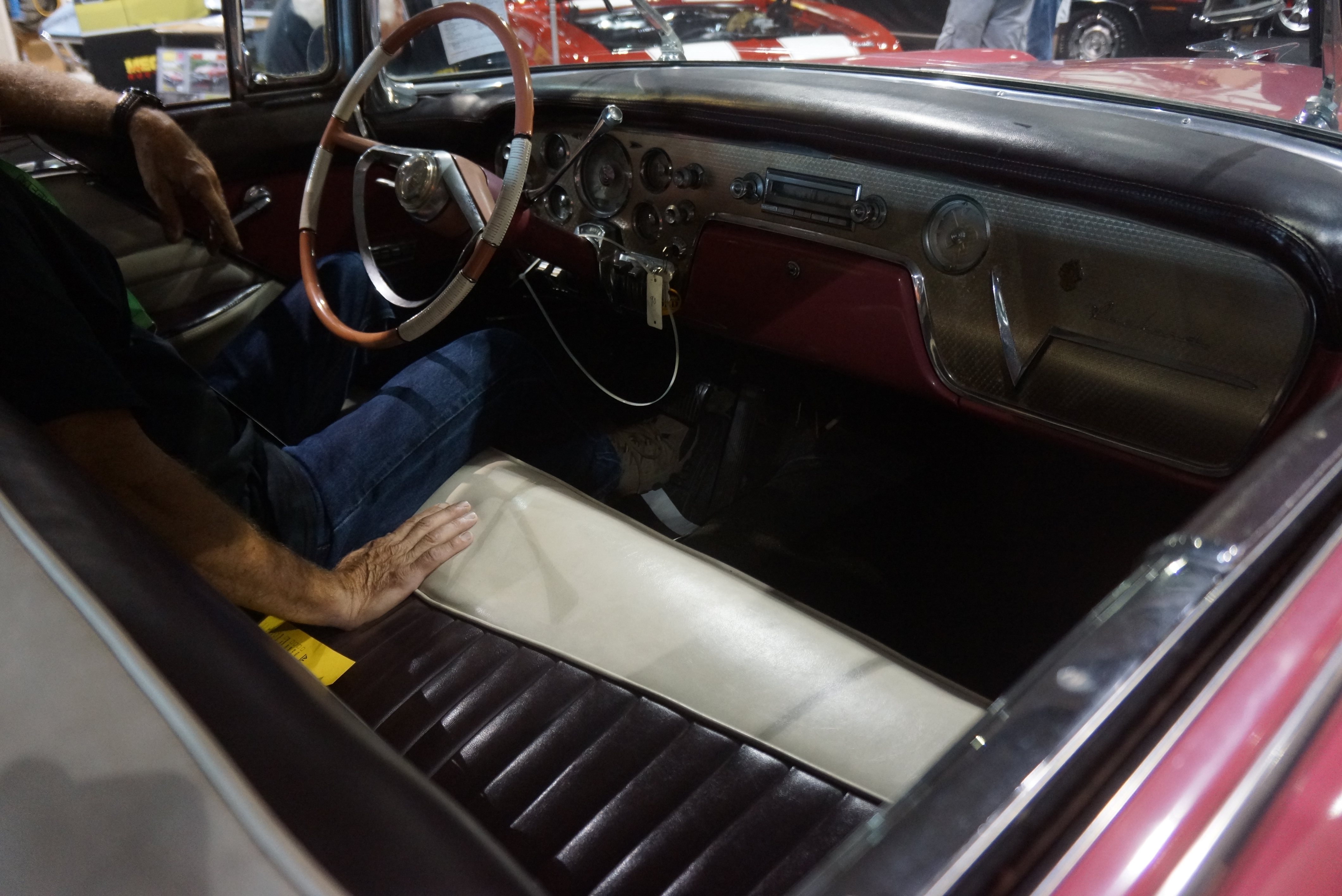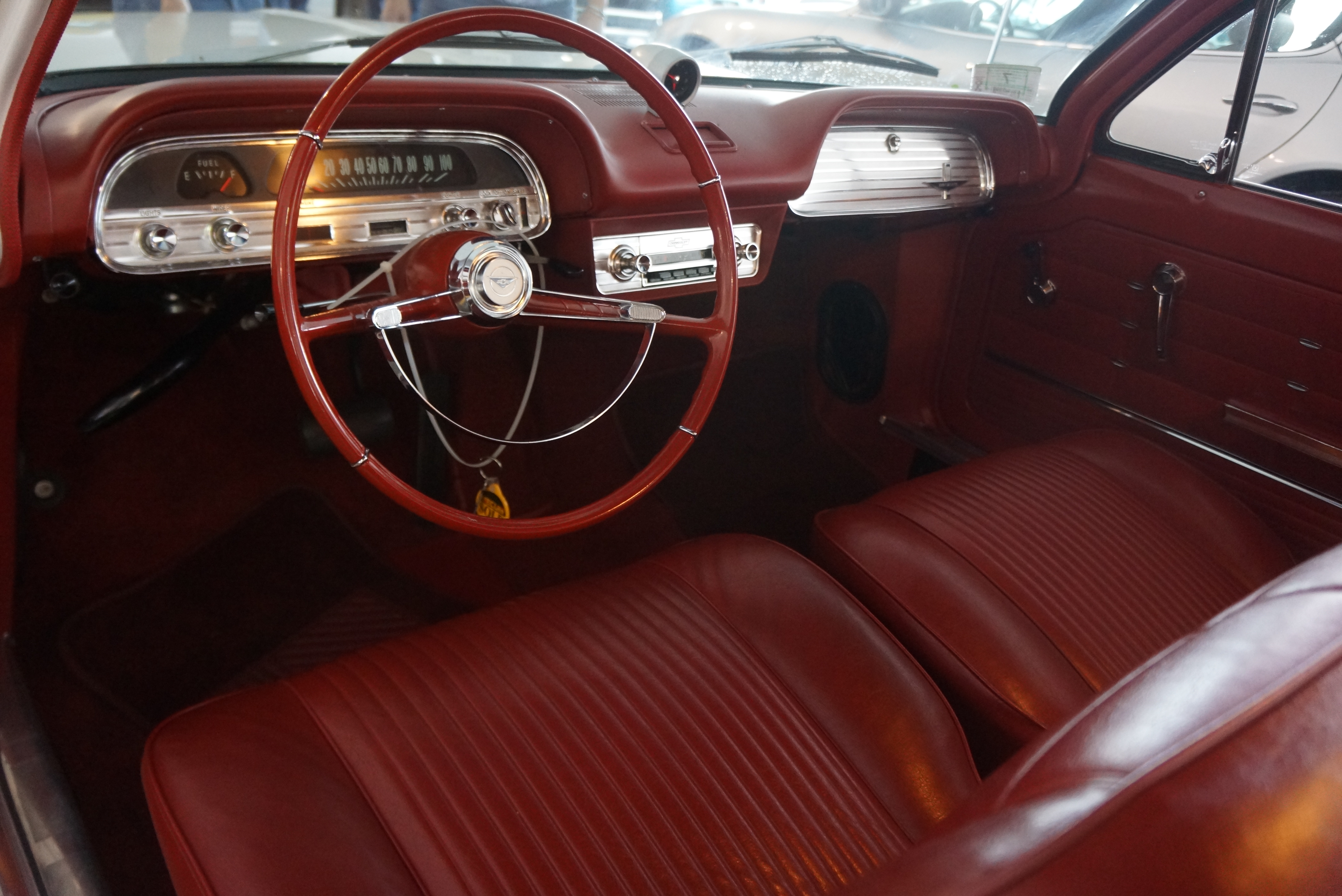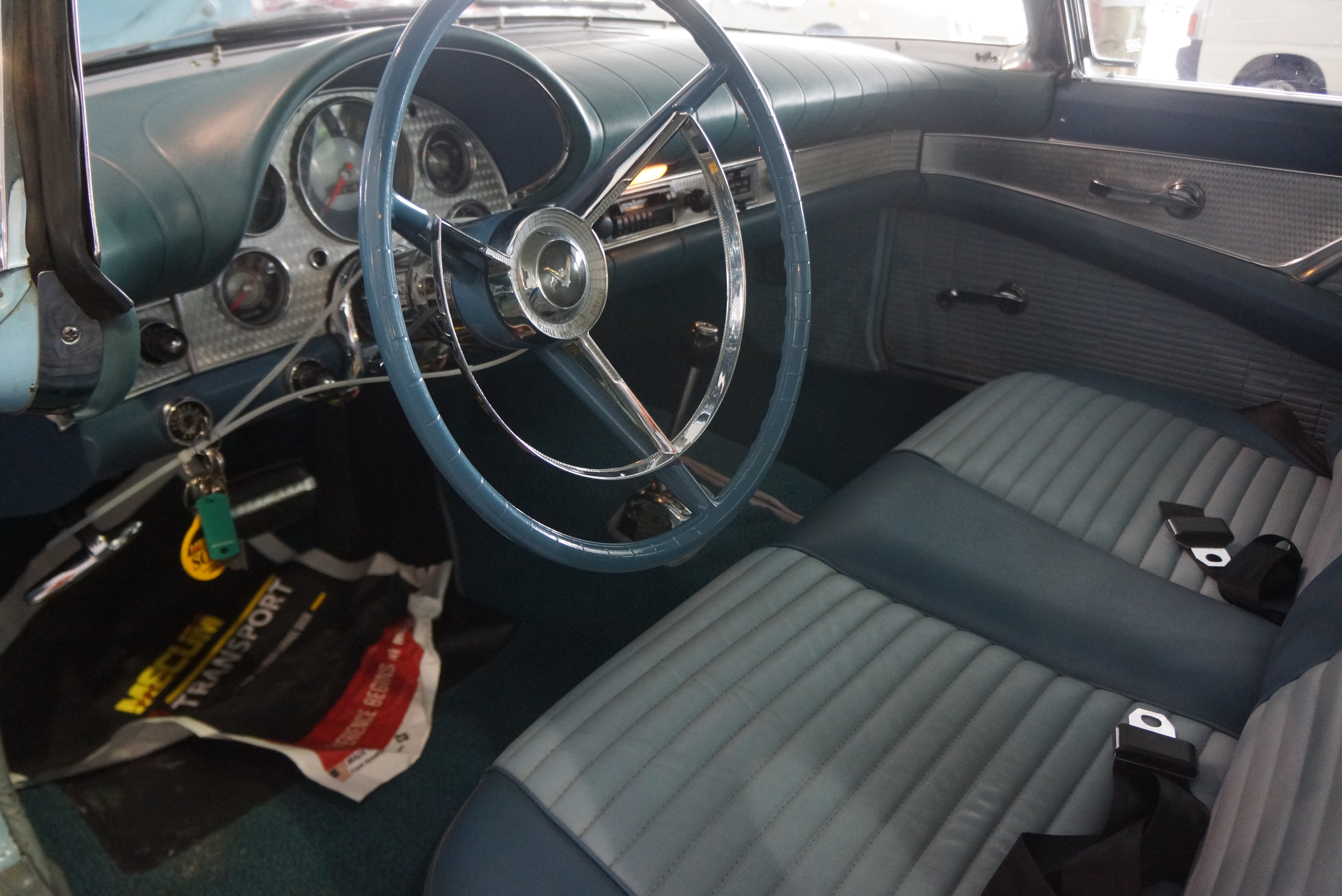 At first glance, this one looked nice: Fiesta red (almost flamingo) with red & white interior, decent engine compartment with dress-up kit, and both tops. But looking past the ’56-only Continental kit (making it my least-favorite of the ’55-’57 Birds), the paint was simply shot. There would be little choice but to expend for a complete strip and respray. This one was expensive, especially compared to the ’57 covered above.