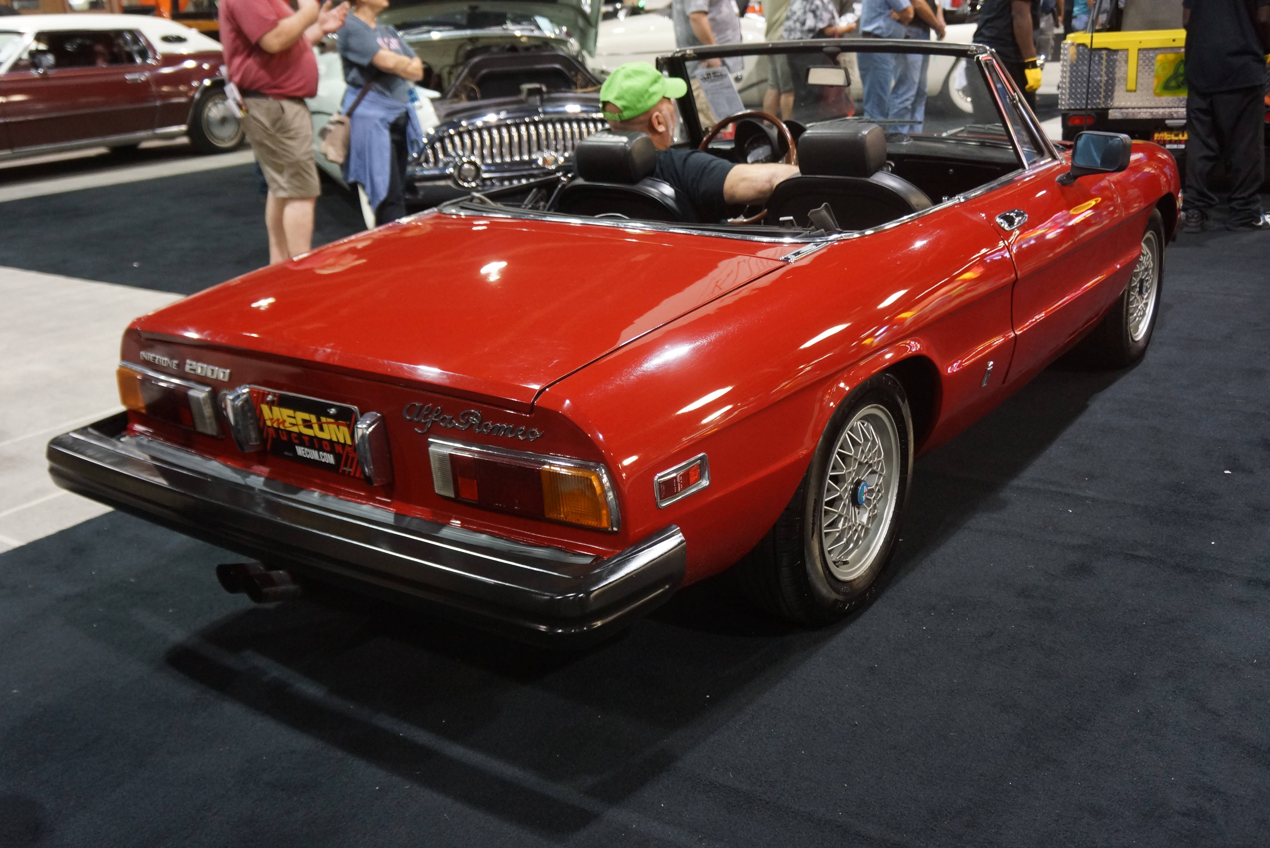 Red, black top, black interior redone in leather. Aftermarket lace style wheels looked good. Paint faded and swirled. Sliding my hand along passenger side rocker panel revealed ability to insert fingers into rust holes. This is a Series 2 spider, with Kamm tail, big bumpers, and Spica fuel injection. Alfa spiders have been climbing in value in recent years. Given the rust, the best bet here is to drive and enjoy. Any attempt at restoration will put you underwater.