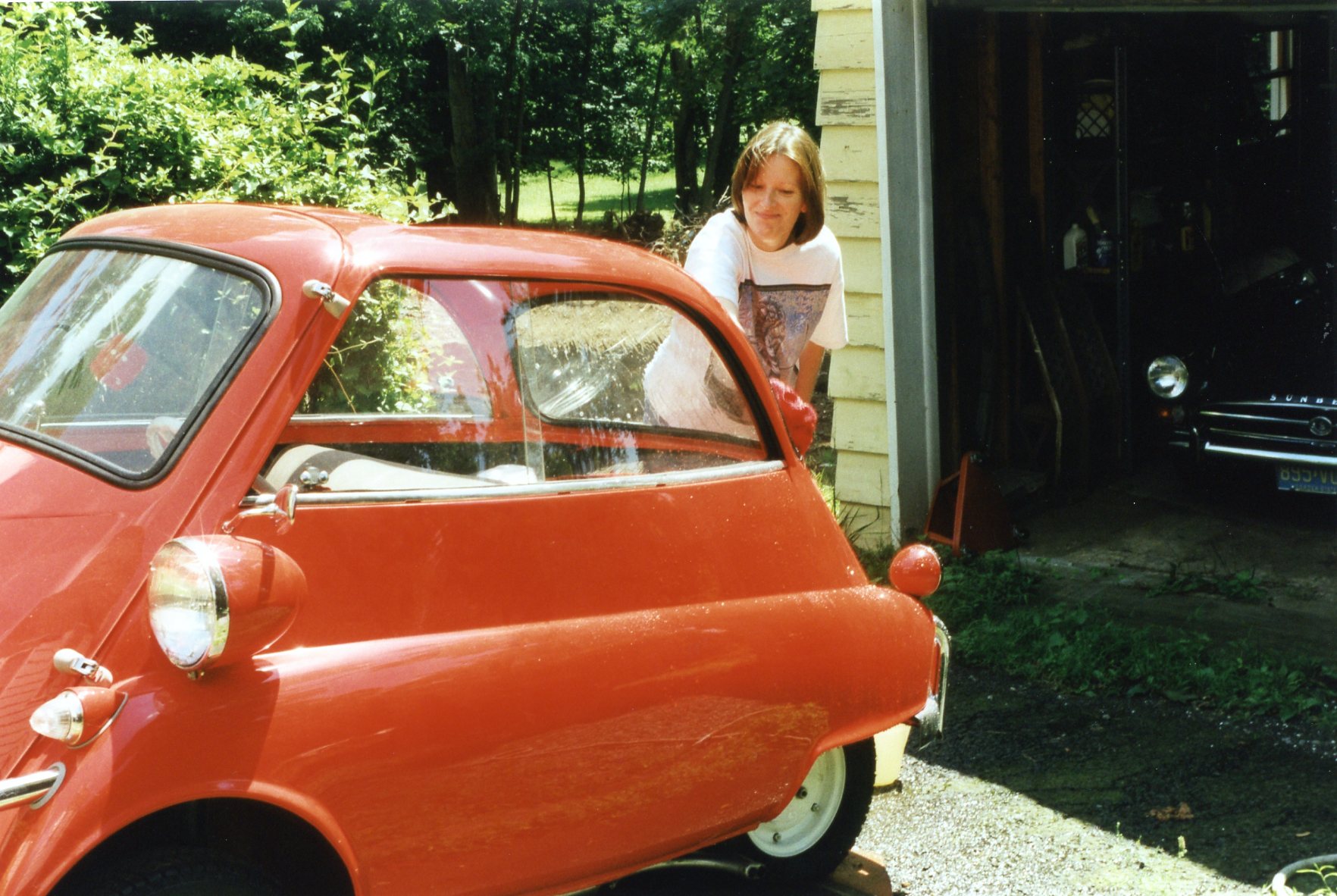 Margaretanne washes the egg. Still no sunroof, so be careful with that hose! Note peeking Sunbeam Tiger.