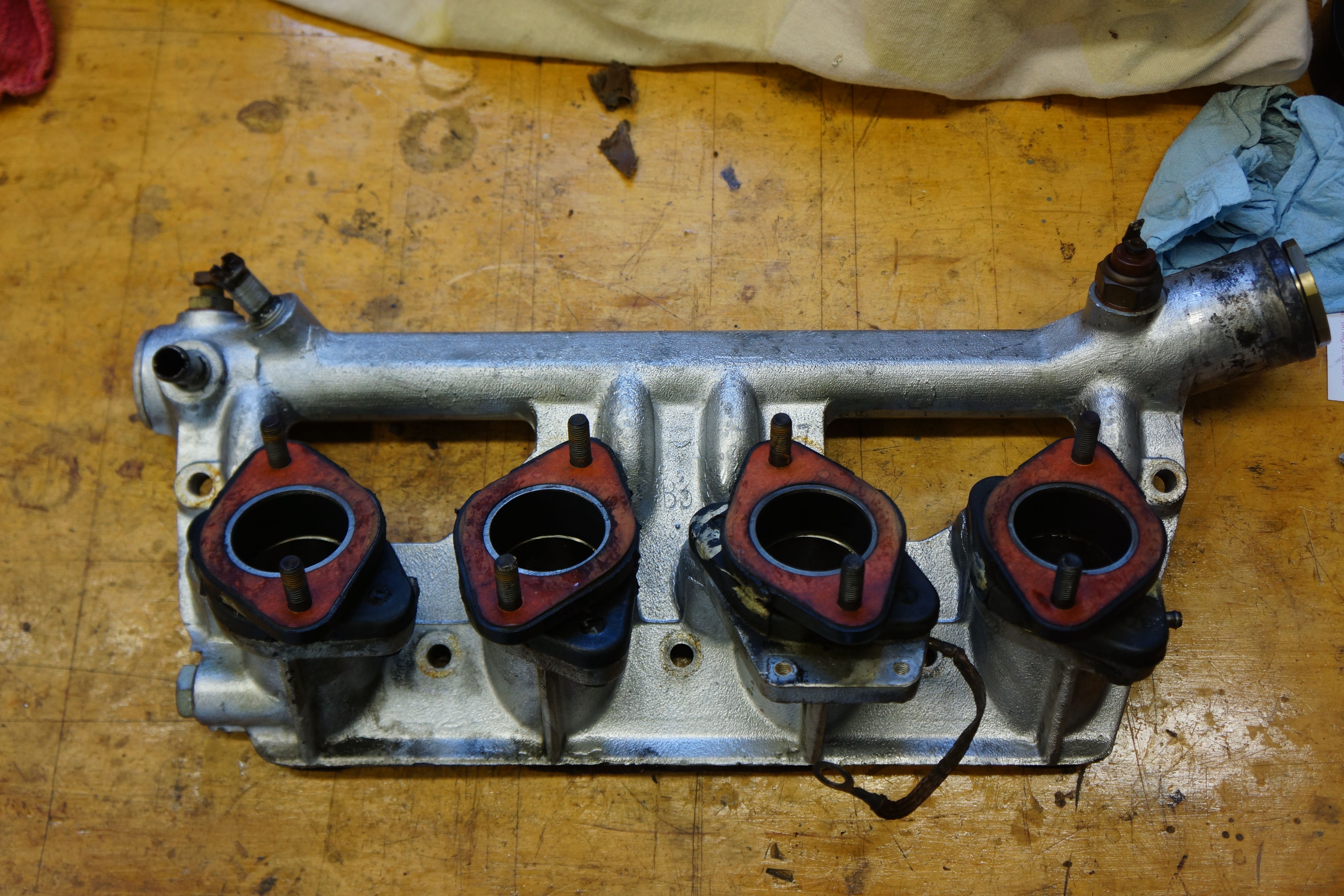 I’ve never removed the Webers from my car before. Removal didn’t look complicated, but would certainly prove to be time-consuming. First, the upper plenum is removed (two hose clamps, one bolt, and two nuts, all easily accessible). Next, the lower plenum comes off (ten nuts and washers, four of which are totally blind). Now one has access to the carbs themselves (eight nuts, four of them blind). Once the banjo bolts for the fuel connections are undone, the carbs can be removed from the car. The carburetors bolt to 4 rubberized mounts, each of which has 4 studs. To remove the mounts, one first must remove the intake manifold, as 8 of the nuts for the mounts are only accessed if the intake manifold is unbolted from the cylinder head (7 nuts, some of them only reachable with an open-ended wrench, which only allows 1/6 of a turn at a time).