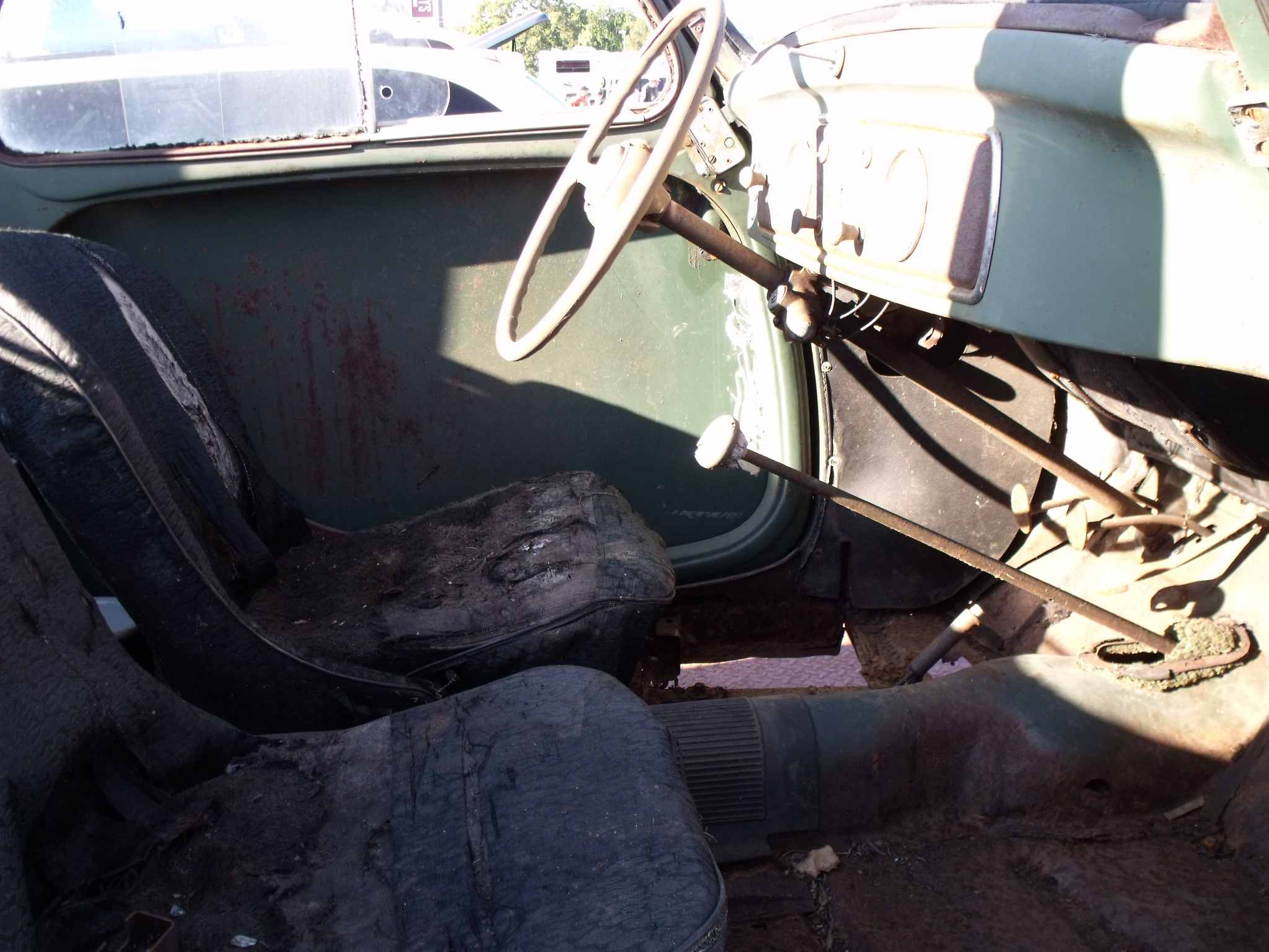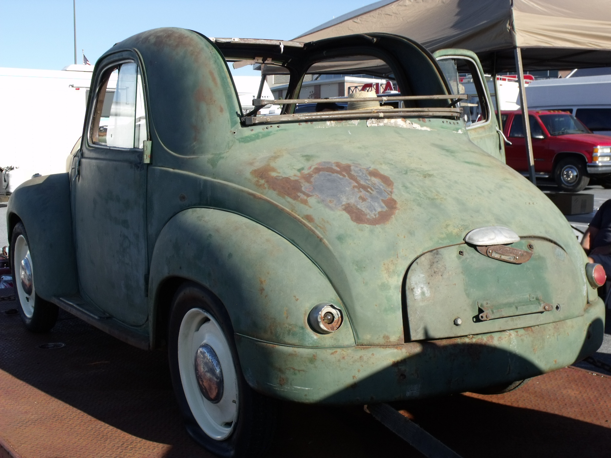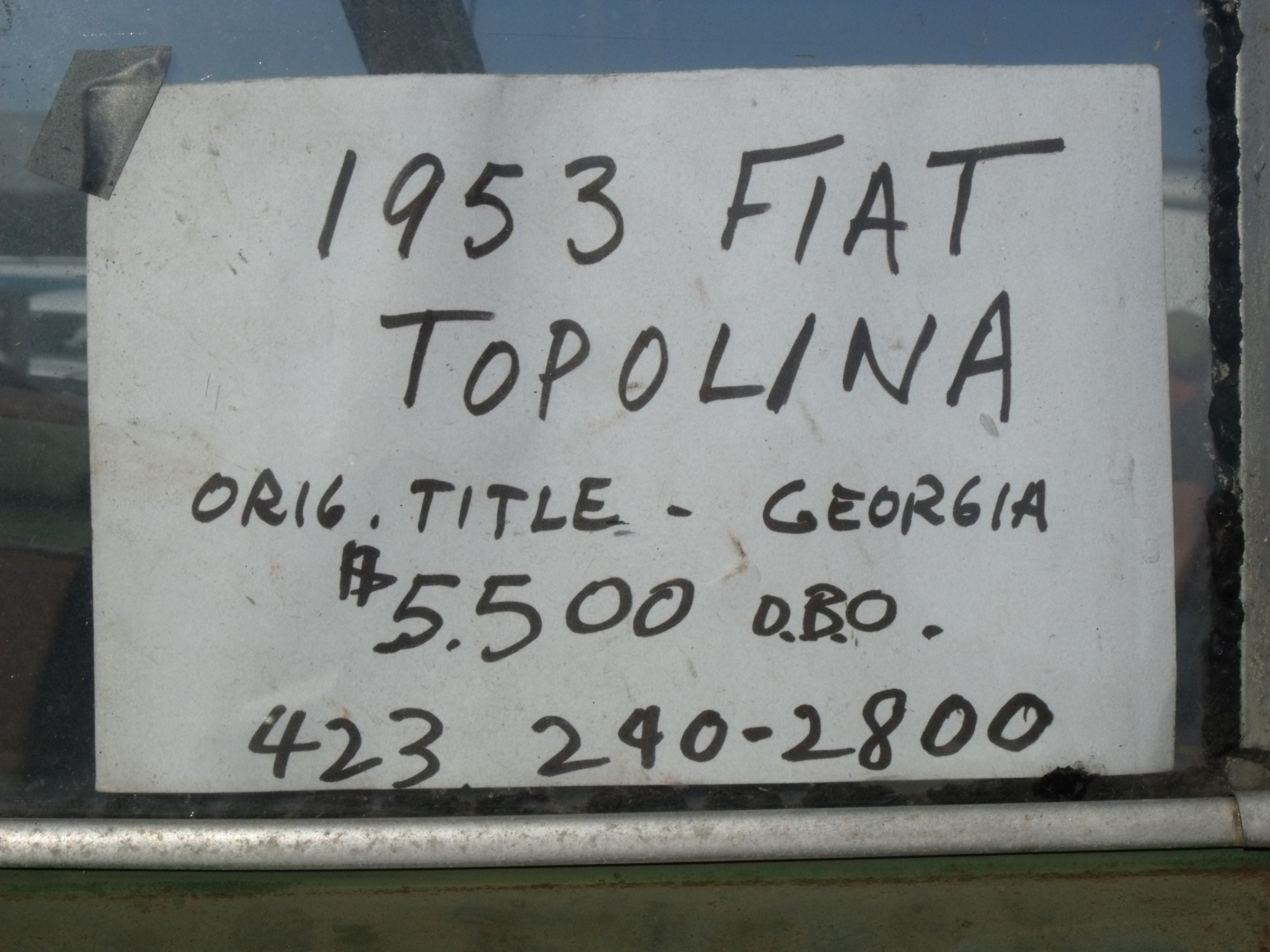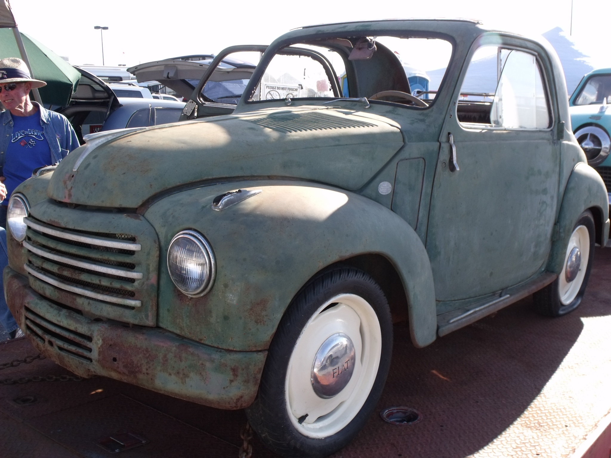 I tend to focus on the rare or unusual cars in the Car Corral, along with any which strike me as potentially good deals. This year, the most unusual of the lot was this 1953 Fiat Topolino (the owner can be forgiven for his misspelling of it as ‘Topolina’), obviously a #5 condition car, and offered at $5,500 OBO. Wikipedia reveals this to be a Model C, produced from 1949-1955, perhaps not as cute as the Models A and B, but still with enough il fascino (charm) to make it an attractive project. The “Fiat-Heuler, Frankfurt a. M.” is the German Fiat dealership in Frankfurt. Check out this beautiful restoration which sold last year on Bring a Trailer for $19,870.