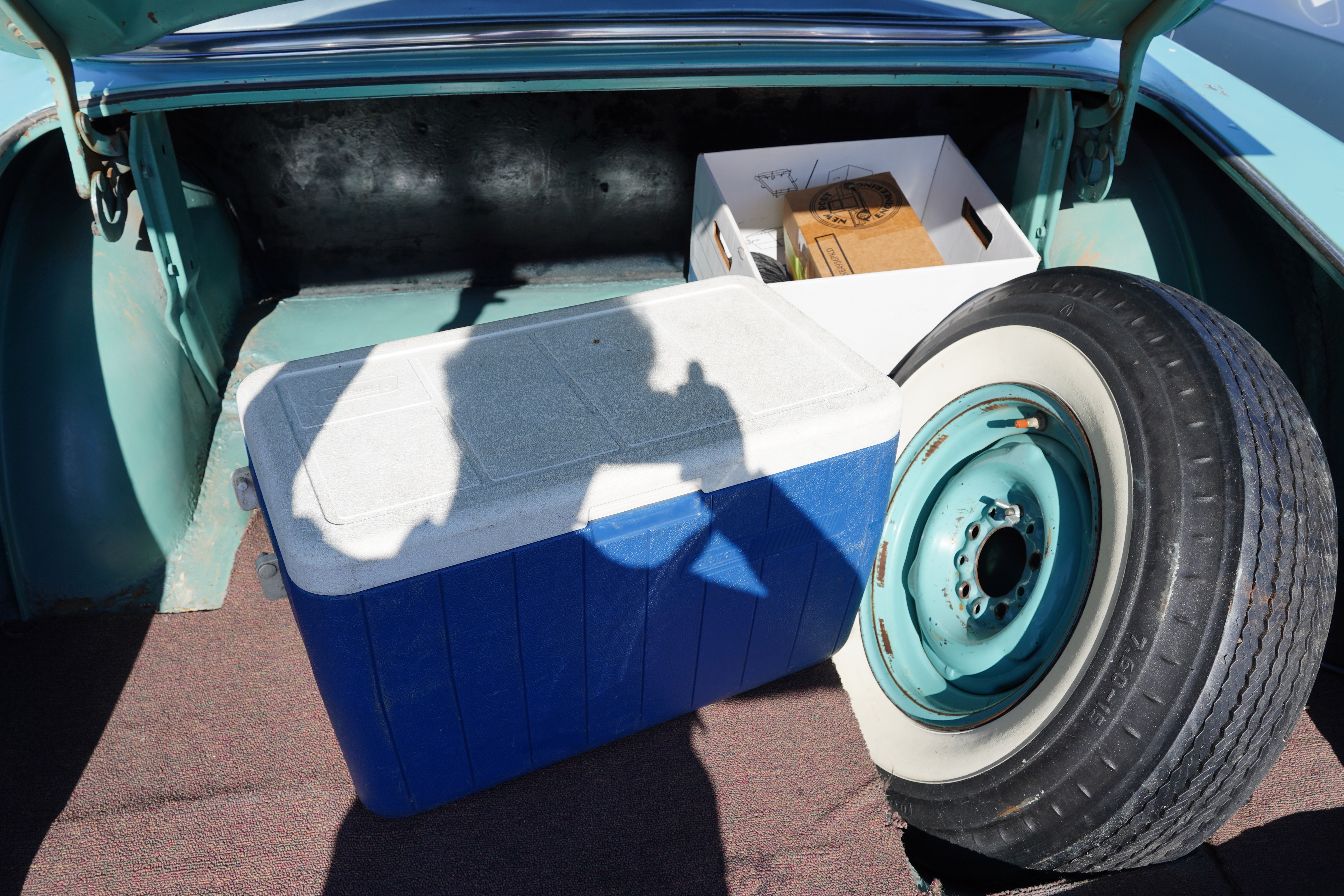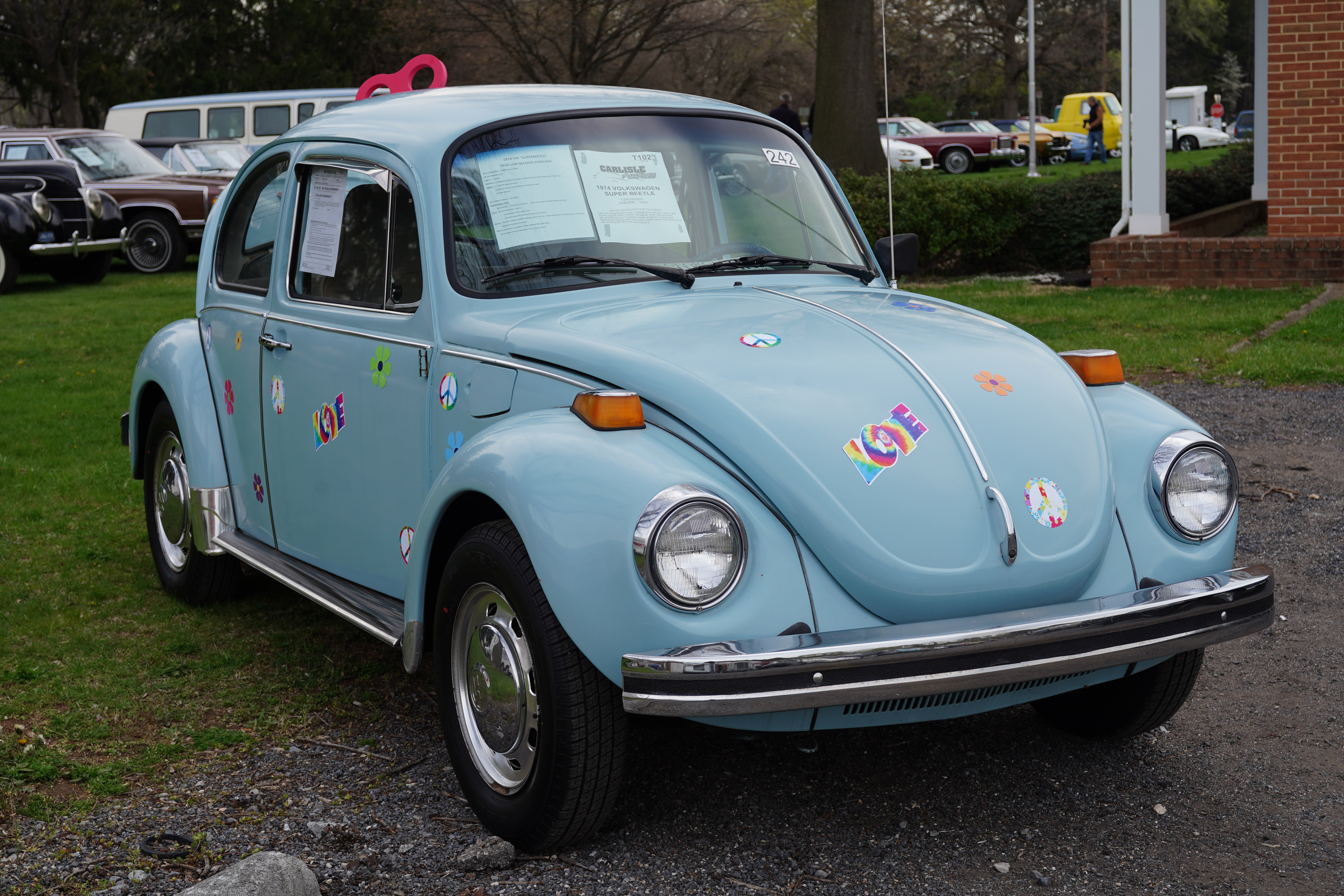 T102, 1974 VW Super Beetle, light blue, white interior. Sign claims 53k original miles. Blackwall tires, VW hub caps. Exterior shows well except for (hopefully removable) decals. Interior has cracked dash, paint chips on inside driver’s door, lace-on steering wheel cover, coco floor mats. Engine compartment clean, shows signs of recent service.