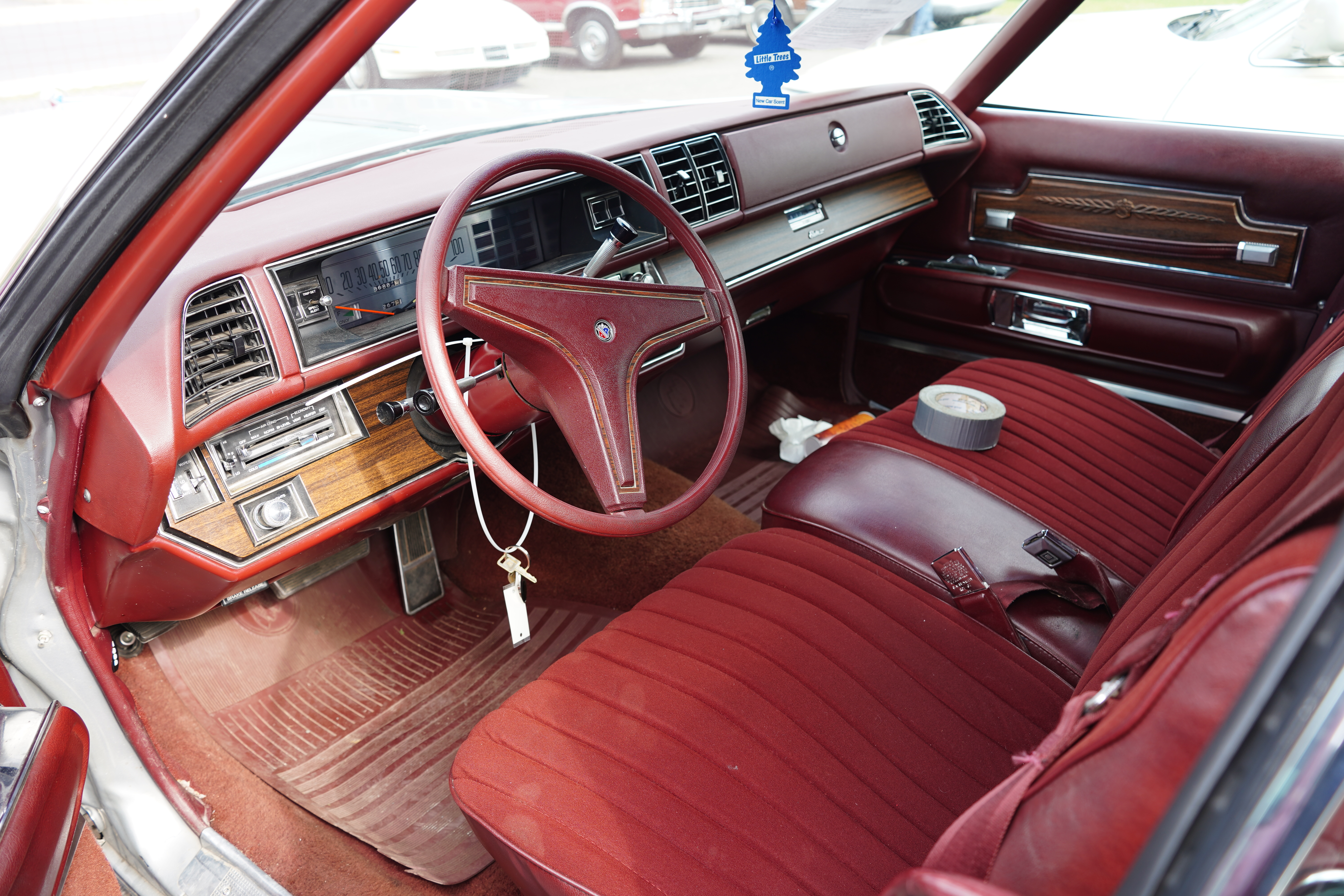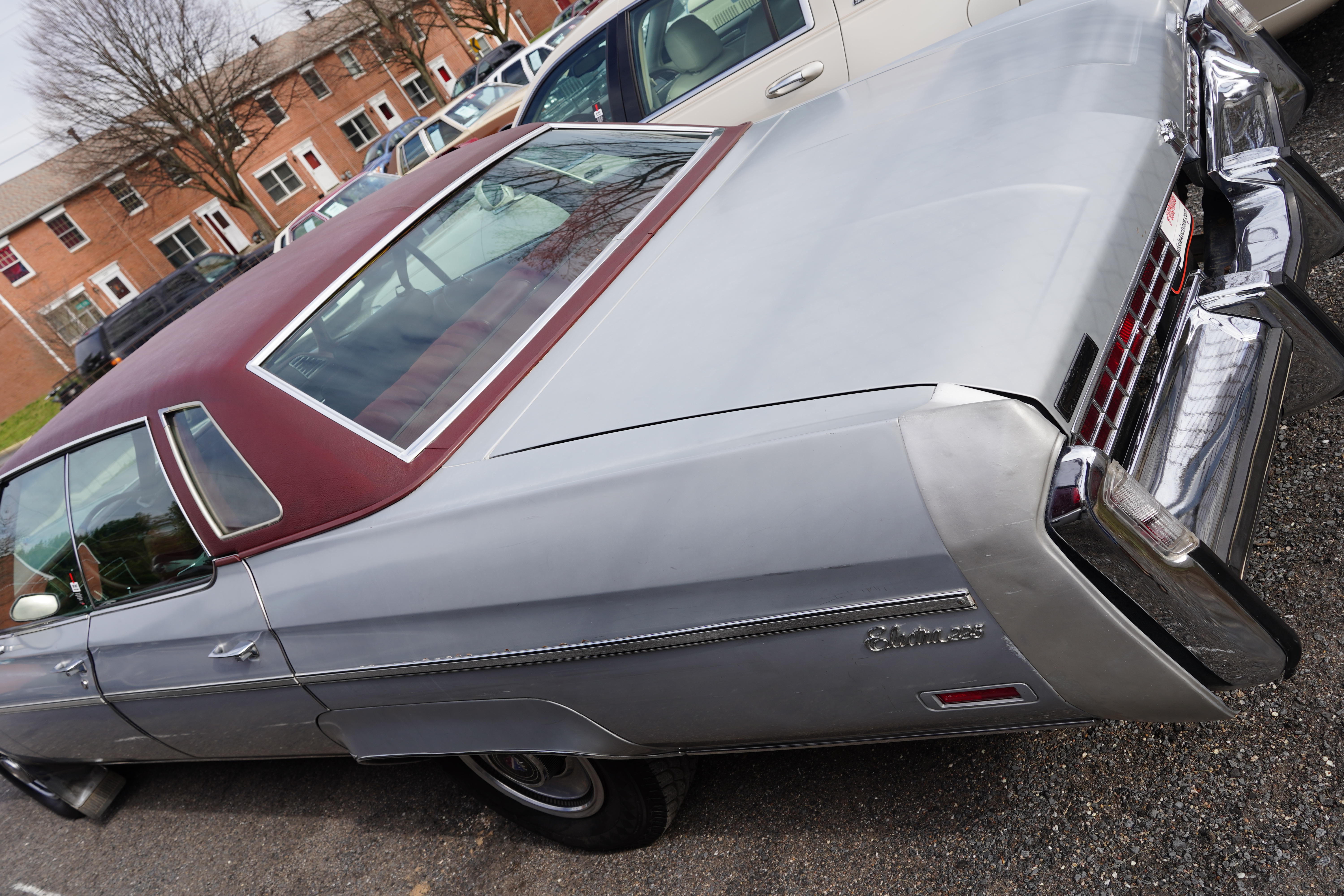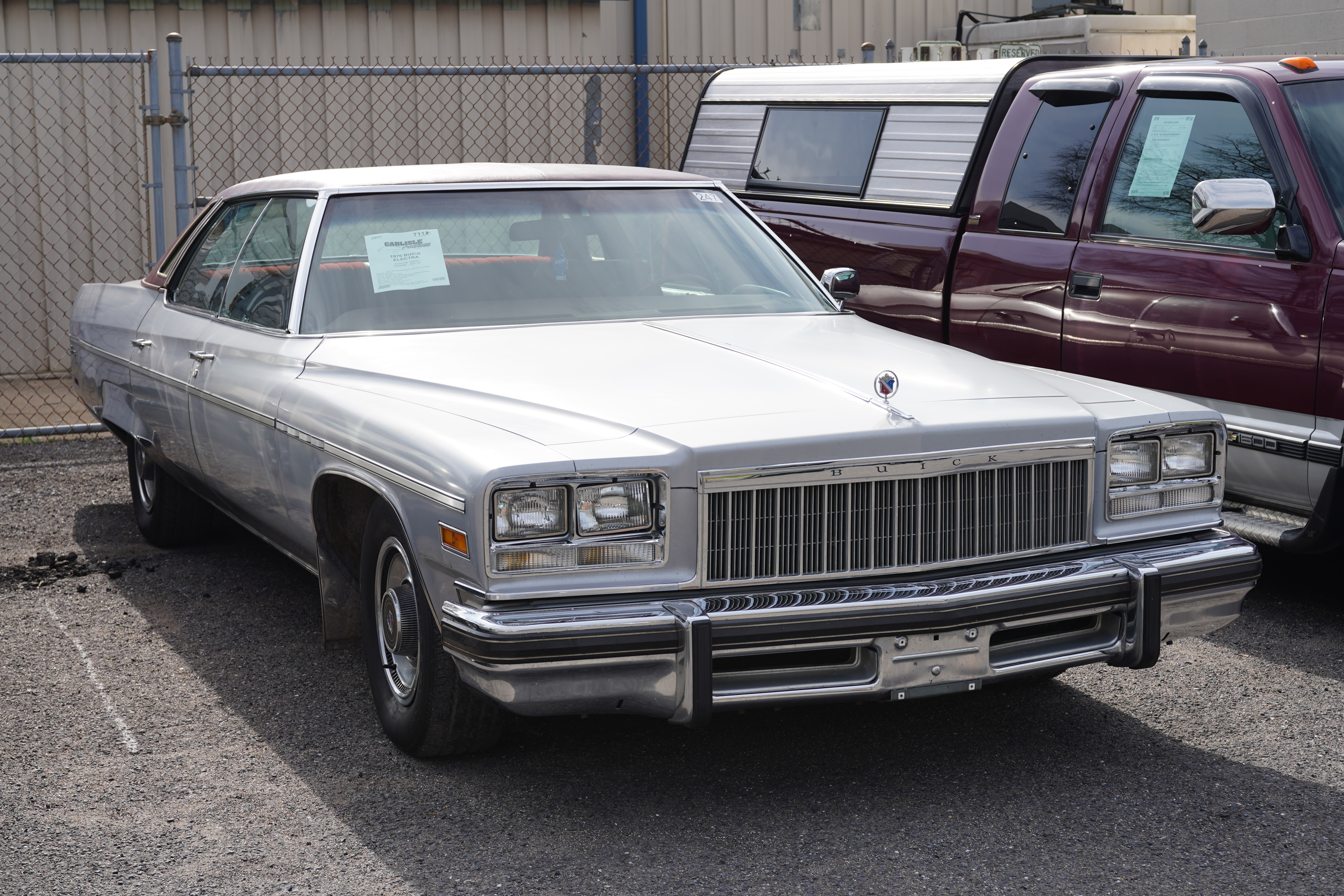 T112, 1976 Buick Electra 4-door pillarless hardtop, silver, red vinyl roof, red interior. 455 V8, auto. Clock shows 87k. Blackwall tires, full wheel covers, fender skirts, faded bumper fillers. Paint is shot, silver looks more like primer. Interior ok, driver’s door armrest deteriorated. (No mention if roll of duct tape is included.) Engine compartment a mess. Last year of GM’s full-size cars before the Big Downsizing in ’77.