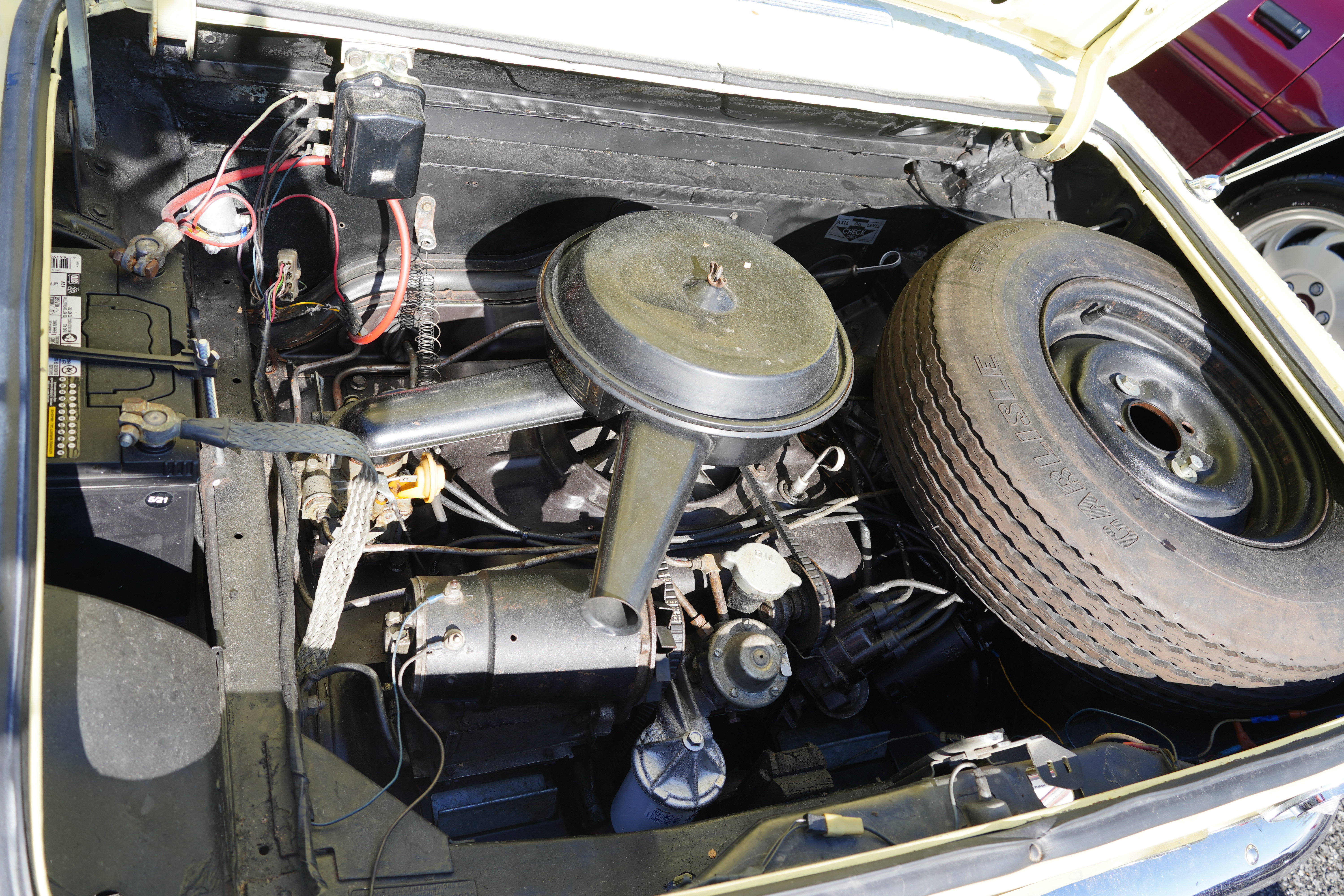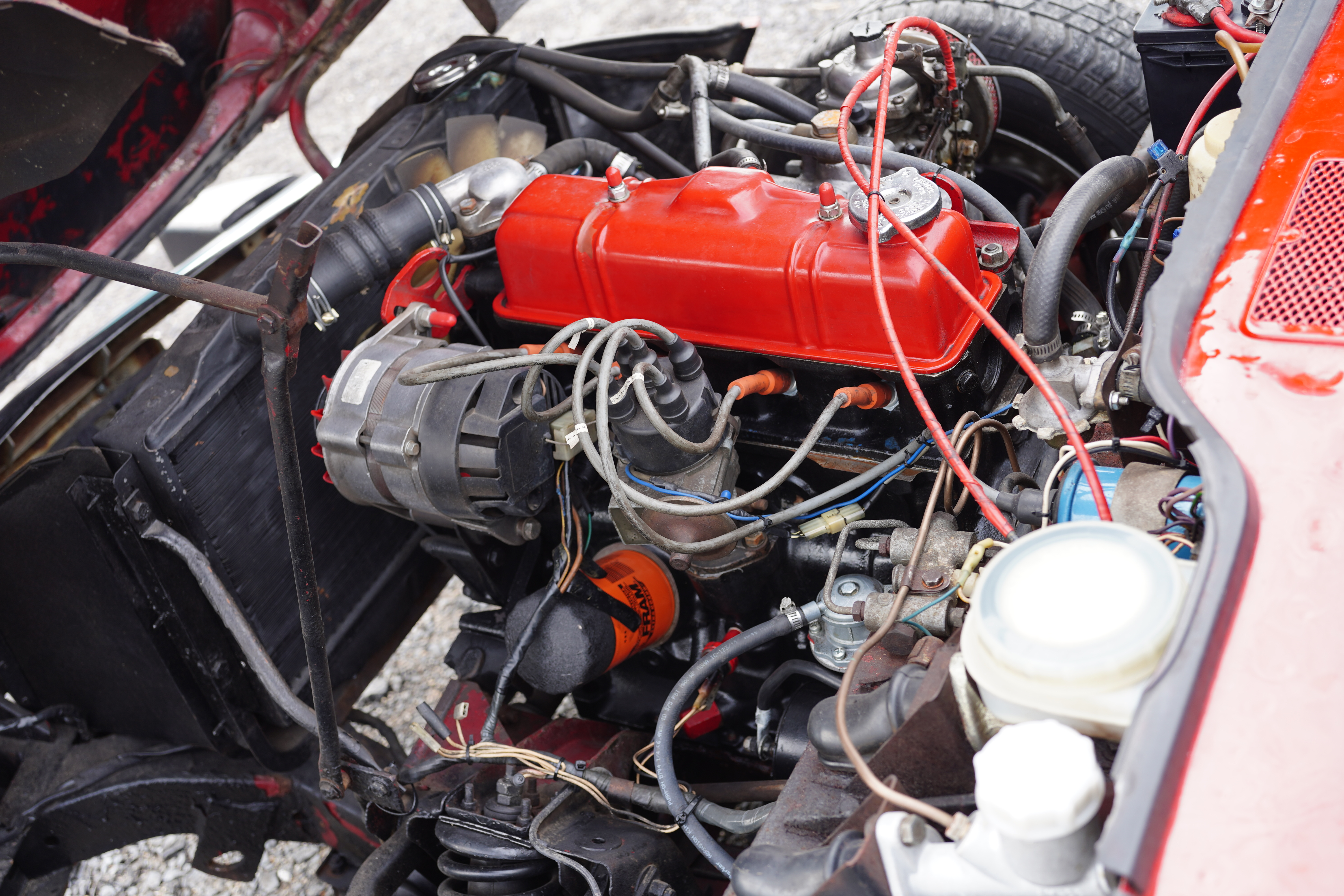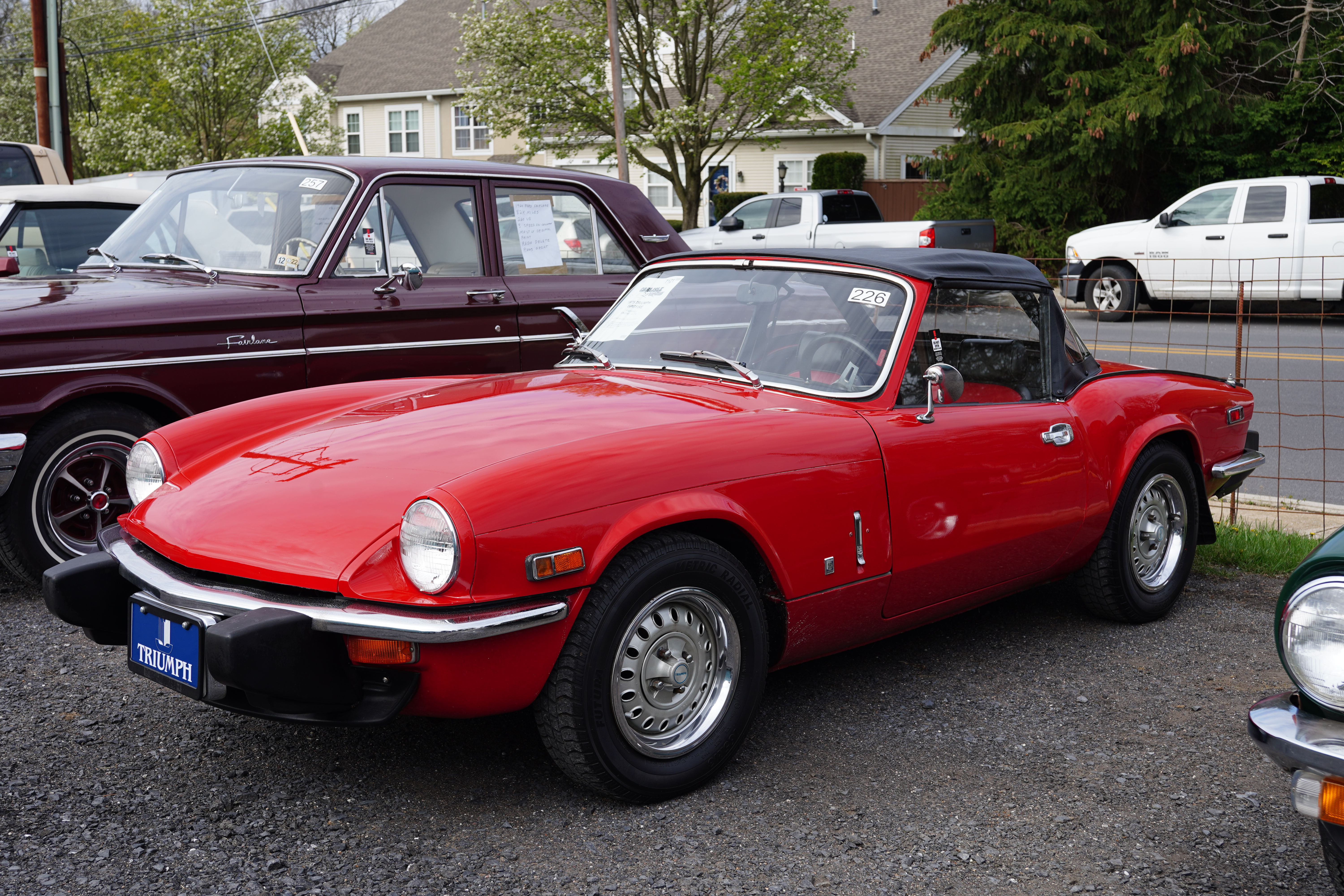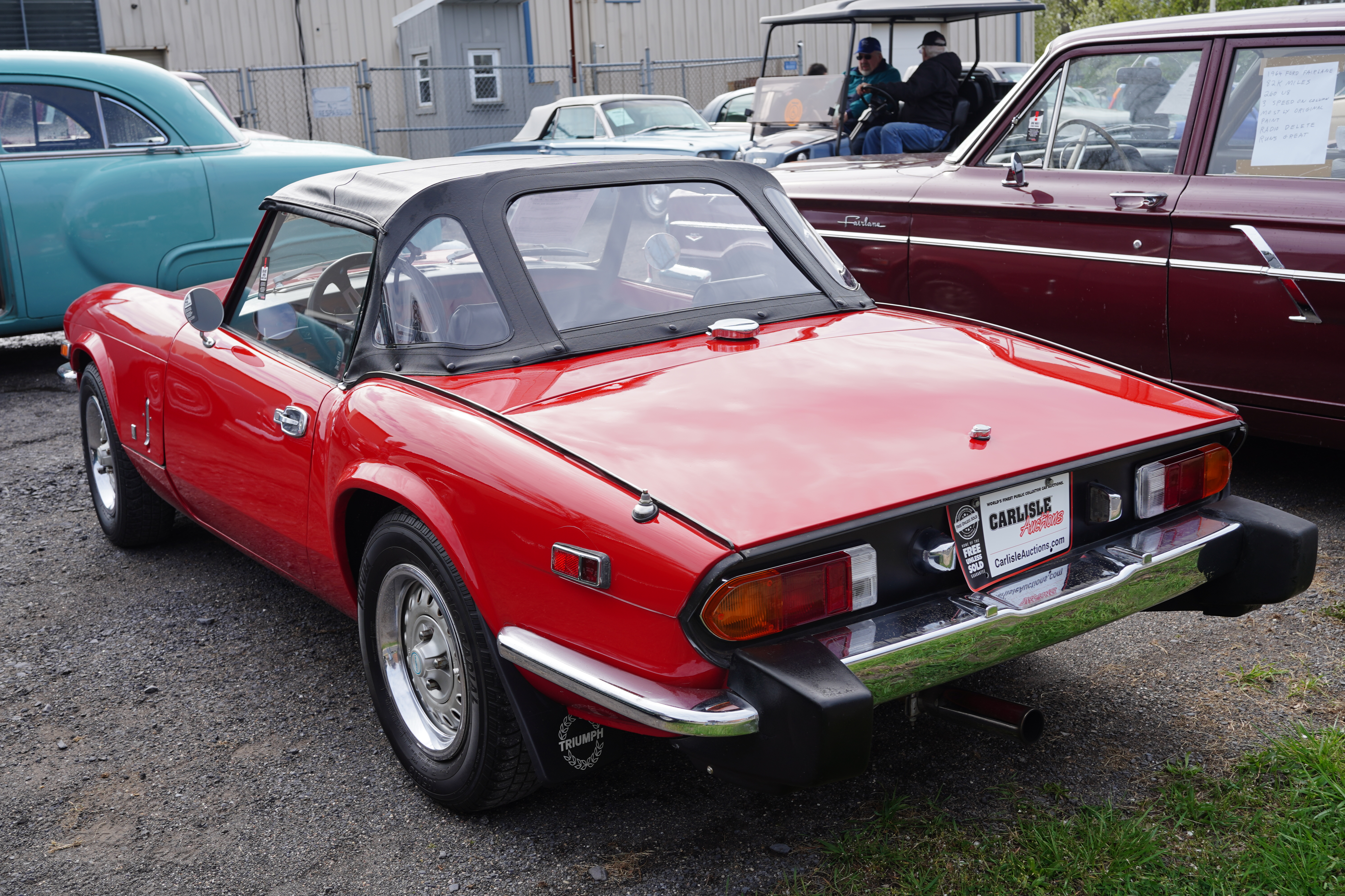 T121, 1975 Triumph Spitfire, red, black top, non-original two-tone black/red interior. Painted wheels, center caps and trim rings, blackwall tires. Sign claims 45k original miles. Engine compartment clean.