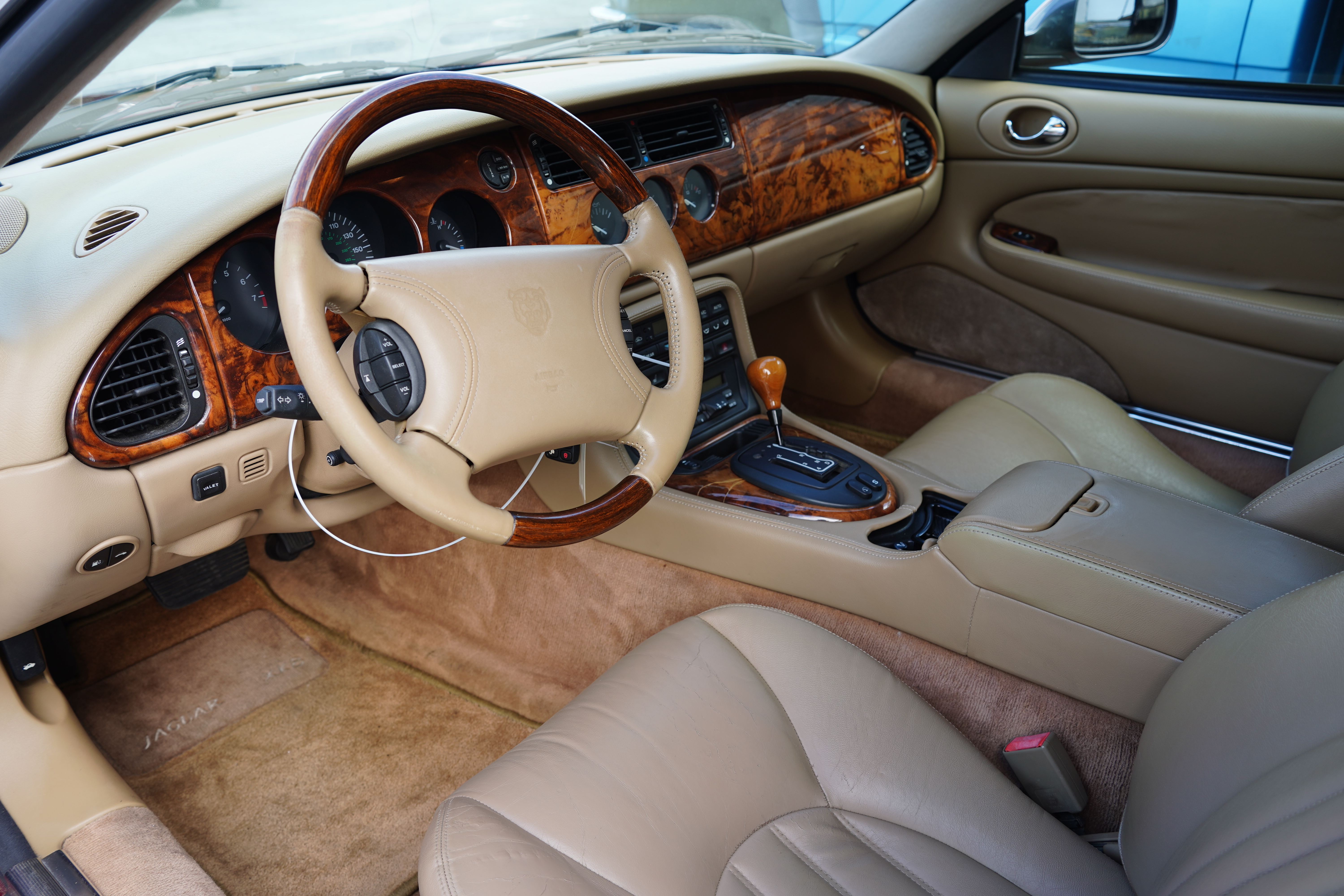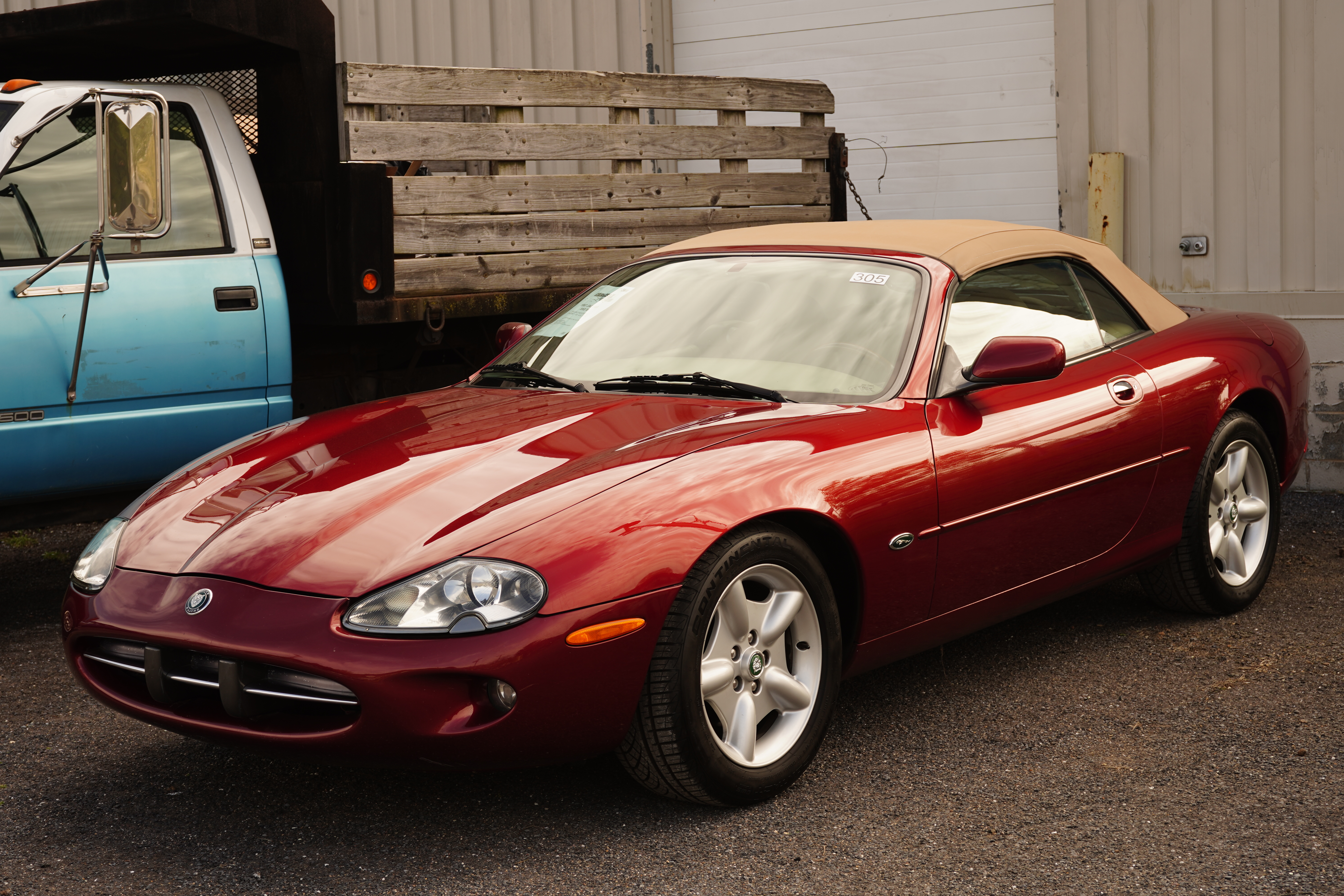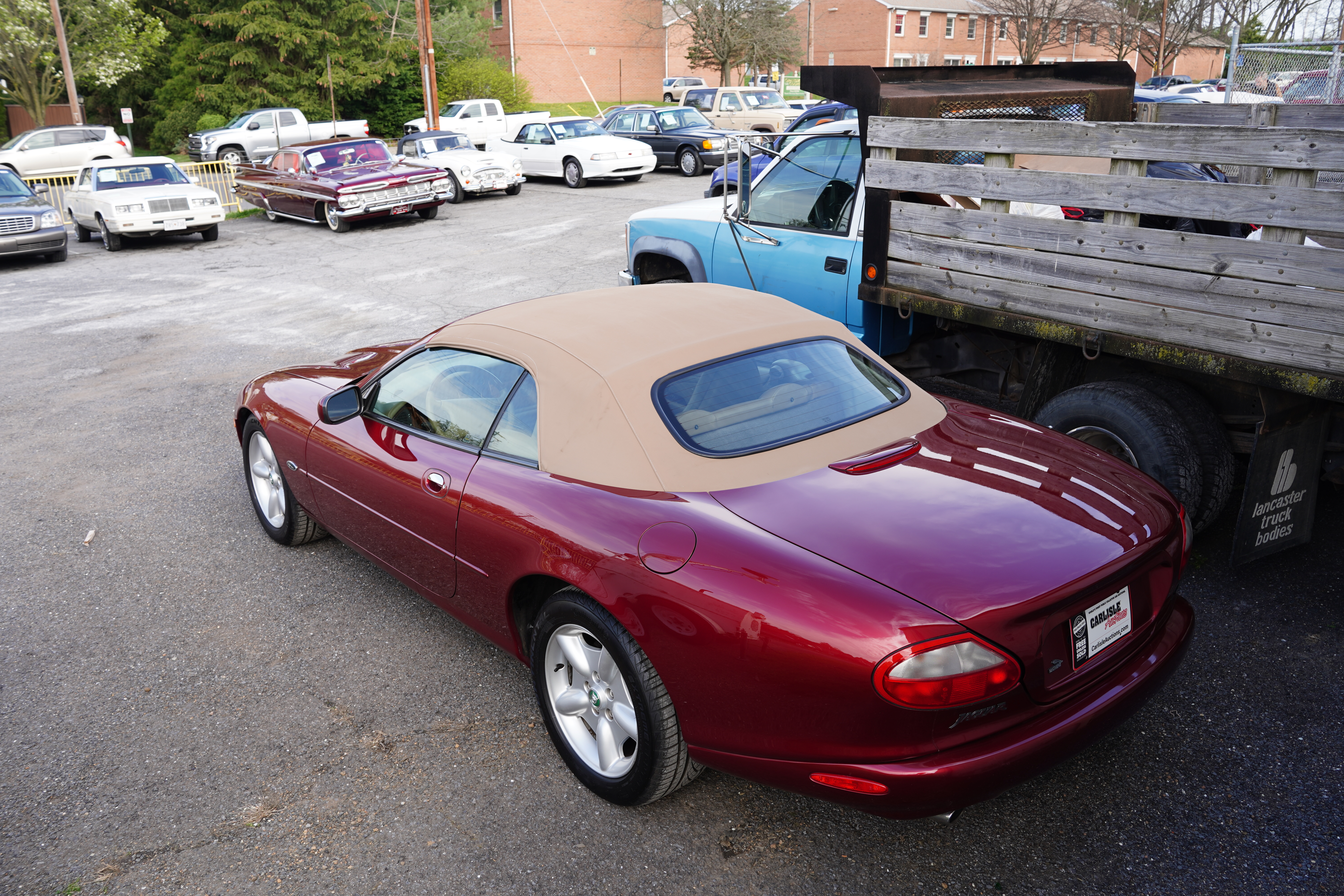 T134, 1997 Jaguar XK8 convertible, V8, auto, dark red, tan top and interior, 88k miles, factory alloys, blackwall tires, interior shows little wear. Sign claims recent service to timing chains and coolant inlets. First year for the XK8.