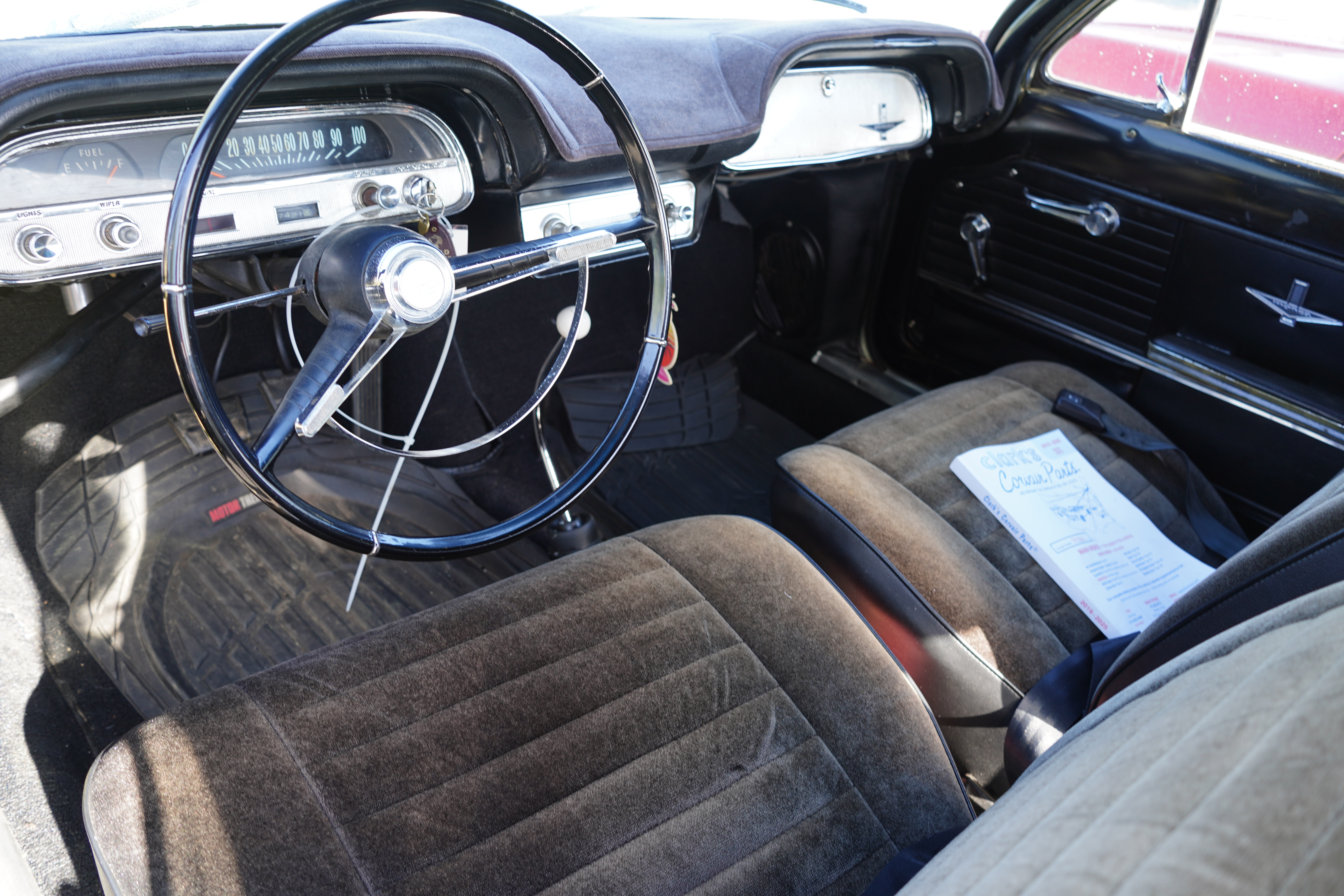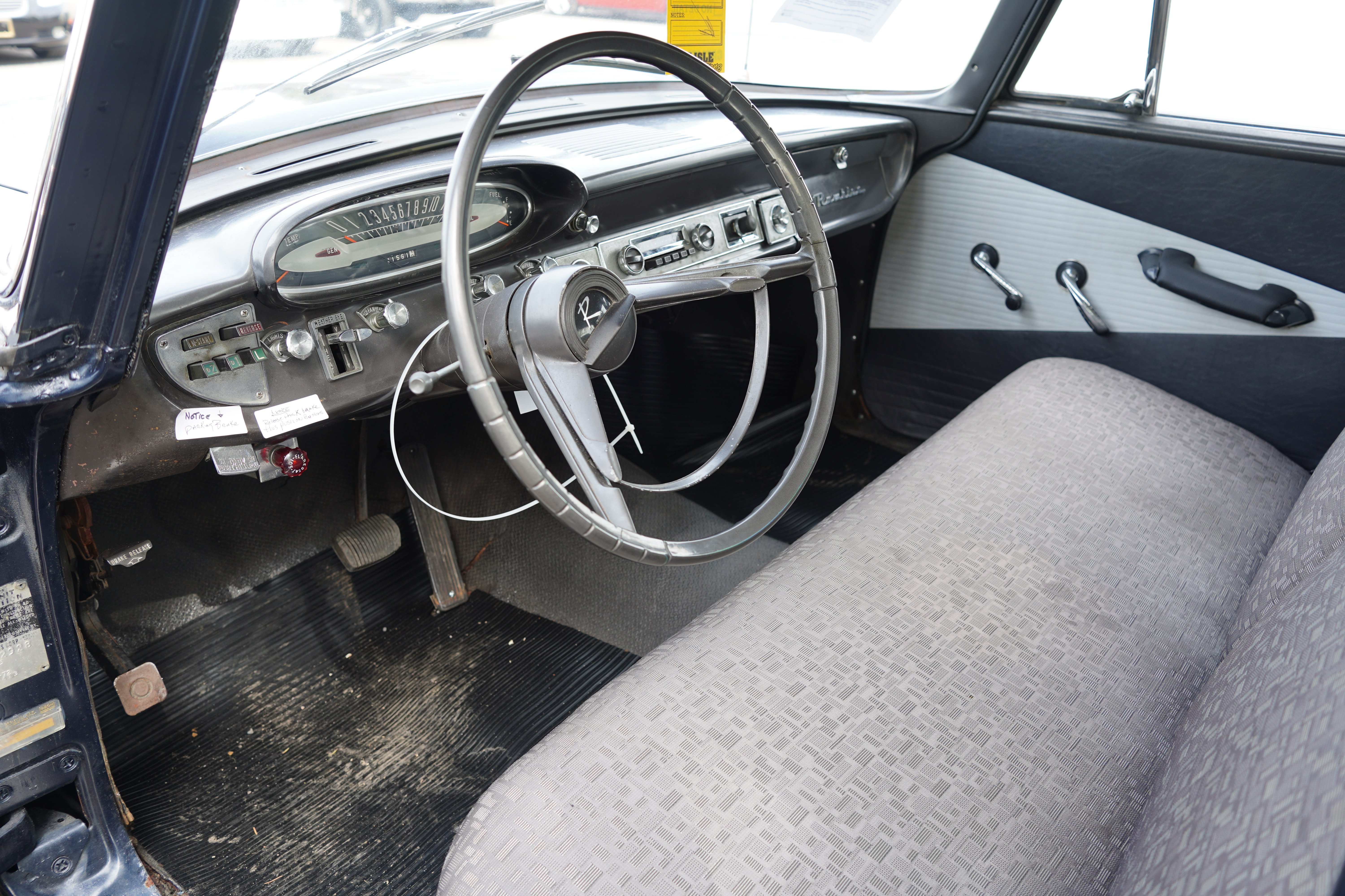 T145, 1960 Rambler 4-door sedan, 6-cylinder, auto (push button!), dark blue body, white top, blackwall tires, white painted wheels with Rambler hub caps. Sign claims 41k original miles, could be true. Interior multi-grey, rubber mats on floor. Quite basic transportation even by 1960 standards.