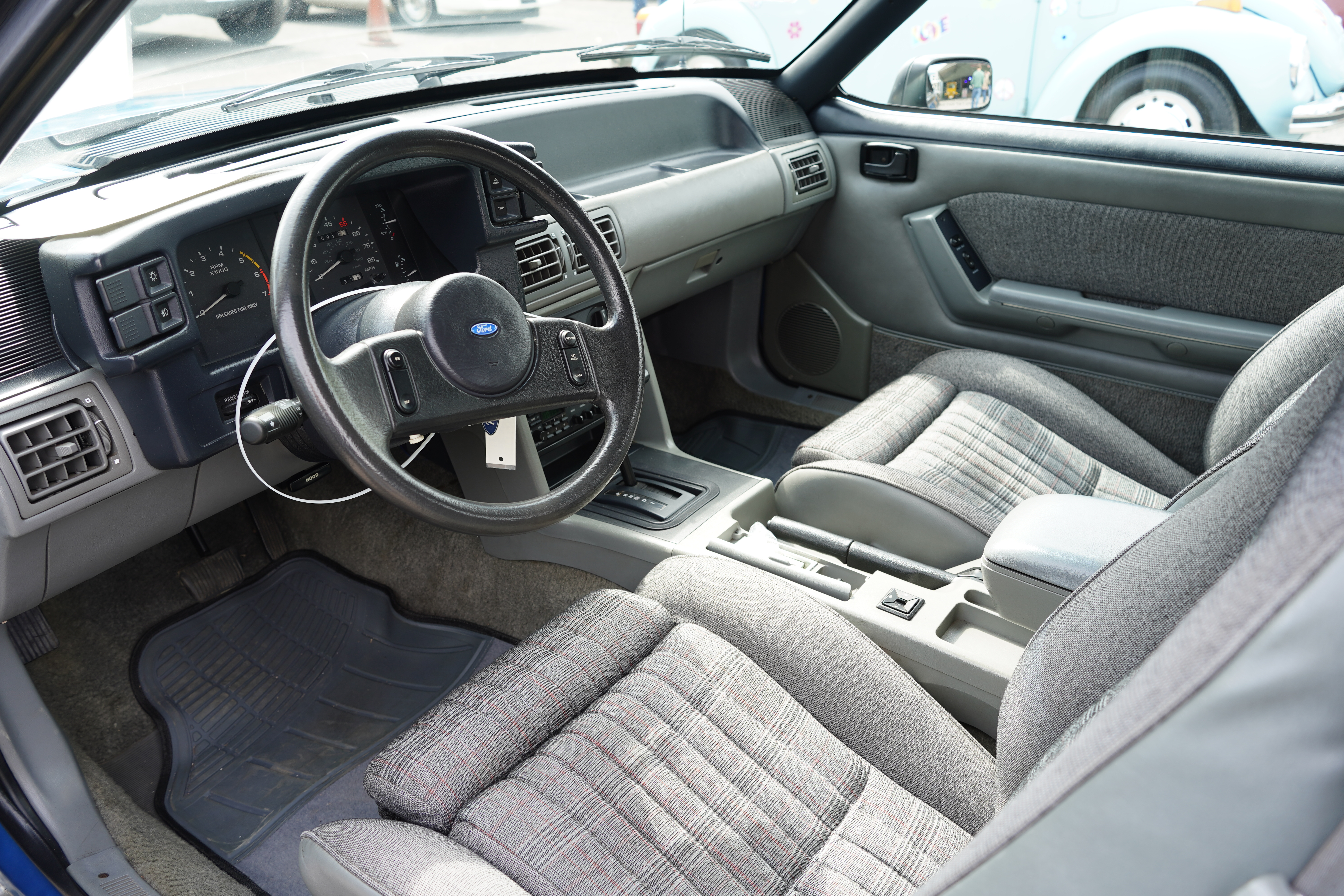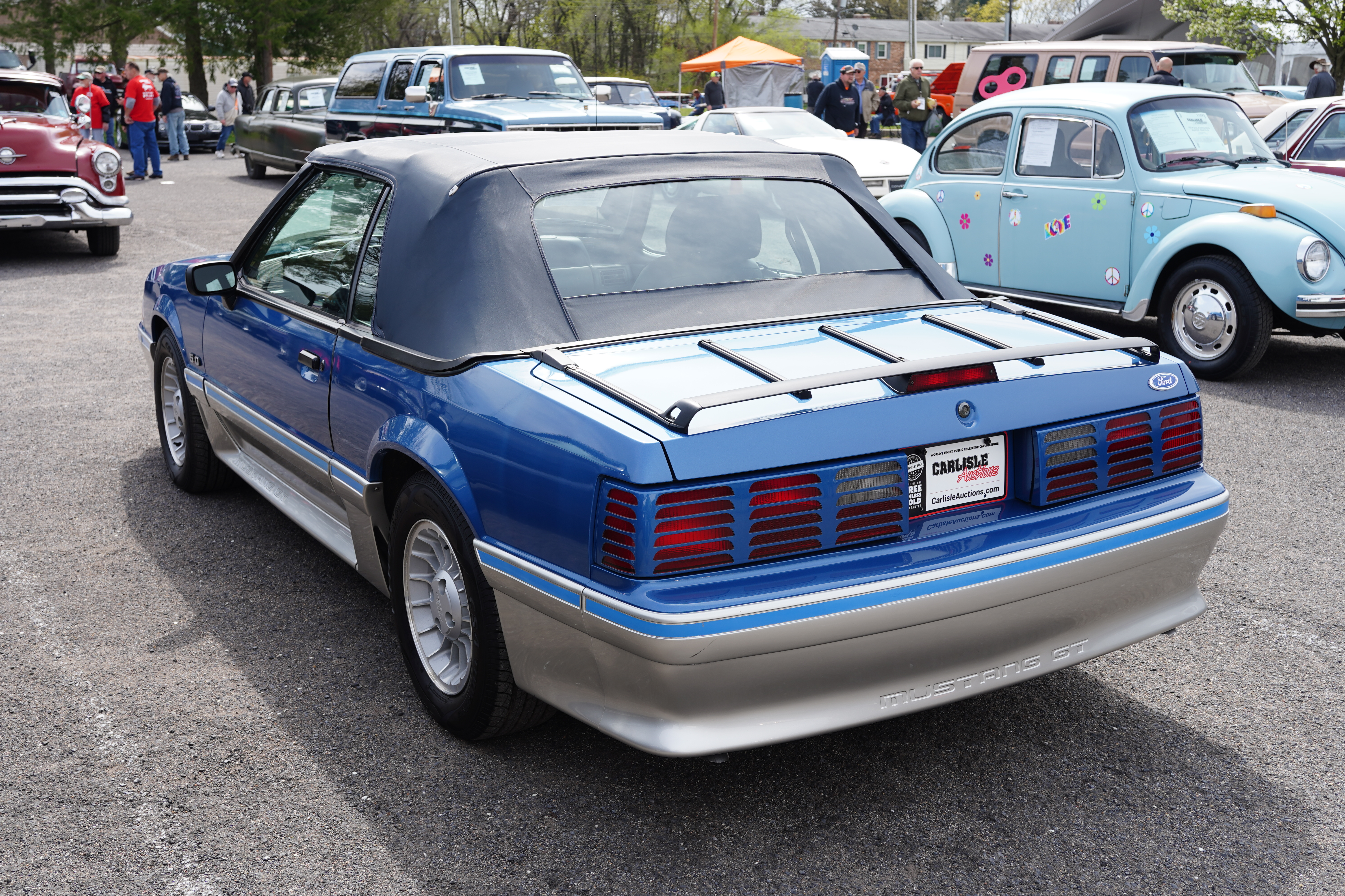 T217, 1988 Ford Mustang GT convertible. 5.0 V8, automatic, claim is 46k original miles. Blue paint, grey lower cladding, dark blue convertible top, luggage rack, factory alloys, blackwalls. Interior is grey plaid cloth. Overall hard to fault.