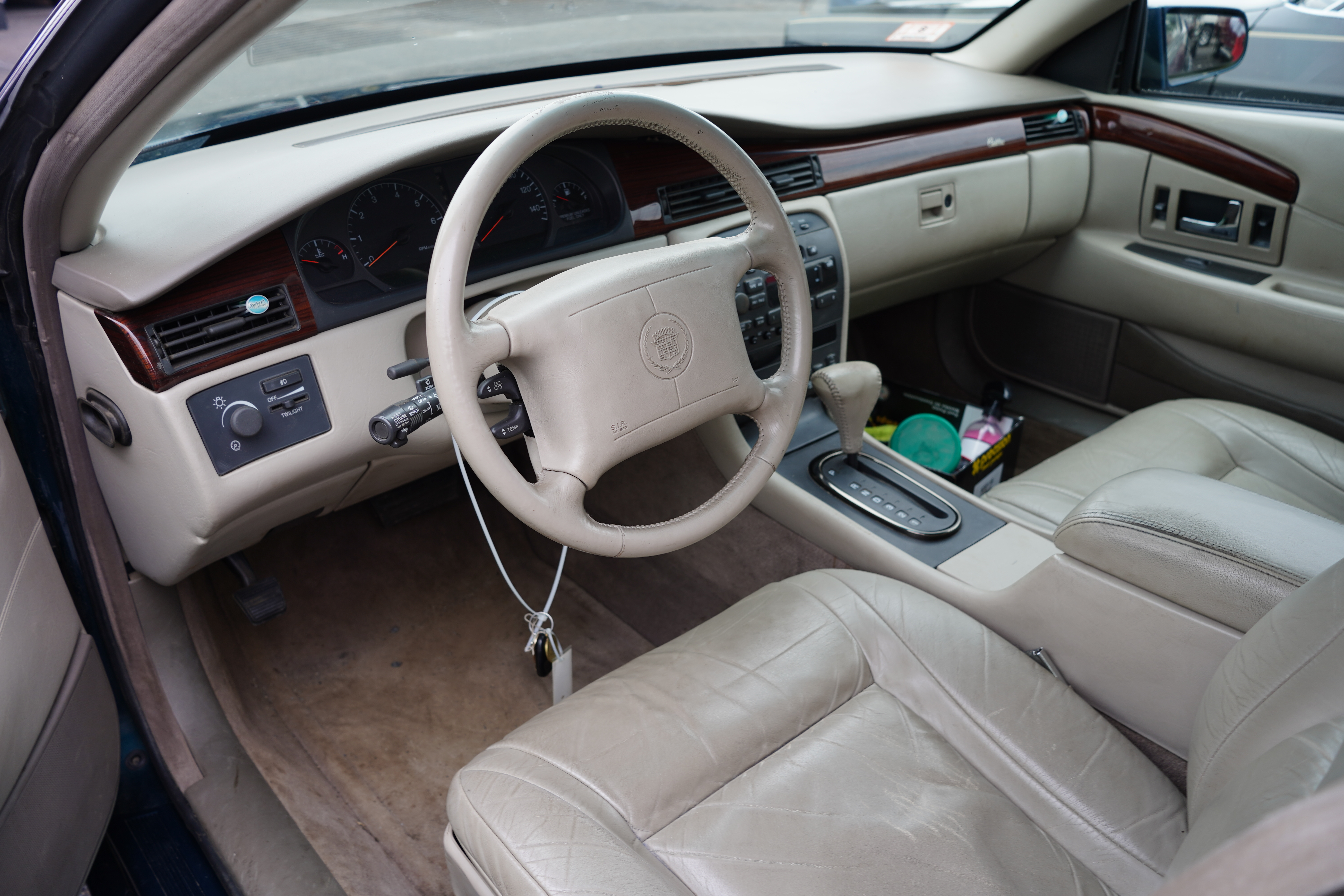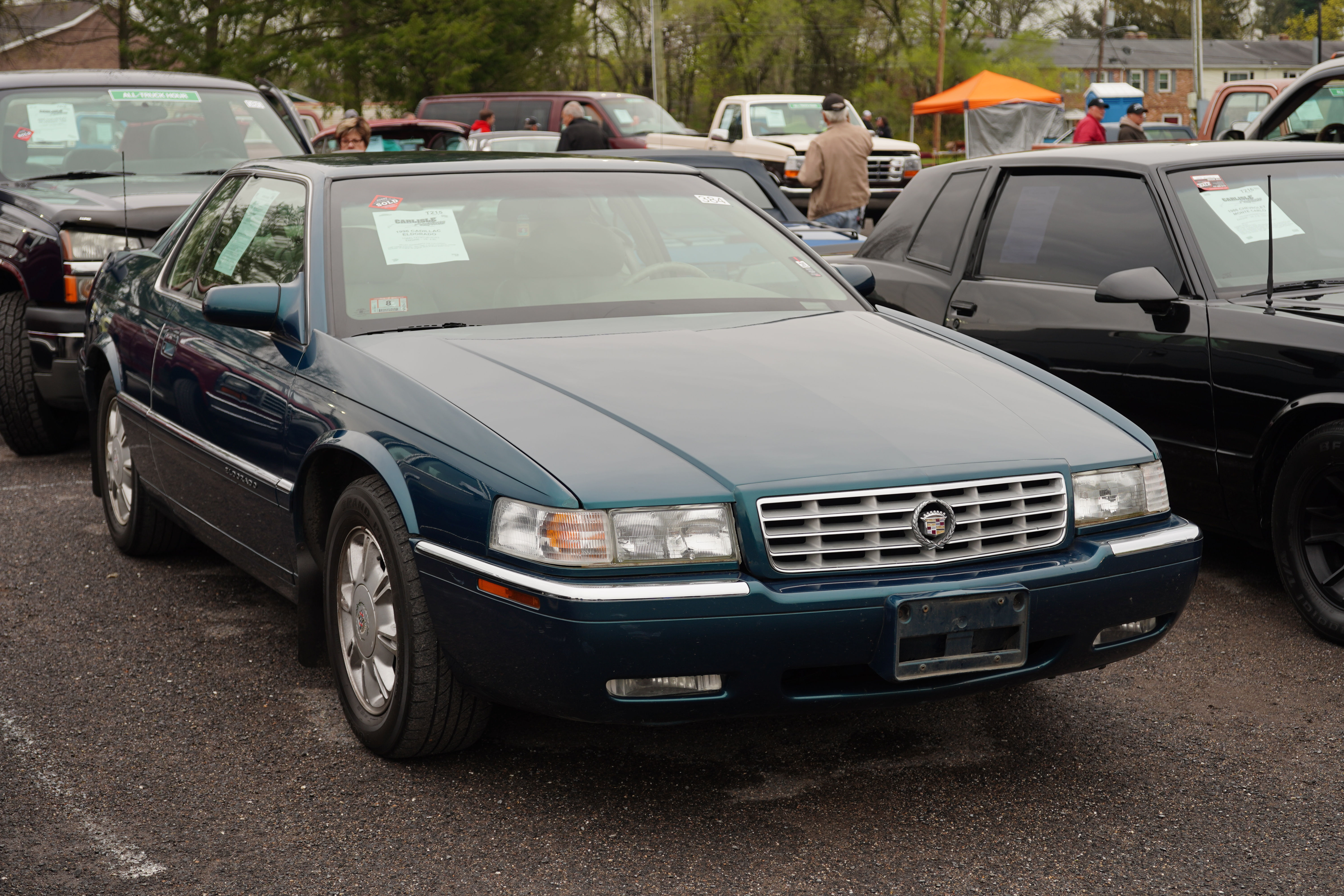 T215, 1996 Cadillac Eldorado, dark blue/green, taupe interior. Northstar V8, auto, factory alloys, blackwalls. Interior shows expected wear for age. Sign claims “low actual mileage” but miles not verified.