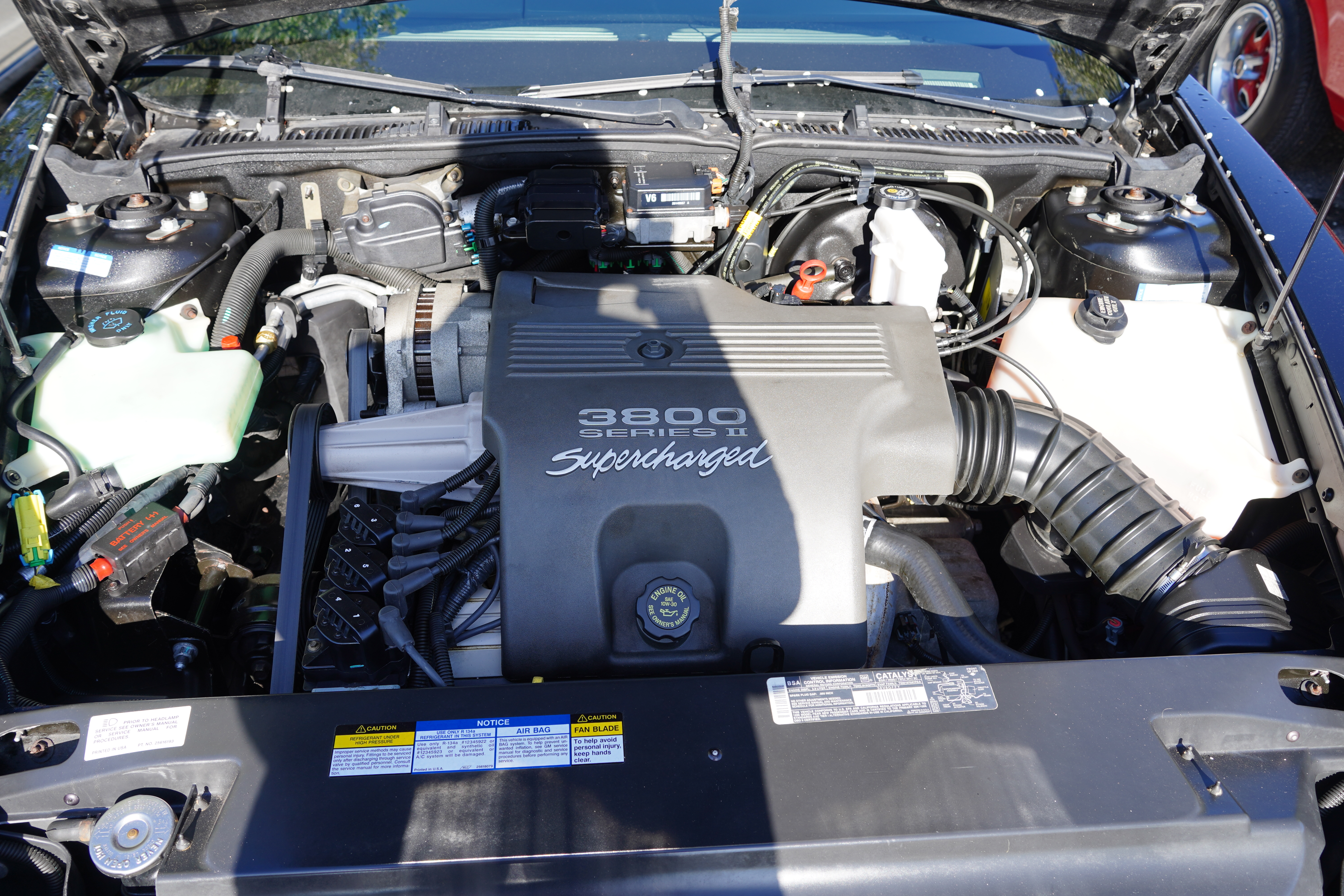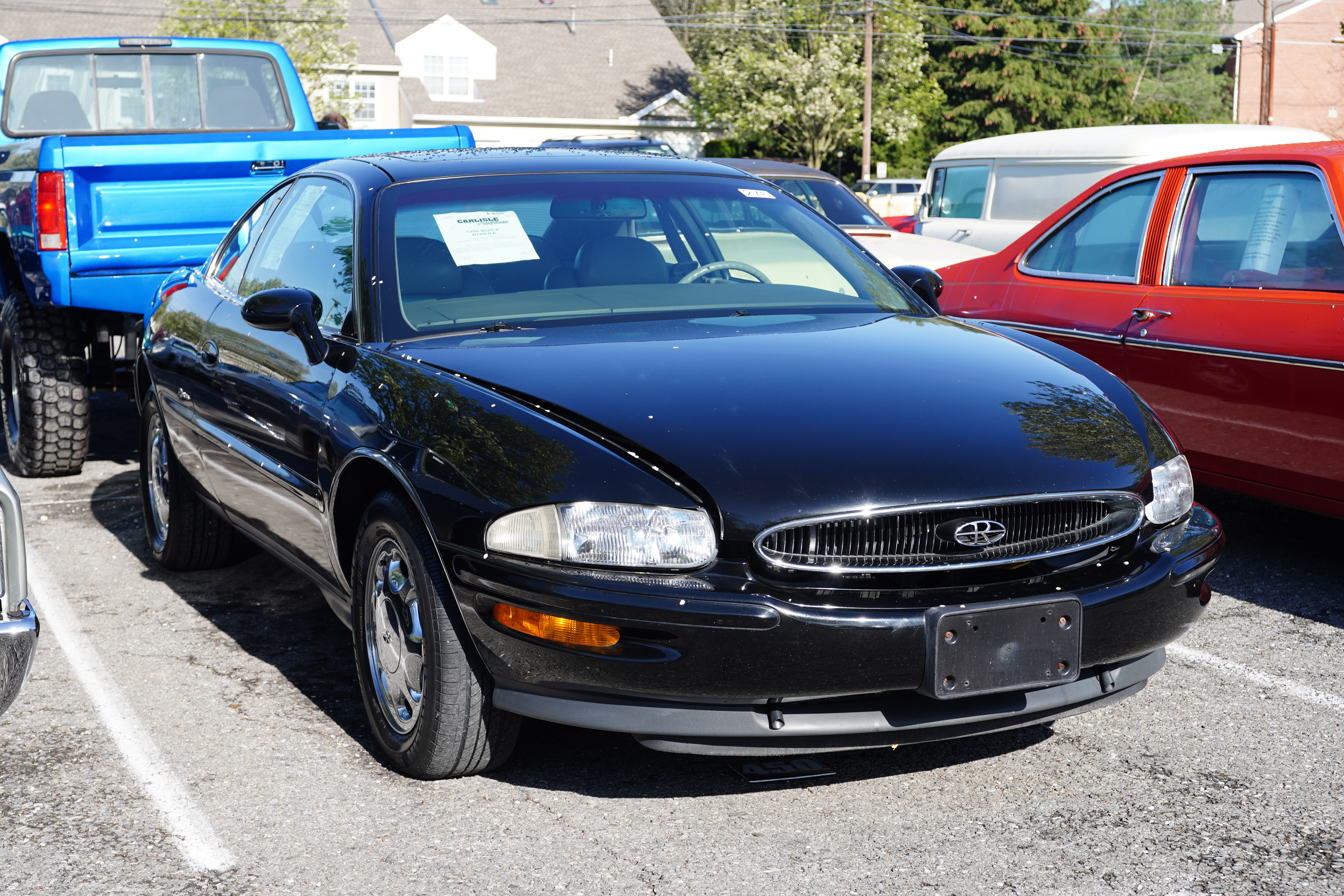 F450, 1996 Buick Riviera, 3.8L supercharged V6, auto, FWD. Black paint, chrome factory wheels, grey leather interior. Sign claims 69k original miles. Looks like a 10-year-old well-kept used car.
