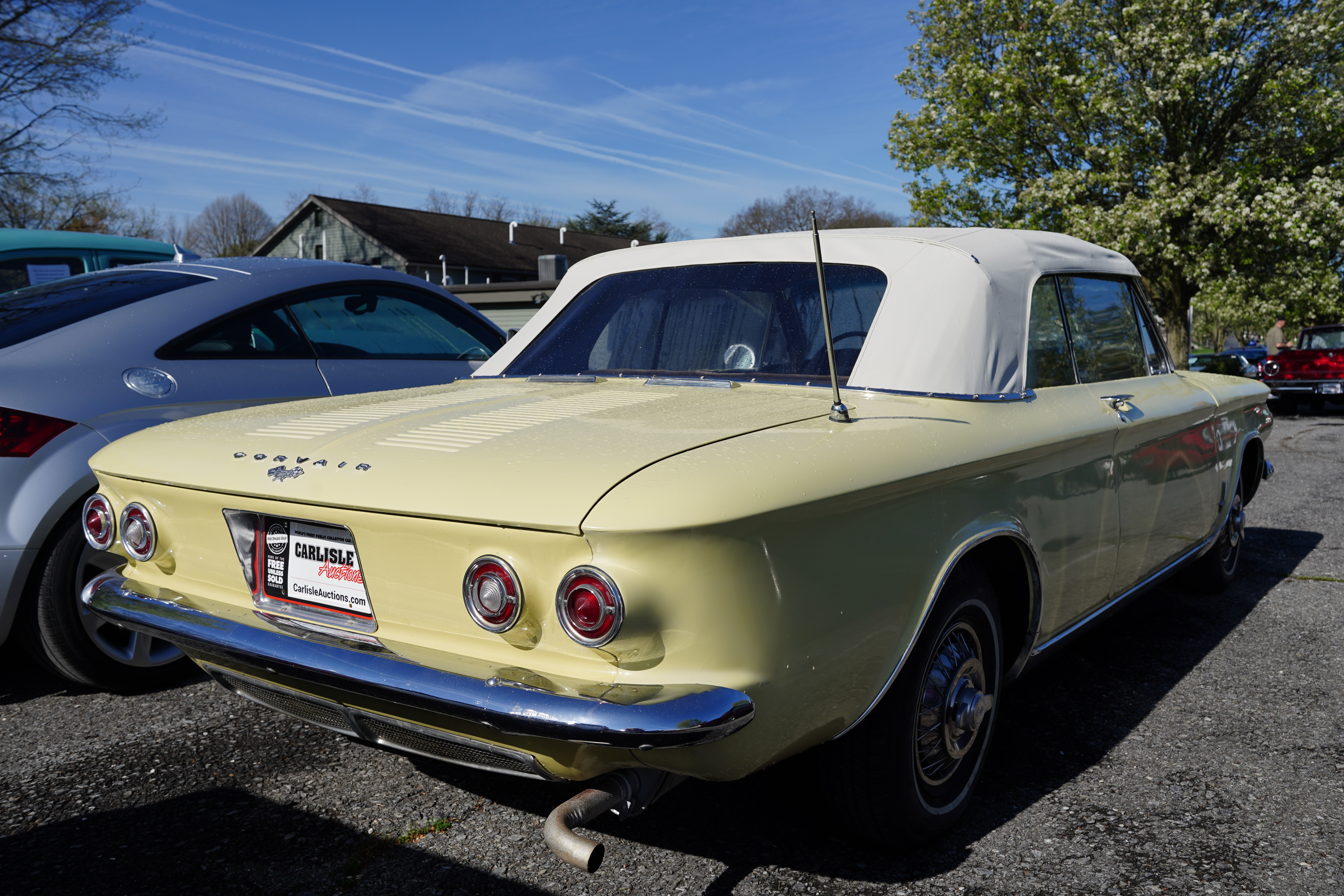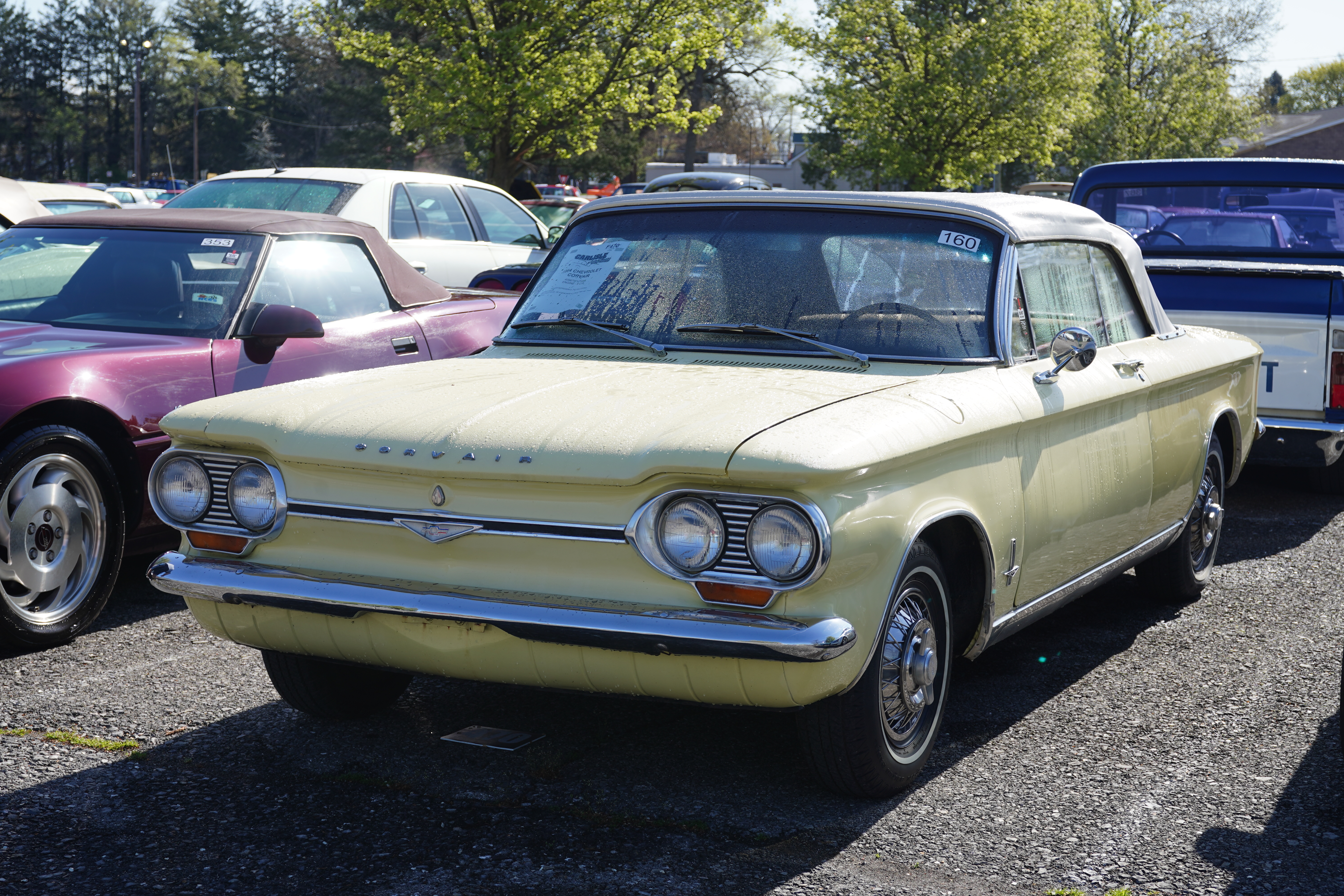 F470, 1964 Chevrolet Corvair convertible, yellow, white convertible top, wire wheel covers, whitewall tires, aftermarket brown velour seat upholstery, dash cover. Flat-6, 4-speed, claimed 67k miles.