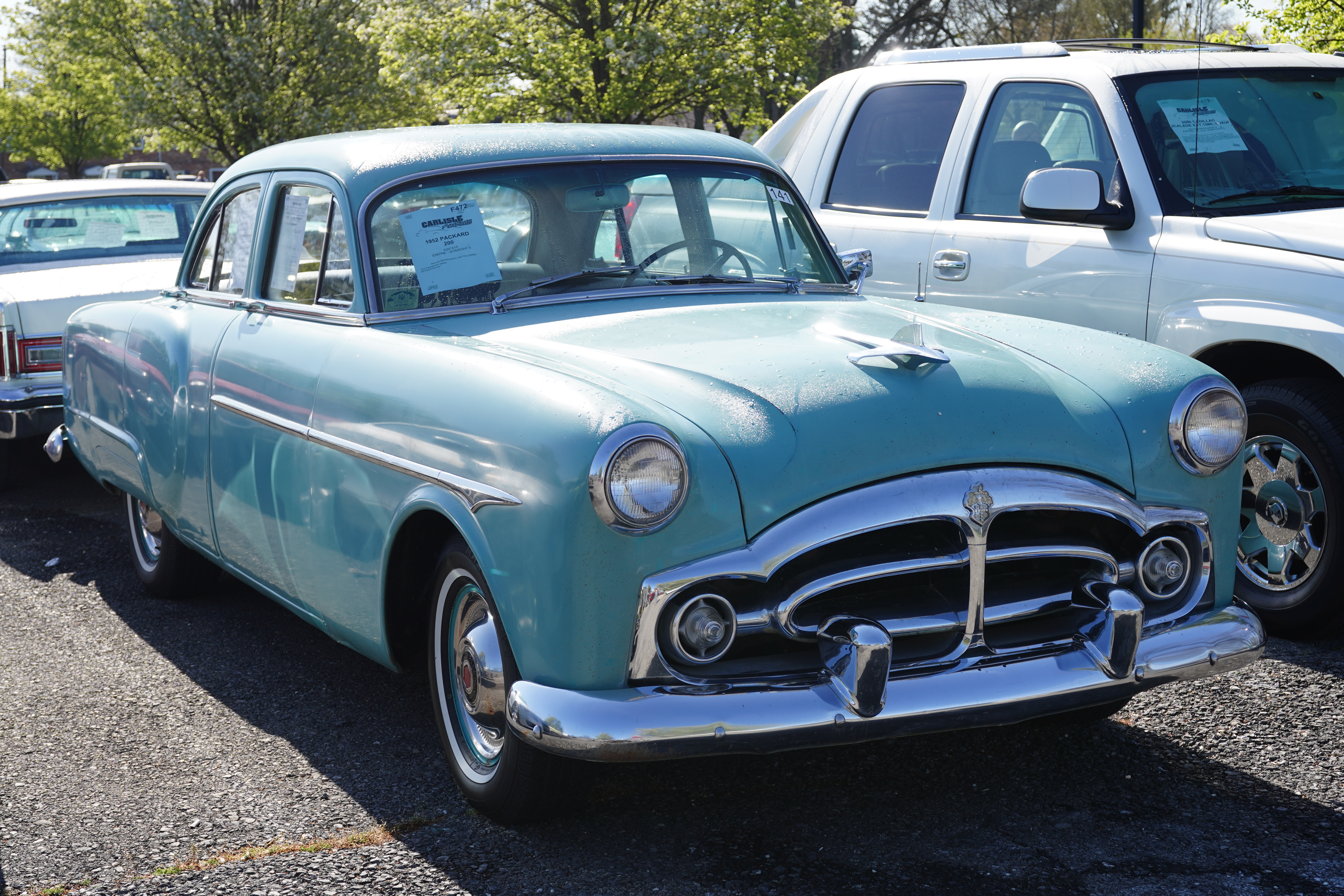 F472, 1952 Packard 200 4-door sedan. Light green, full wheel covers, whitewalls, fender skirts. Original selling dealer emblem on trunk lid. Interior is grey/black, odo reads 23k, no mileage claim. Straight-8 flathead, stick shift, 6 volt. Trunk shows a wide-white 7.60-15 bias-ply tire on spare wheel; how old is that tire?? Sign claims “all original survivor”.