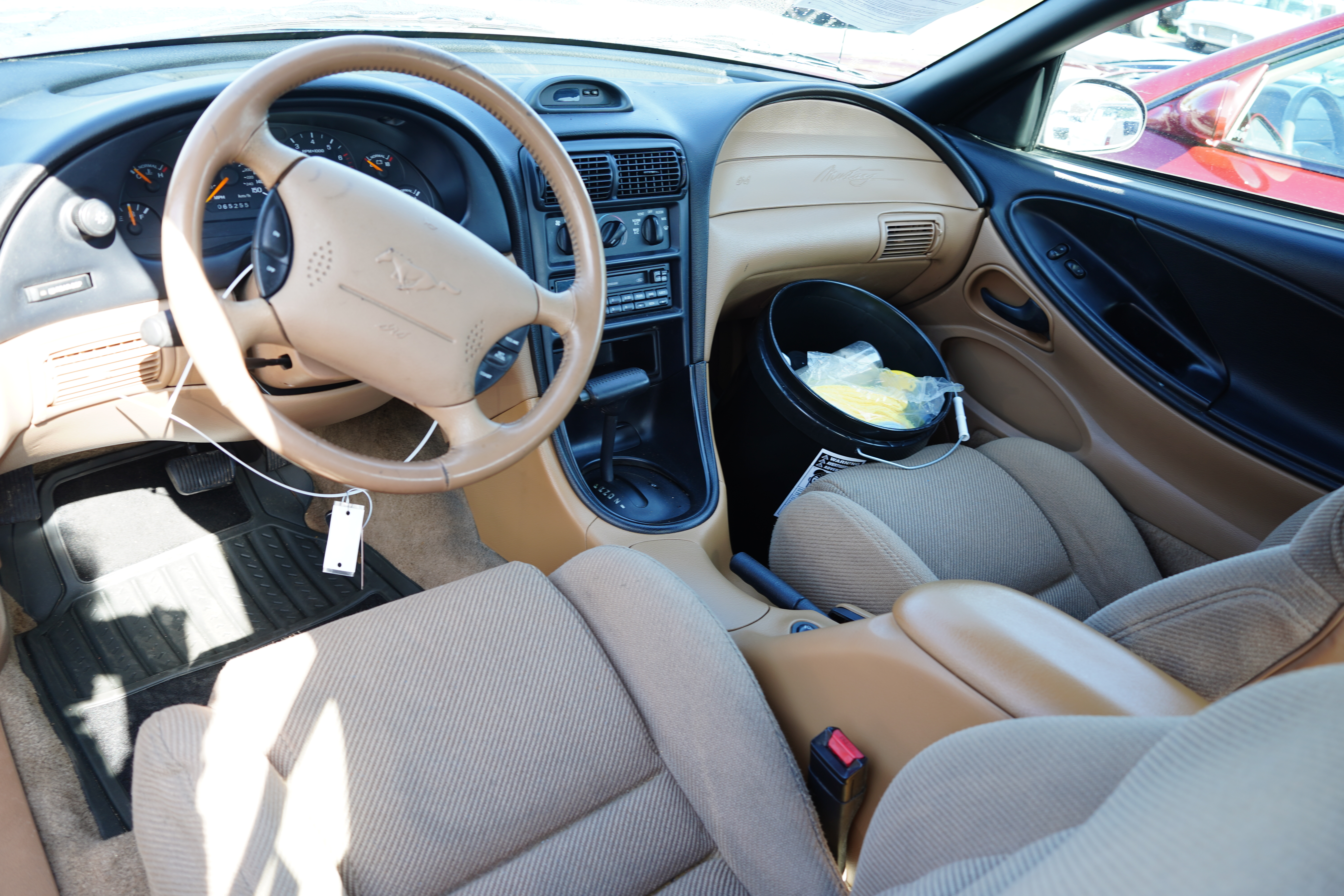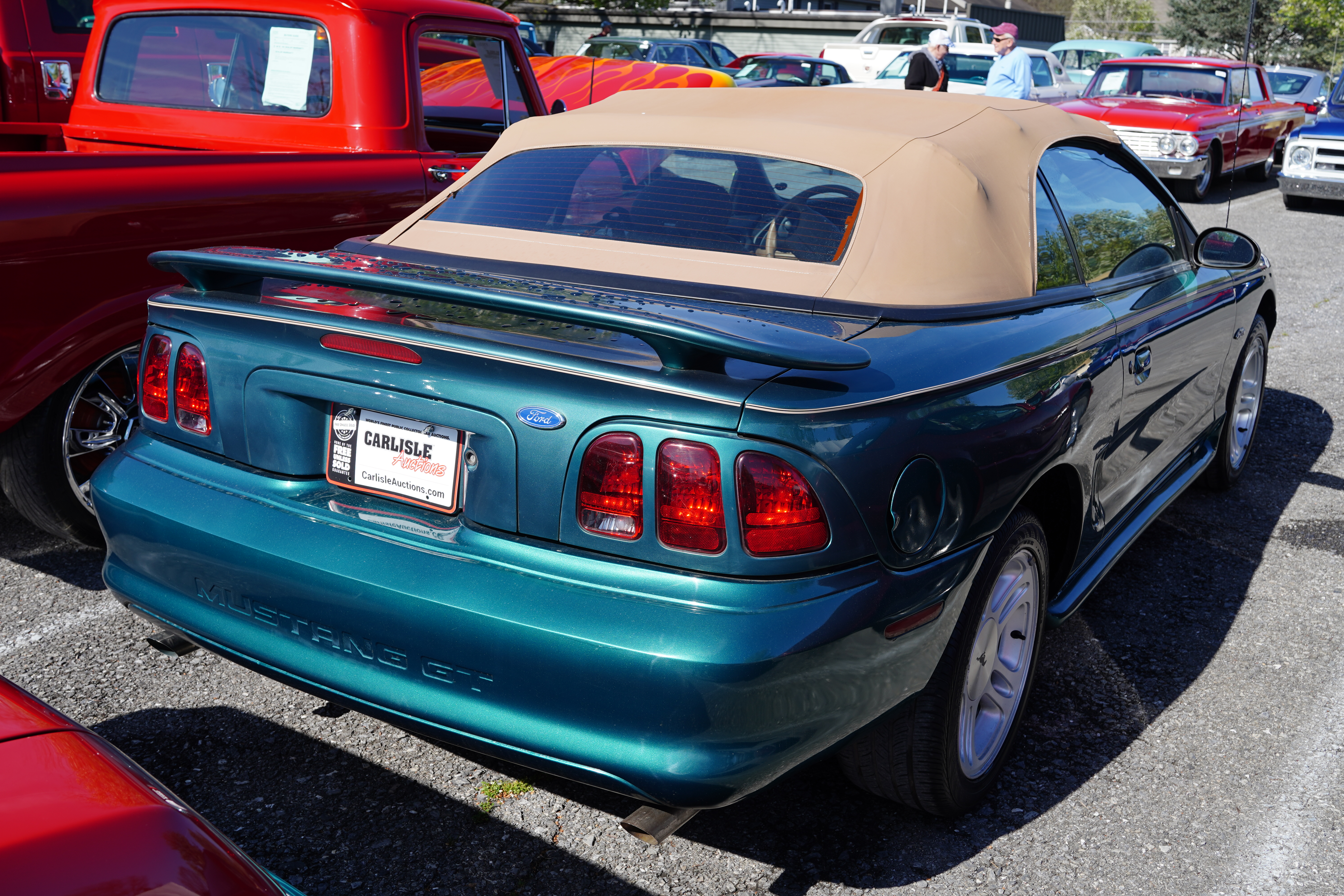 F492, 1996 Ford Mustang GT convertible, 4.6L V8, auto, sign claims 65k original miles (and 6-digit odo backs that up). Teal green, tan top, tan cloth interior. Blackwall tires on factory alloys, factory rear spoiler. A decent looking used car.