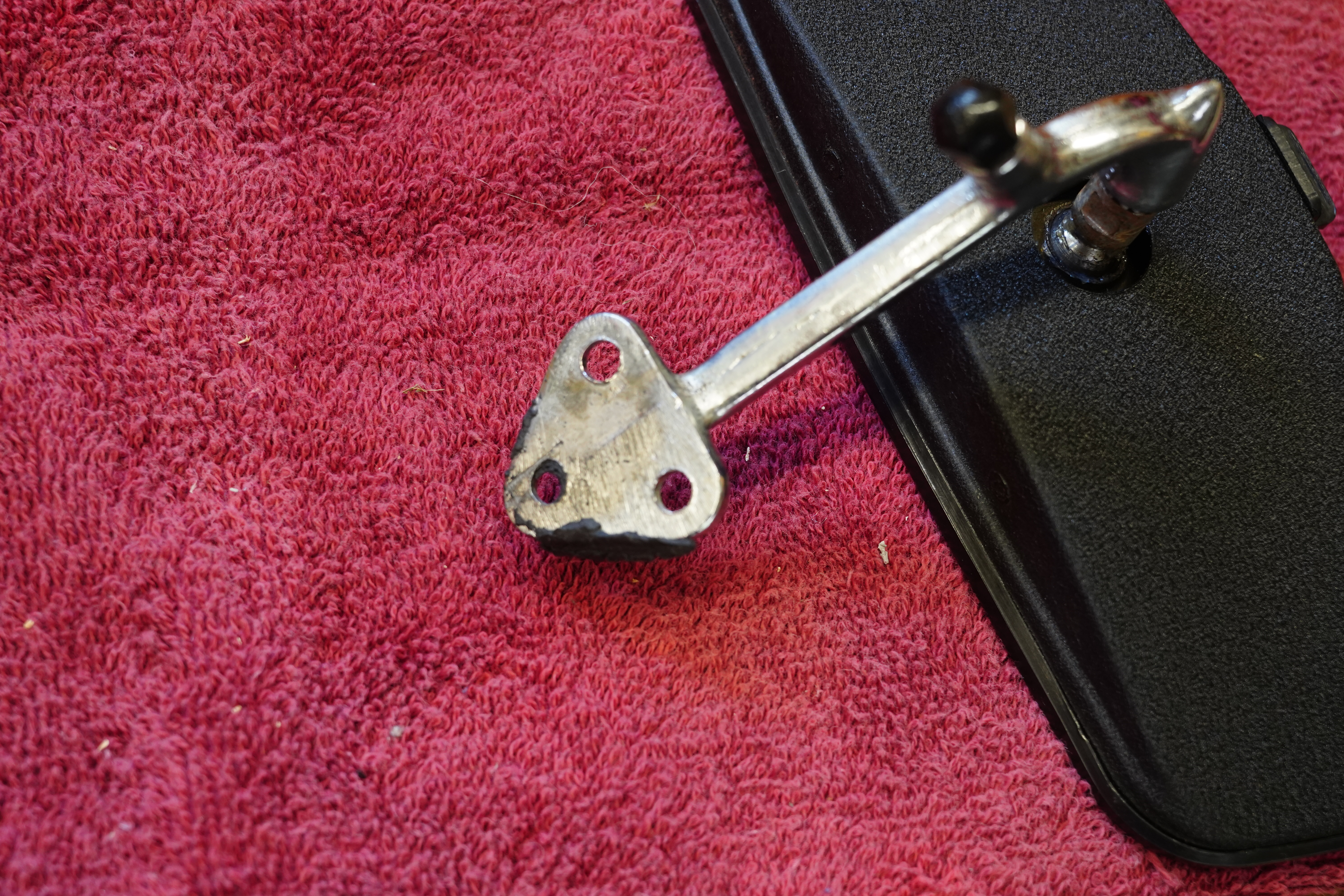 Putting the mirror on my workbench gave me much better access to the shaft and nut. This sub-assembly served two purposes: it allowed some adjustment of the total length of the shaft between the mirror and the glass, and it also allowed some adjustment in the amount of effort needed to move the mirror.