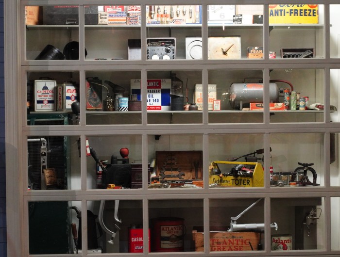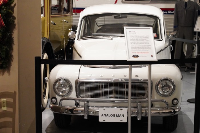 While wandering around the bottom floor (there are 3 levels), a Museum employee engaged with us and offered to take us back into a work area normally off-limits to the public. There, we saw some vehicles being prepped for their turn in the spotlight, and also learned that a regular troop of volunteers makes their way to the Museum to lend a helping hand with the cars. It sounded to this writer like a possible future activity in which to participate.