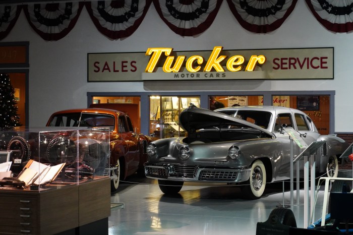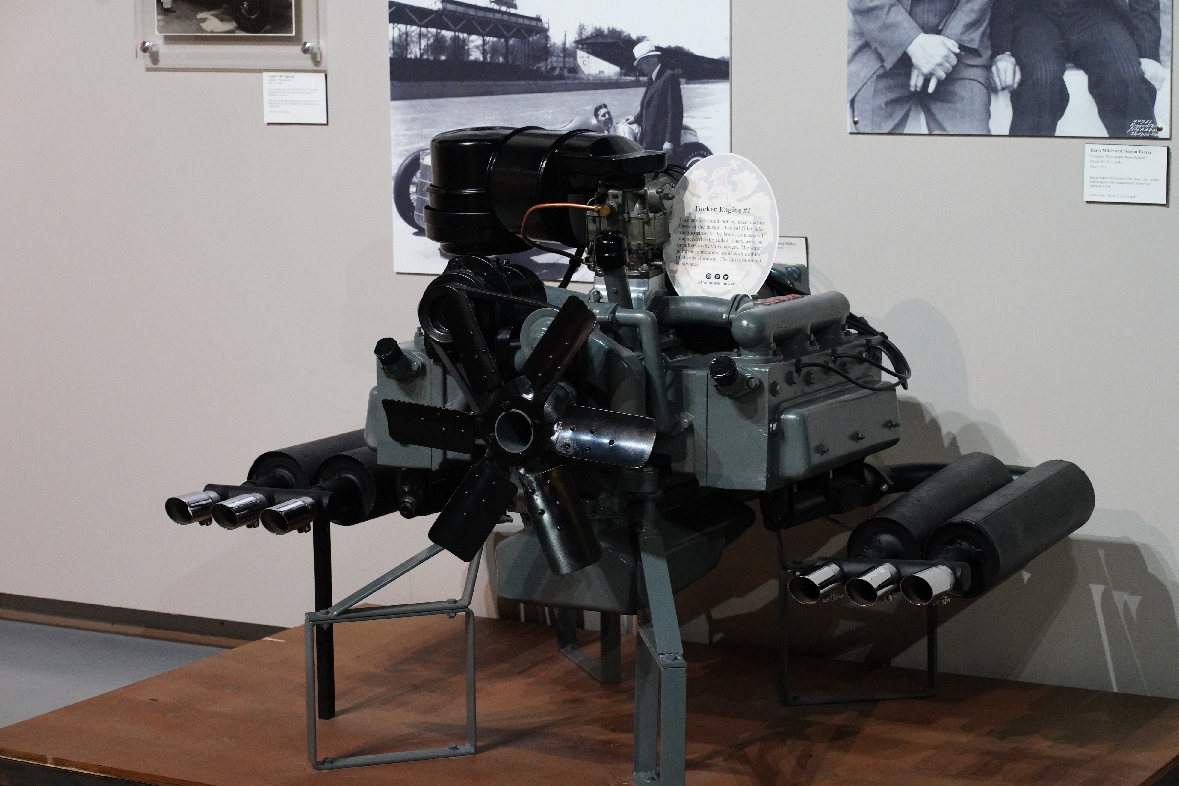 Engines comprise a large part of the display. Tucker experimented with many different ideas before deciding on a water-cooler flat-6 engine. The engine in red is an experimental engine with hydraulically-operated valves. It looks like a service nightmare.