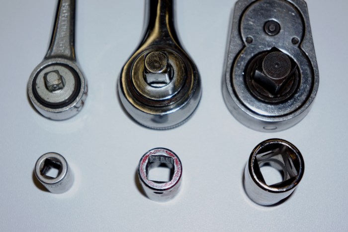 - Ratchet wrenches: The drive end is on a ratchet, which allows you to swing the handle in an arc as small as 25 or 30 degrees and rotate the socket. The ratchet also makes quick work of running a fastener on or off. A lever in the head allows you to reverse the ratchet direction between clockwise (tighten) and counter-clockwise (loosen). Get two or three handle lengths in 3/8” drive to match your sockets. The shorter handles are handy in tight quarters. The longer handles give you leverage for stuck fittings.