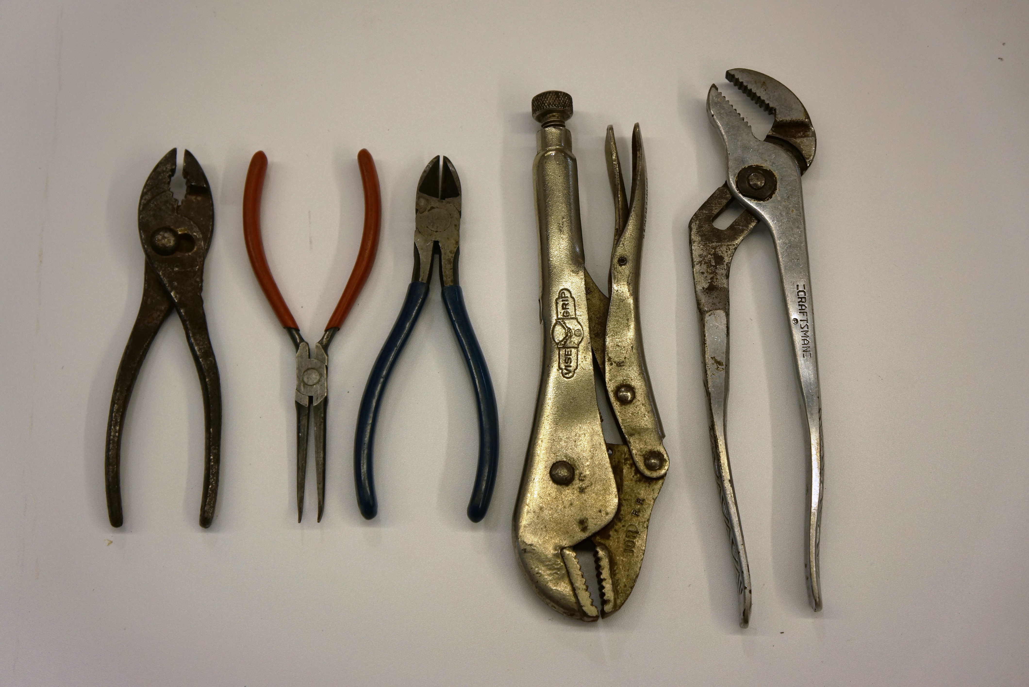 Pliers are necessary, but for starters, three or four will do. Besides the standard pair of pliers, get a pair of needle-nose, slip-joint (adjustable opening size), and locking pliers (known by the Vice-Grip brand name).