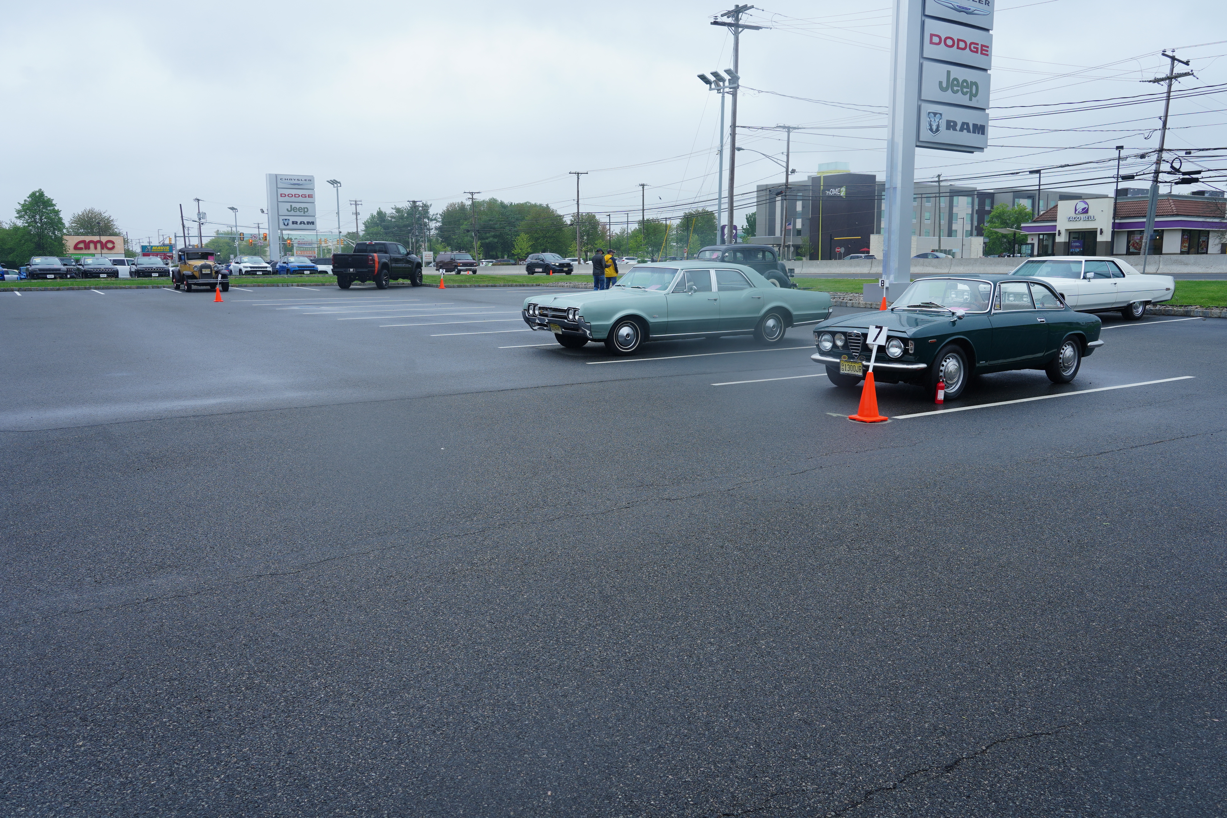 I had pre-registered my ’67 Alfa Romeo, and spent most of the week detailing it, so I was determined to make the 40-mile drive to East Hanover no matter what the forecast. As was done last year, the dealer on Route 10, Nielsen Chrysler/Dodge/Jeep/Ram, hosted the show for us, and shuffled their considerable inventory to make room. Upon my arrival, I was directed to park in the class I had registered for, HPOF (Historical Preservation of Original Features), which by the rules of the NJ Region is a “Do Not Judge” class. But it quickly became apparent that of the 17 or so classes, many would remain vacant, while the other classes had only one or two cars in attendance. Within a few minutes, the Chief Judge asked me if I would be willing to move my car to Class 7, where my Alfa would be the only judged car. I agreed with the request; there was another car in that Class (coincidentally belonging to the Chief Judge) but it was labeled as a “Do Not Judge” car.