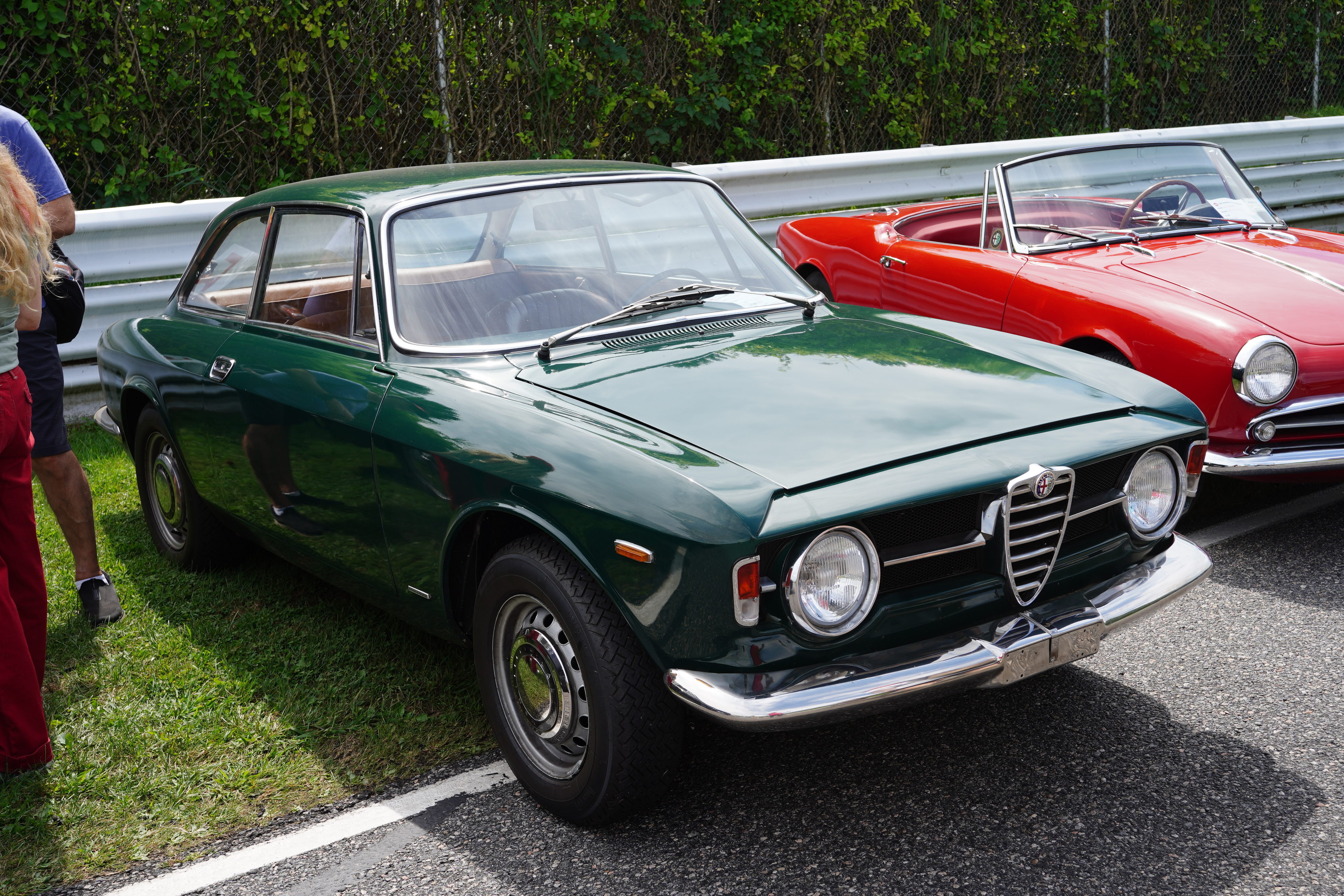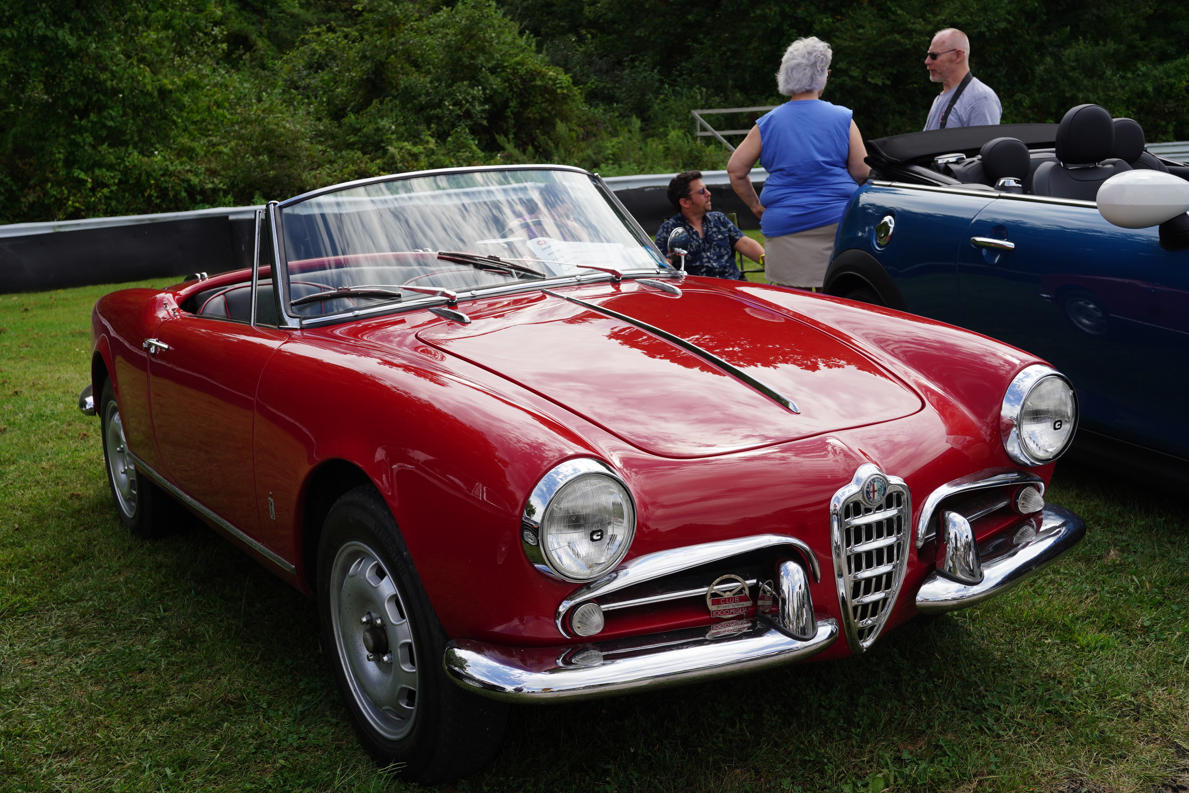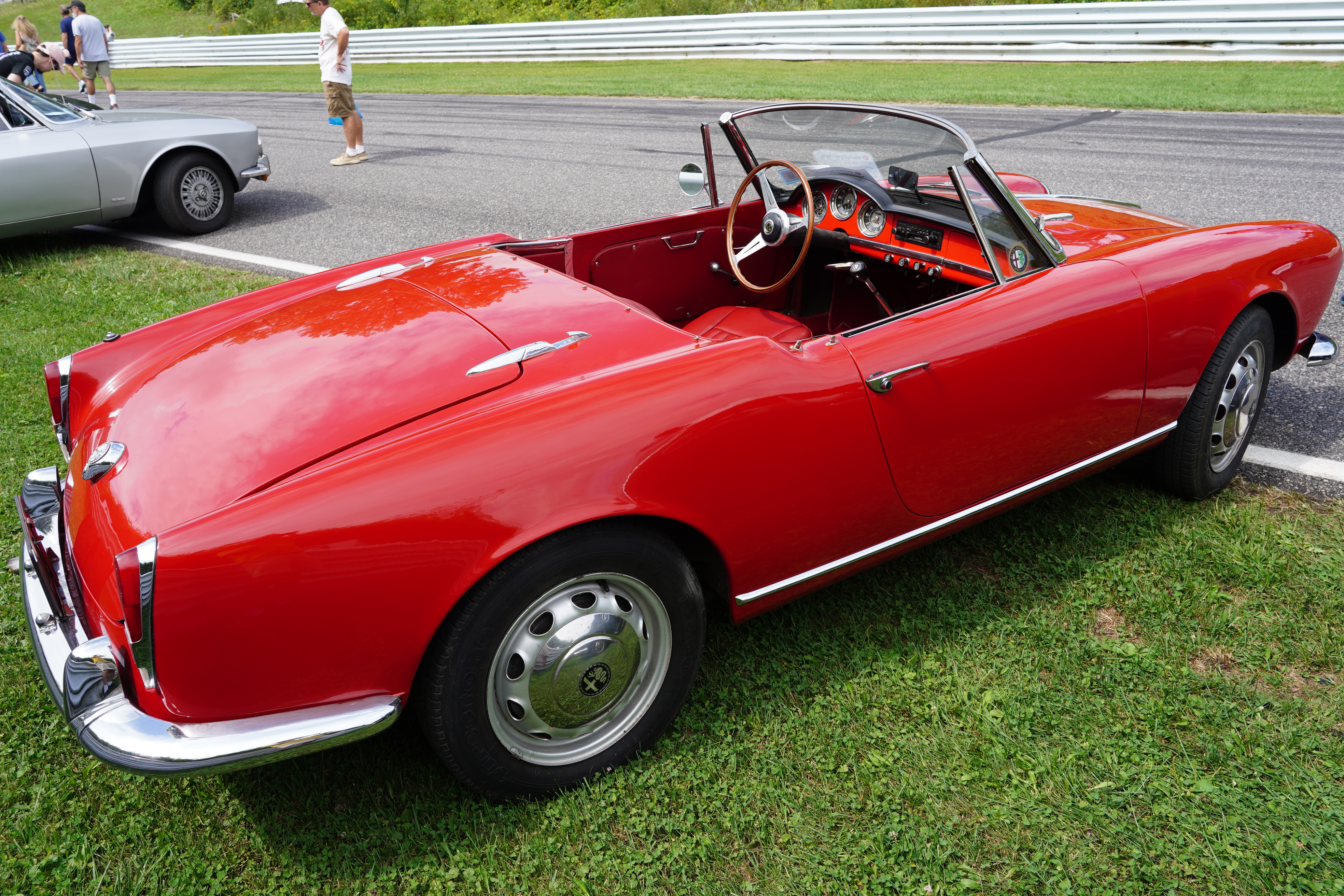 The “Juniors” (smaller engines, fewer features) were never officially imported into the U.S., so seeing one is a rare treat, although they are around. My ‘67 of course, is a Junior, privately imported in 1967. While I’ve seen a small handful of other Juniors at Alfa shows, I’ve never seen one in the same colors as mine, that is until I saw this 1968 model, one year newer. Other Junior owners have challenged certain features on my car, claiming that all Juniors have two-spoke wheels (mine is a three-spoke), and only one “Designed by Bertone” badge on the front fenders (I have two, one on each side). This Lime Rock Junior had the same steering wheel as my car but only one “Bertone” badge. Most interestingly, it had a grey dash without the vinyl “wood” applique which my car has. I’ve only seen the grey dash on pre-1967 coupes. I think, as others have hinted at, that the factory assembly process was simply not always that precise.