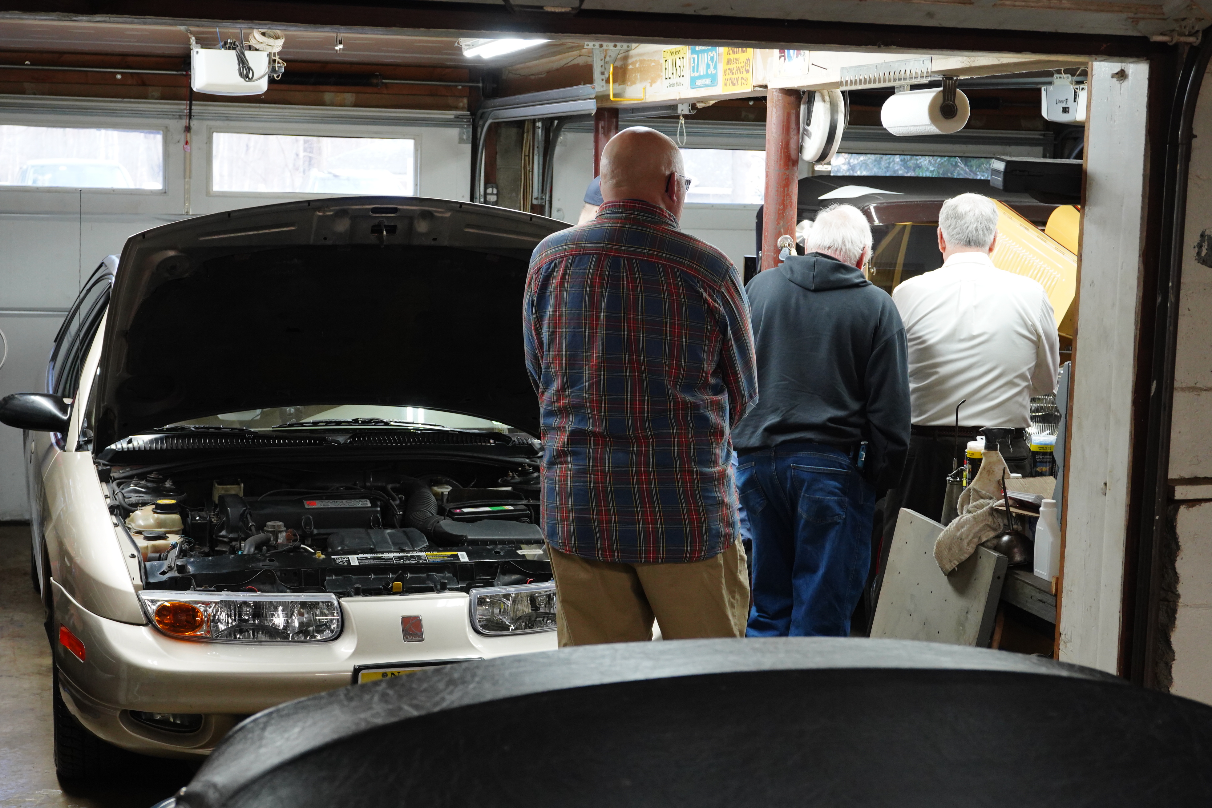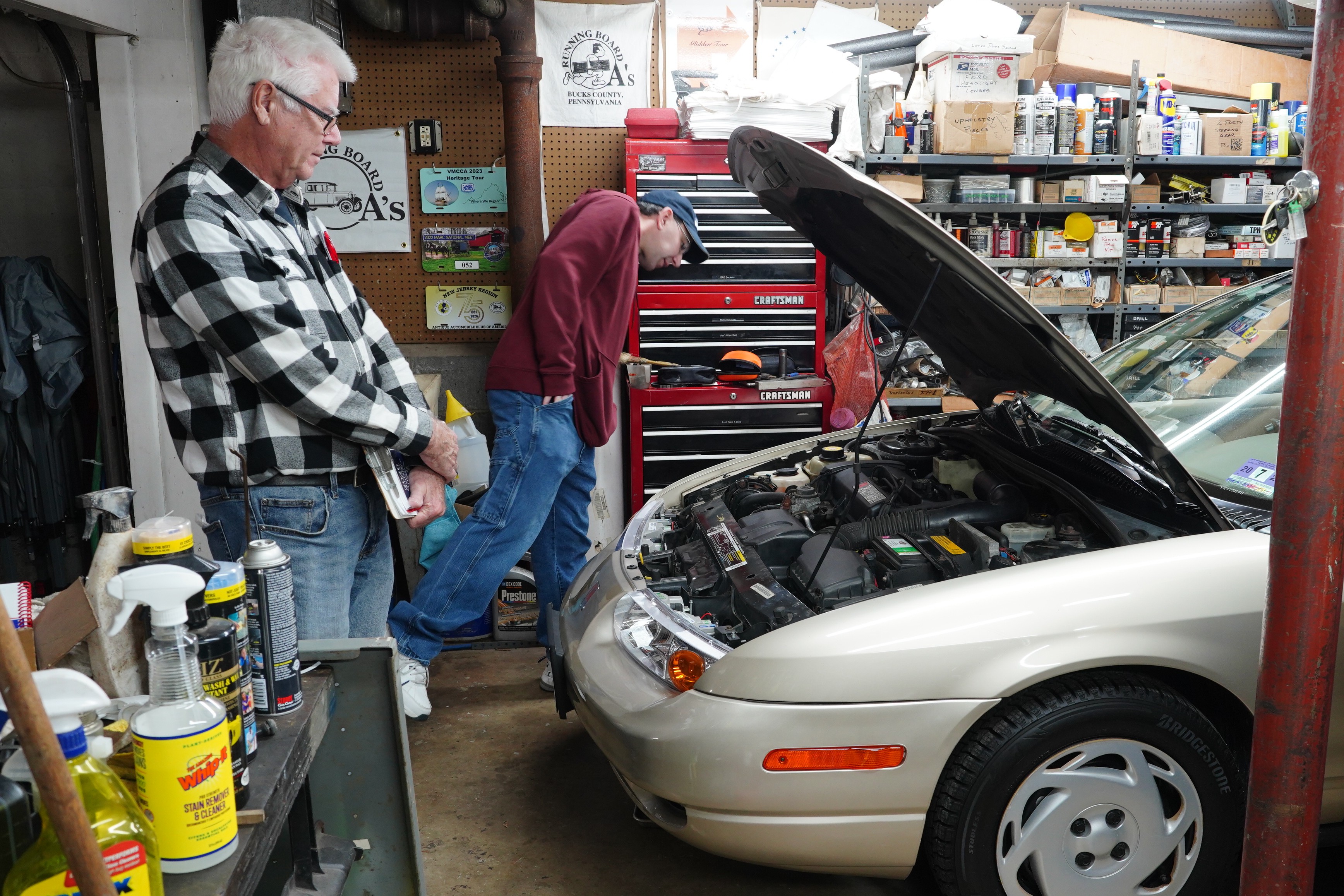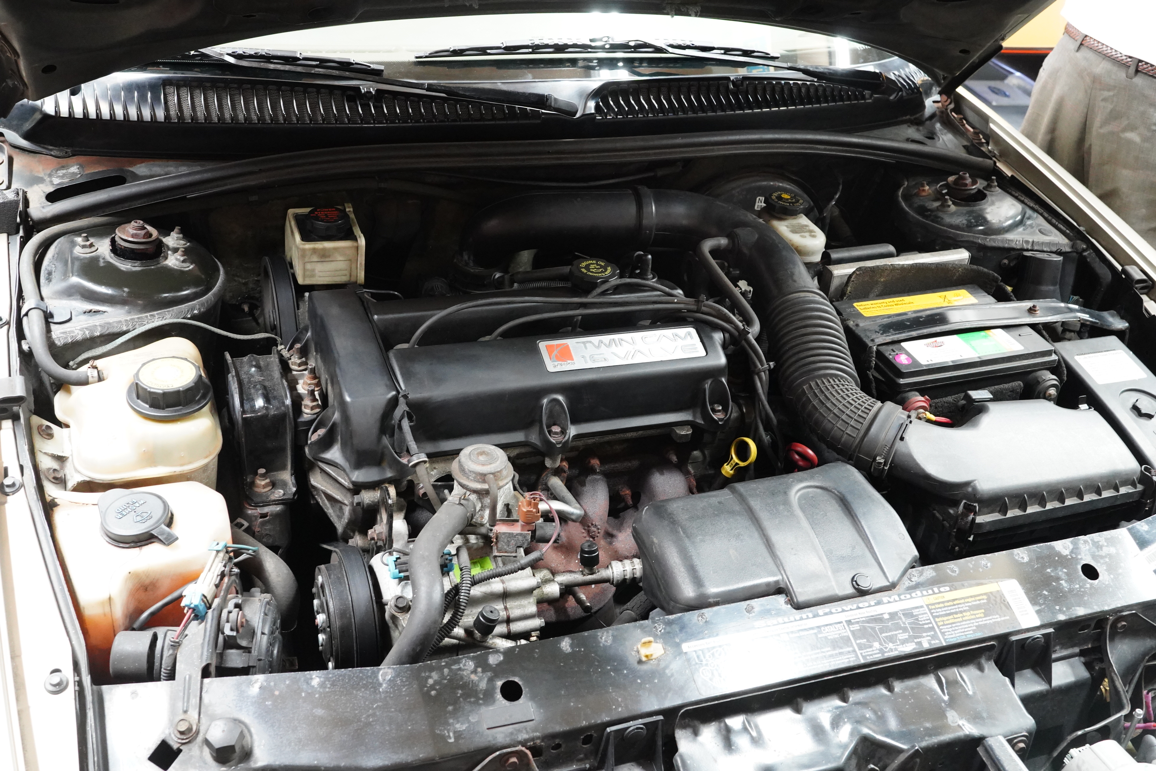Having a 2000 model-year car was important for this session, because AACA eligibility is based on a twenty-five-year rolling basis. Once a car becomes twenty-five years old, it is eligible for an AACA show. This year, “the class of 2001” will be newly allowed to attend. Dick’s Saturn was an excellent car for training because most of the car nuts in attendance were not used to peering under the hood and seeing a transversely-mounted front wheel drive powertrain, and an engine compartment filled with lots of plastic covers and black boxes.