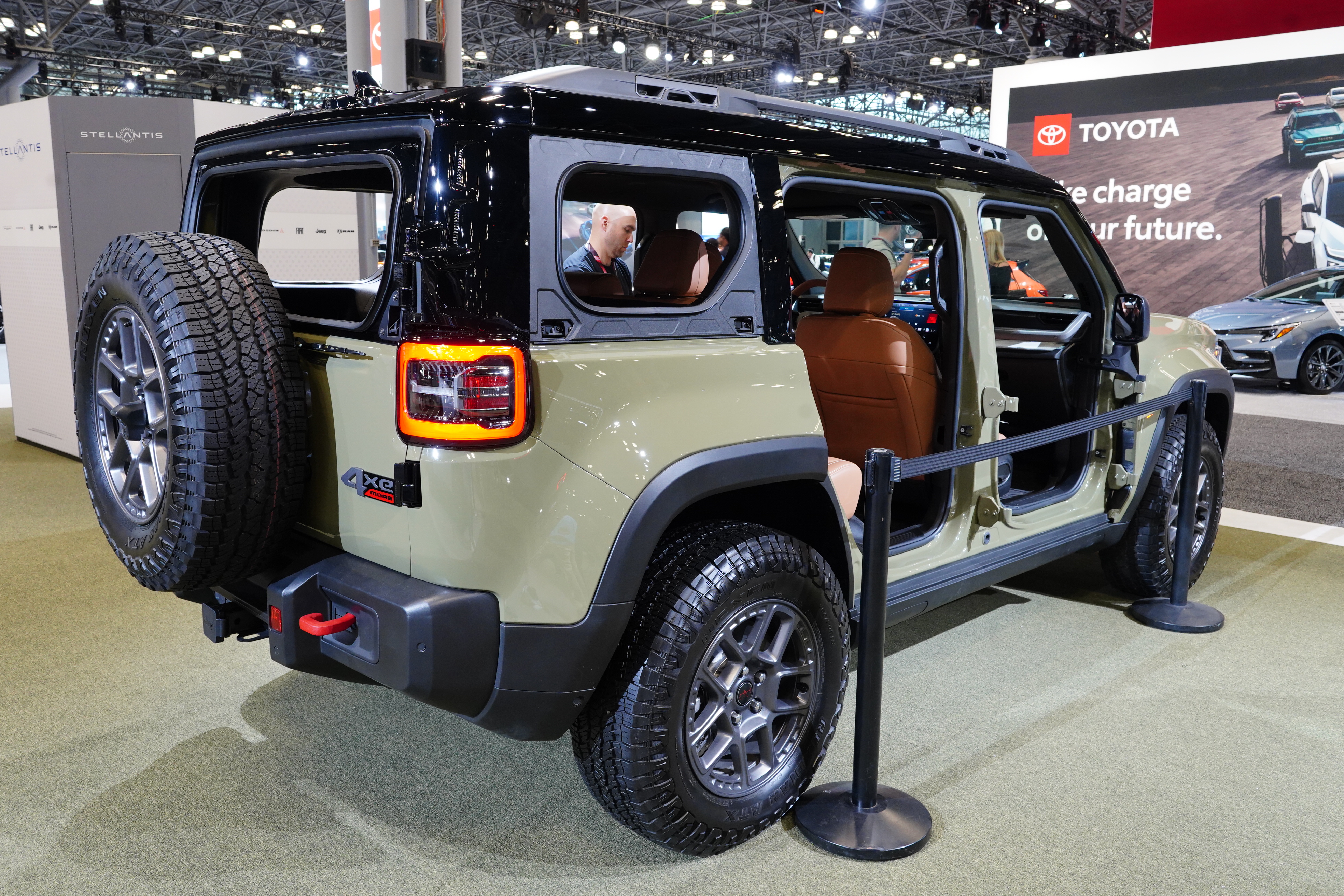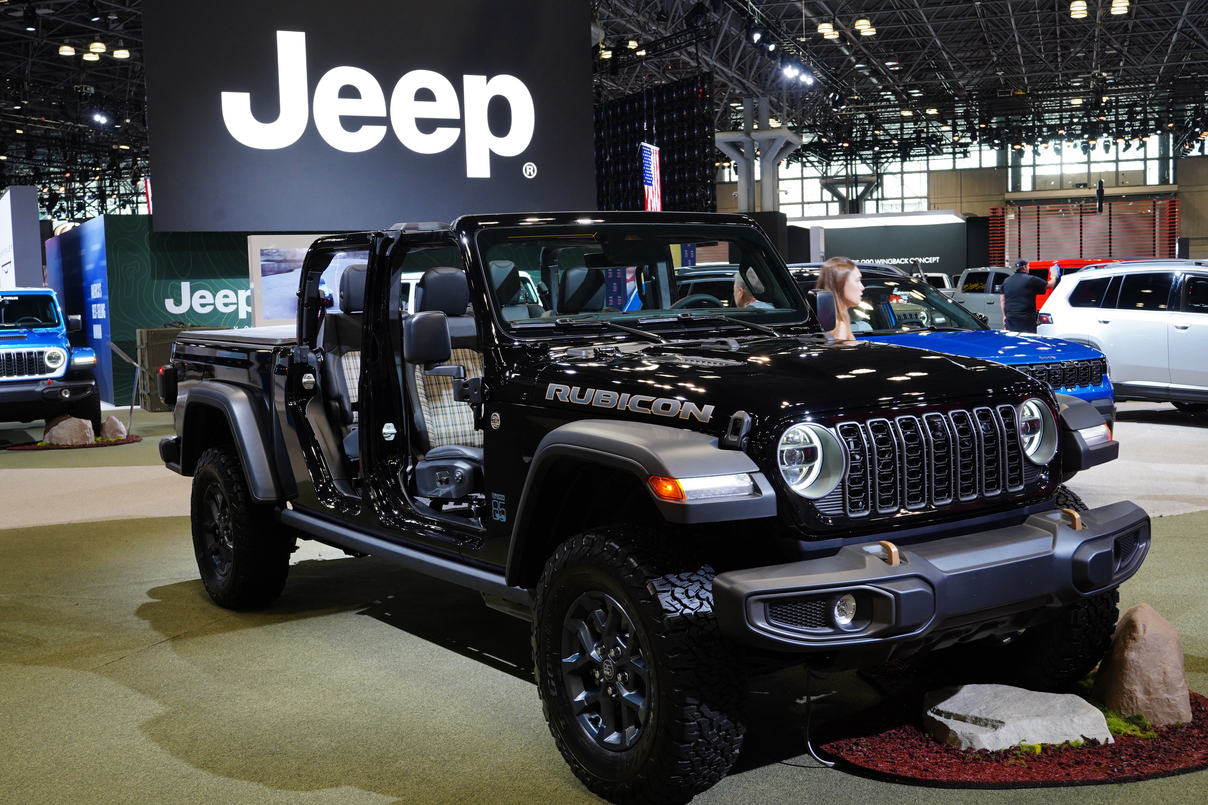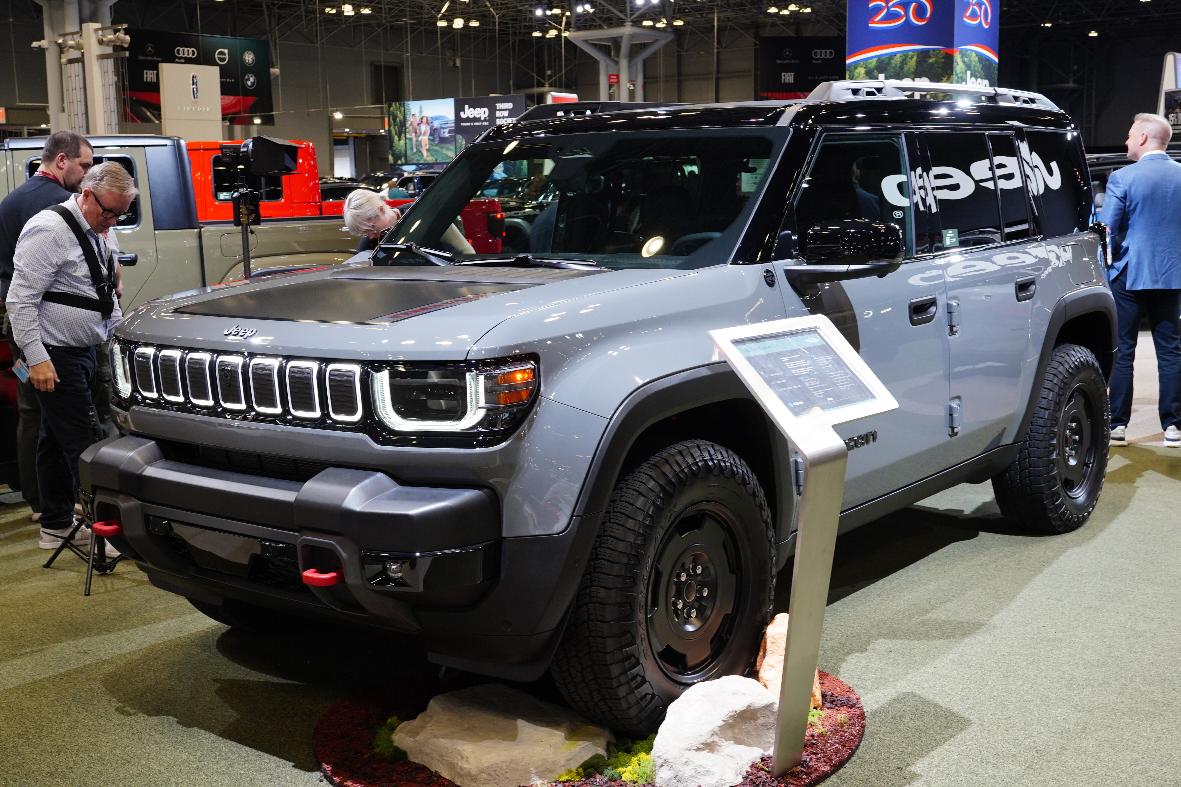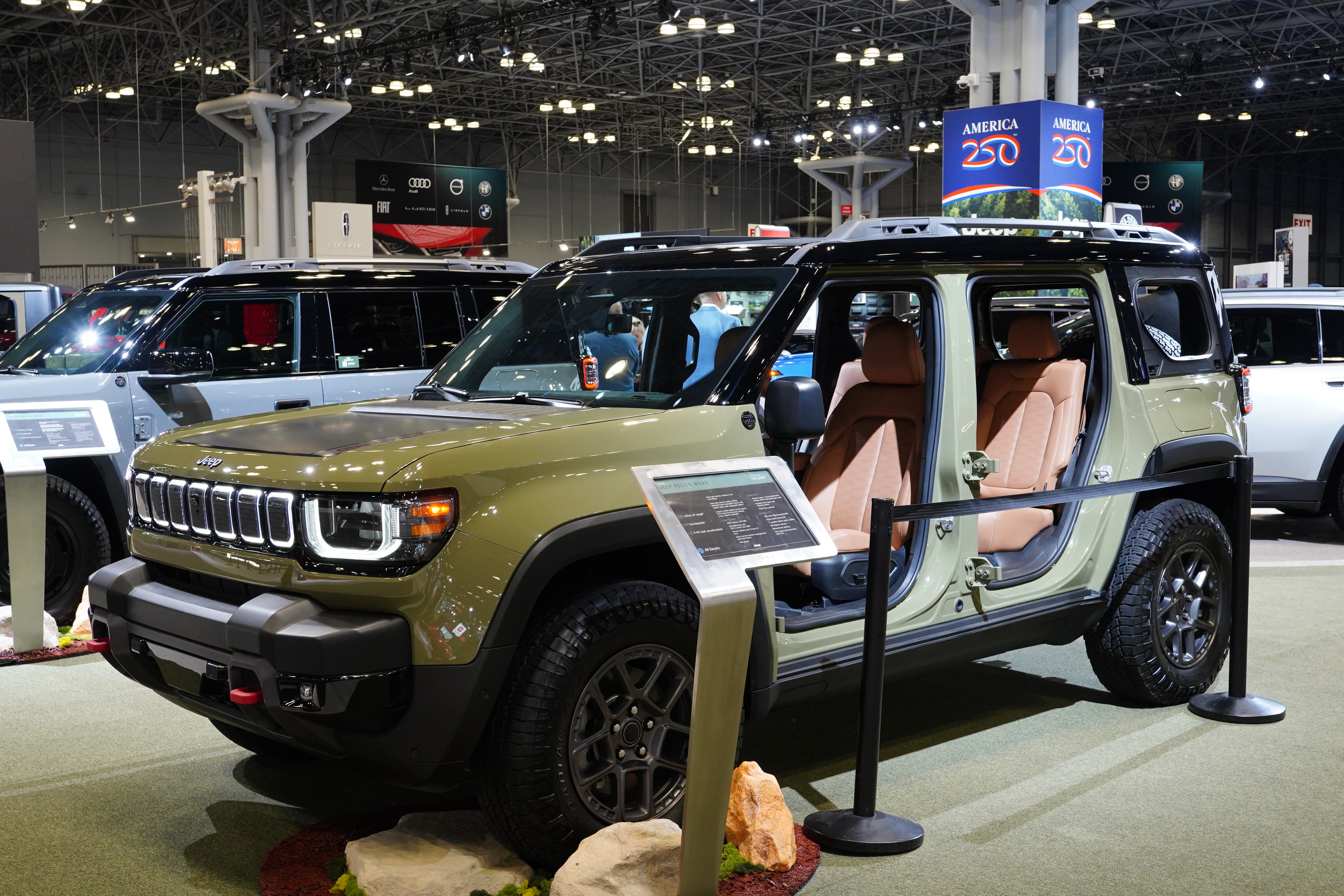 The Jeep display highlighted the Wrangler and its many variations. The new Recon Moab EV is covered separately below.