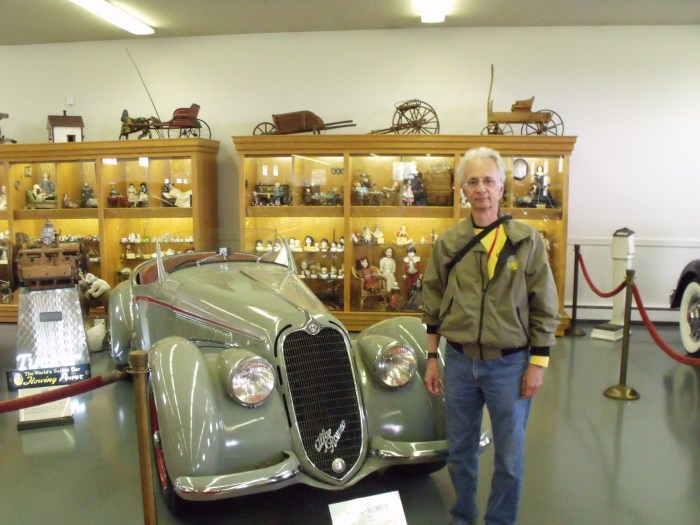 One of the many perks provided to us rally participants is the chance to visit car museums and collections, both public and private. This year we made it to the Owl’s Head Transportation Museum and the Bob Bahre Collection. Even though I had been to both on previous rallies, there always seems to be something new to take in. One such highlight was Bahre’s ‘30s-era unrestored Alfa Romeo 8C, and I had to pose with it.